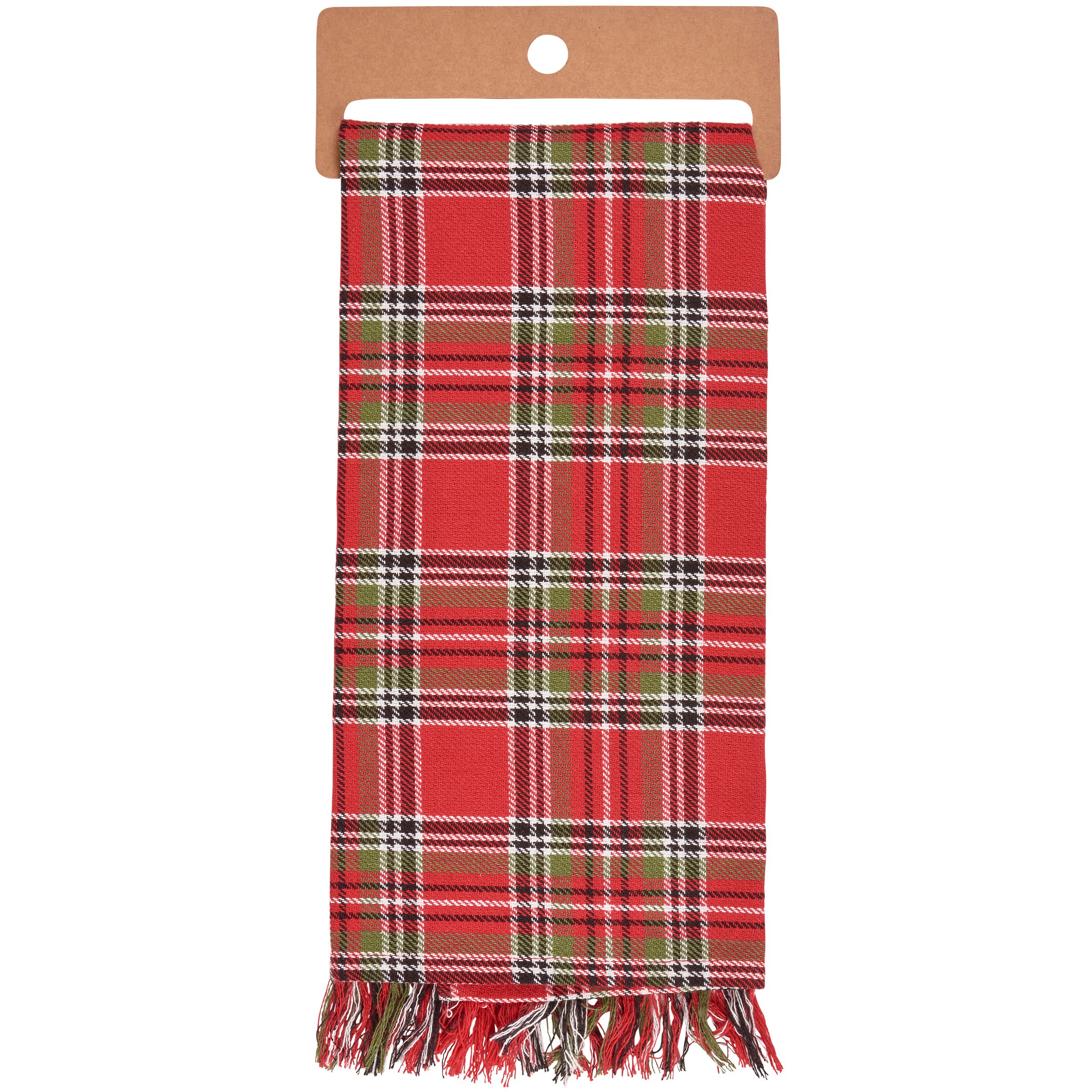 A cotton kitchen towel from our Christmas Collection featuring a stitched art panel with Christmas tartan plaid pattern all-over towel and frayed details on front trim. Art panel displays a highland cow wearing a Christmas wreath in a winter scene. Design is replicated from original artwork painted onto burlap canvas, giving the art a unique depth and texture. Our Christmas Highland kitchen towel is conveniently machine-washable for easy cleaning. Seasonal kitchen towel is packaged on a cardboard hanger with hole to easily hang on rack. A rustic Christmas-themed kitchen accessory perfect for seasonal use.