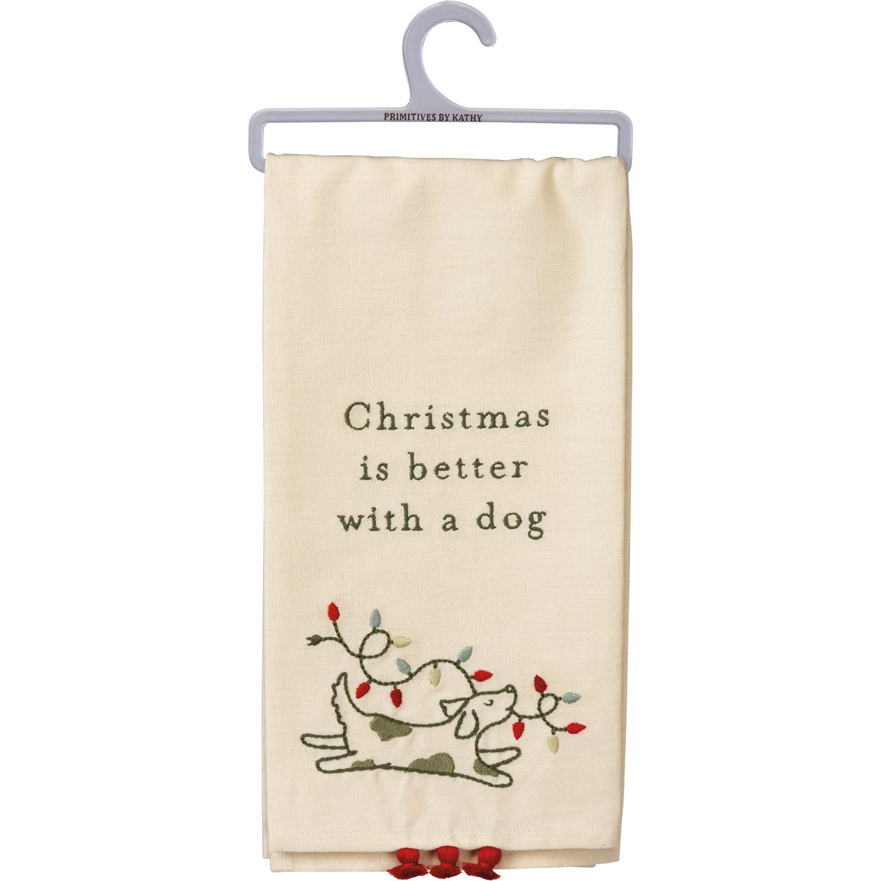 A cotton linen blend kitchen towel featuring an embroidered "Christmas Is Better With A Dog" sentiment with dog and string light designs. Includes tassel accents for added interest. Machine-washable.