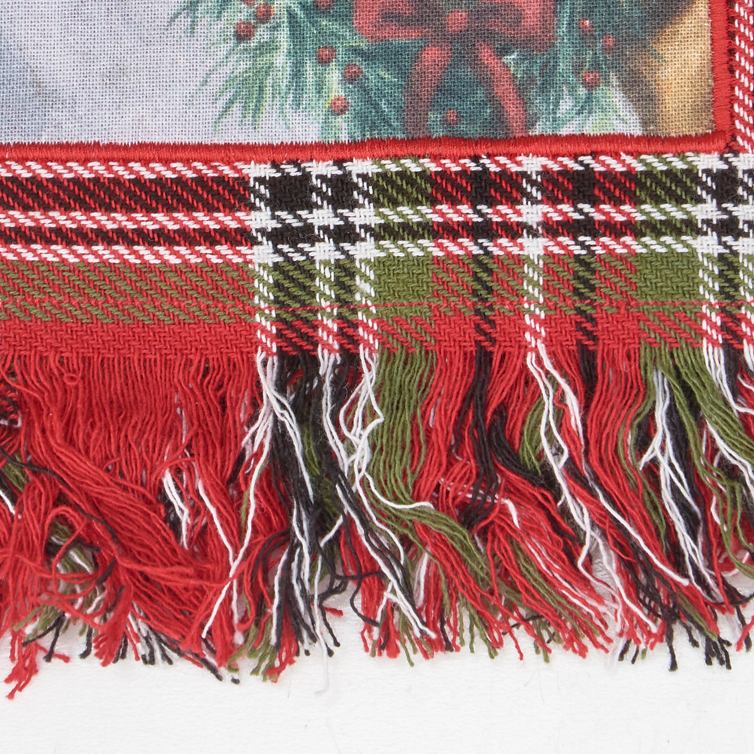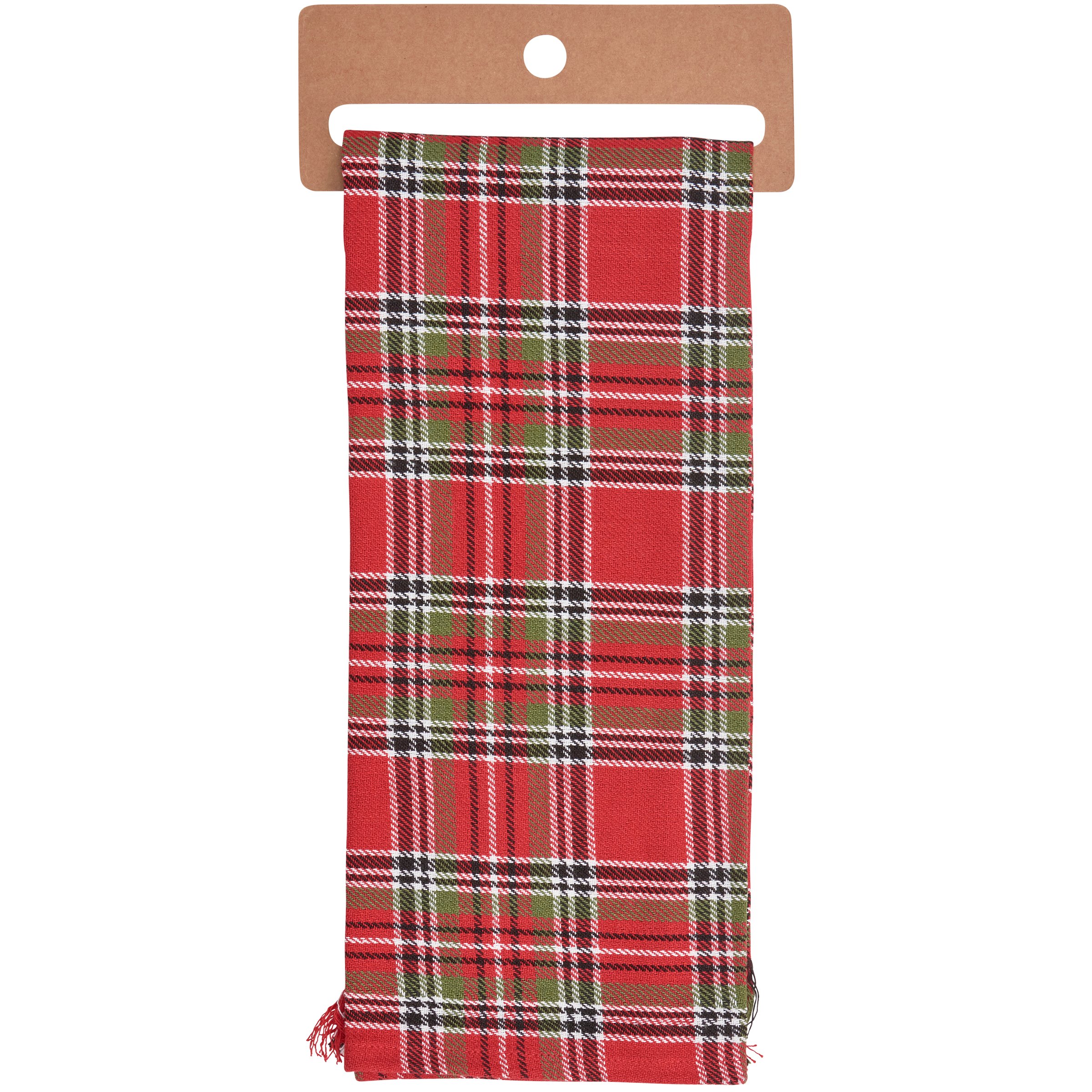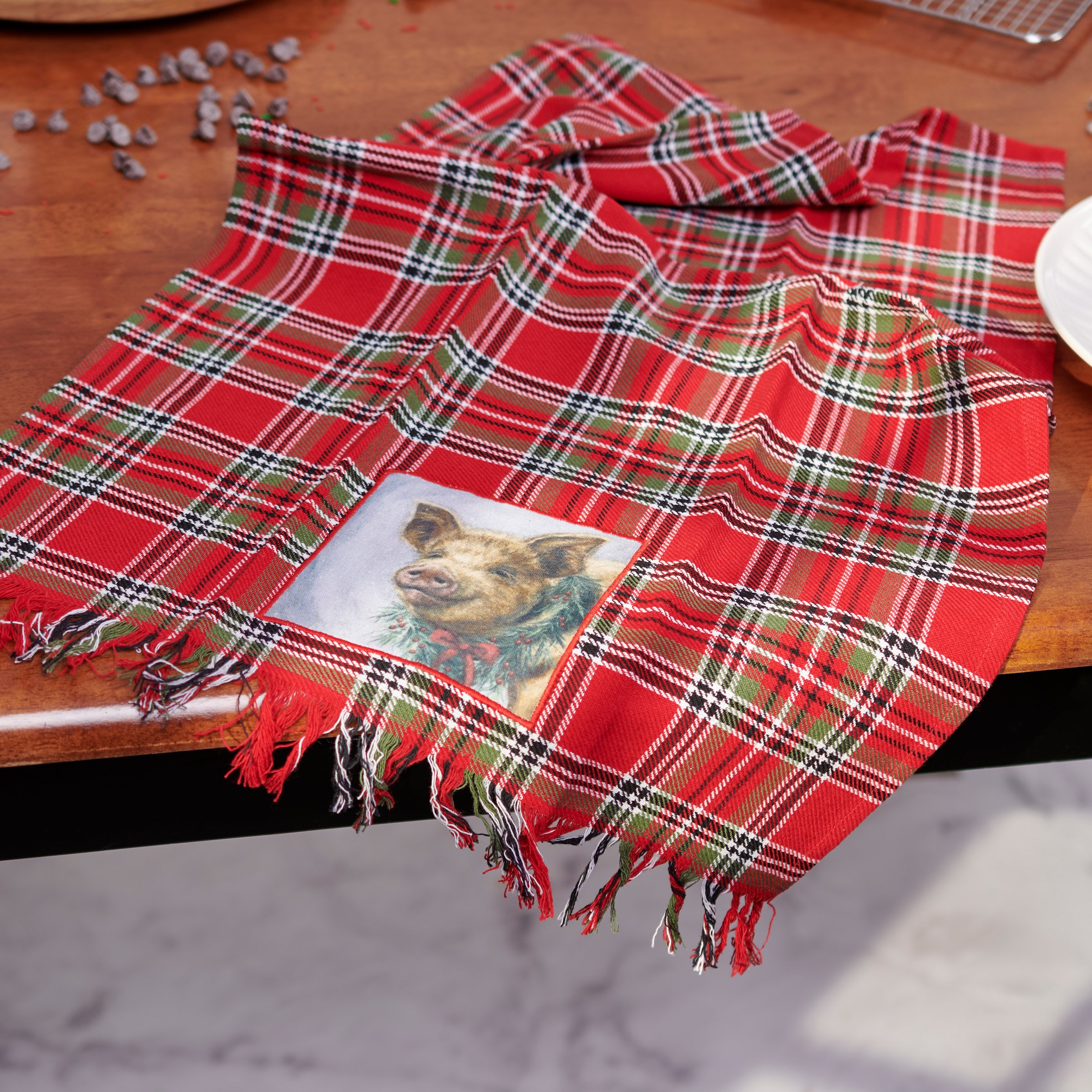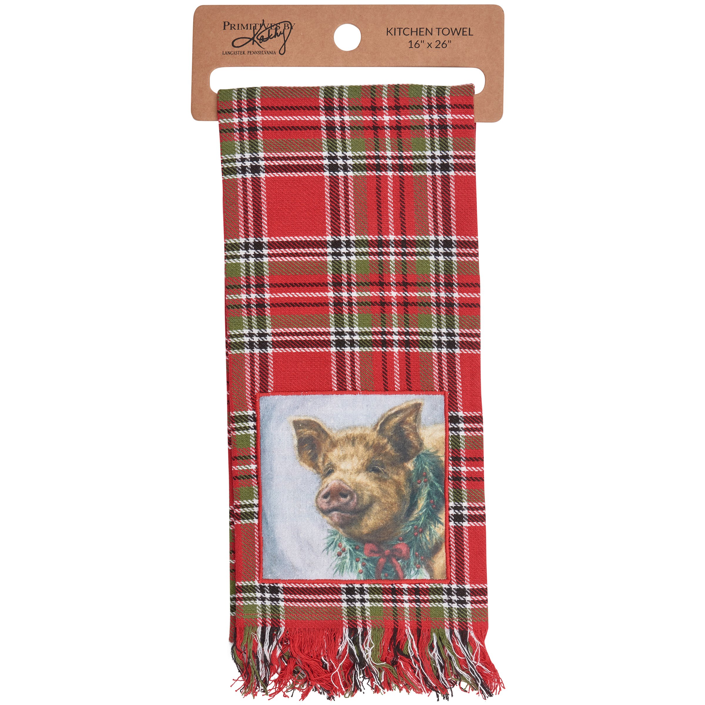 A cotton kitchen towel from our Christmas Collection featuring a stitched art panel with Christmas tartan plaid pattern all-over towel and frayed details on front trim. Art panel displays a pig wearing a Christmas wreath in a winter scene. Design is replicated from original artwork painted onto burlap canvas, giving the art a unique depth and texture. Our Christmas Pig kitchen towel is conveniently machine-washable for easy cleaning. Seasonal kitchen towel is packaged on a cardboard hanger with hole to easily hang on rack. A rustic Christmas-themed kitchen accessory perfect for seasonal use.