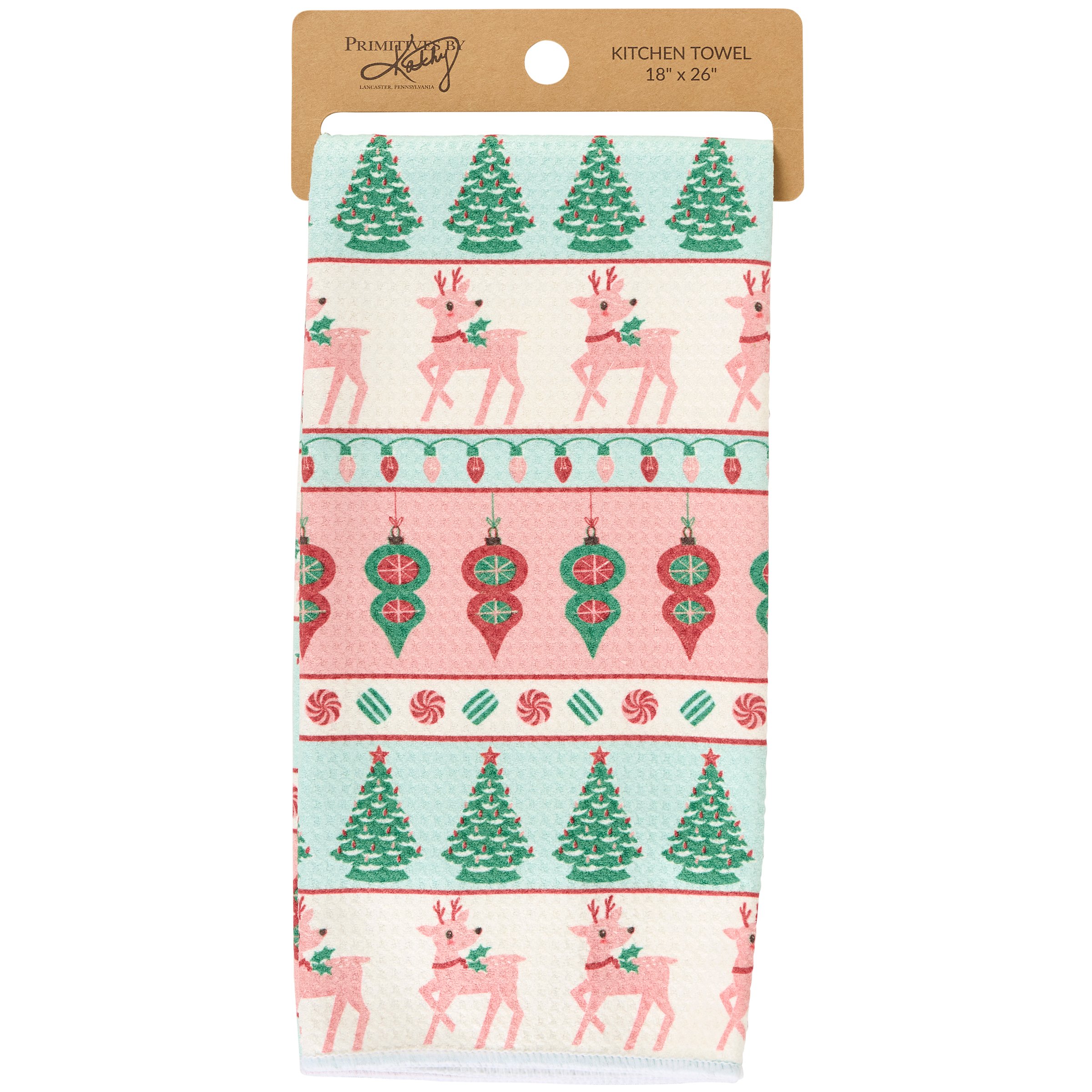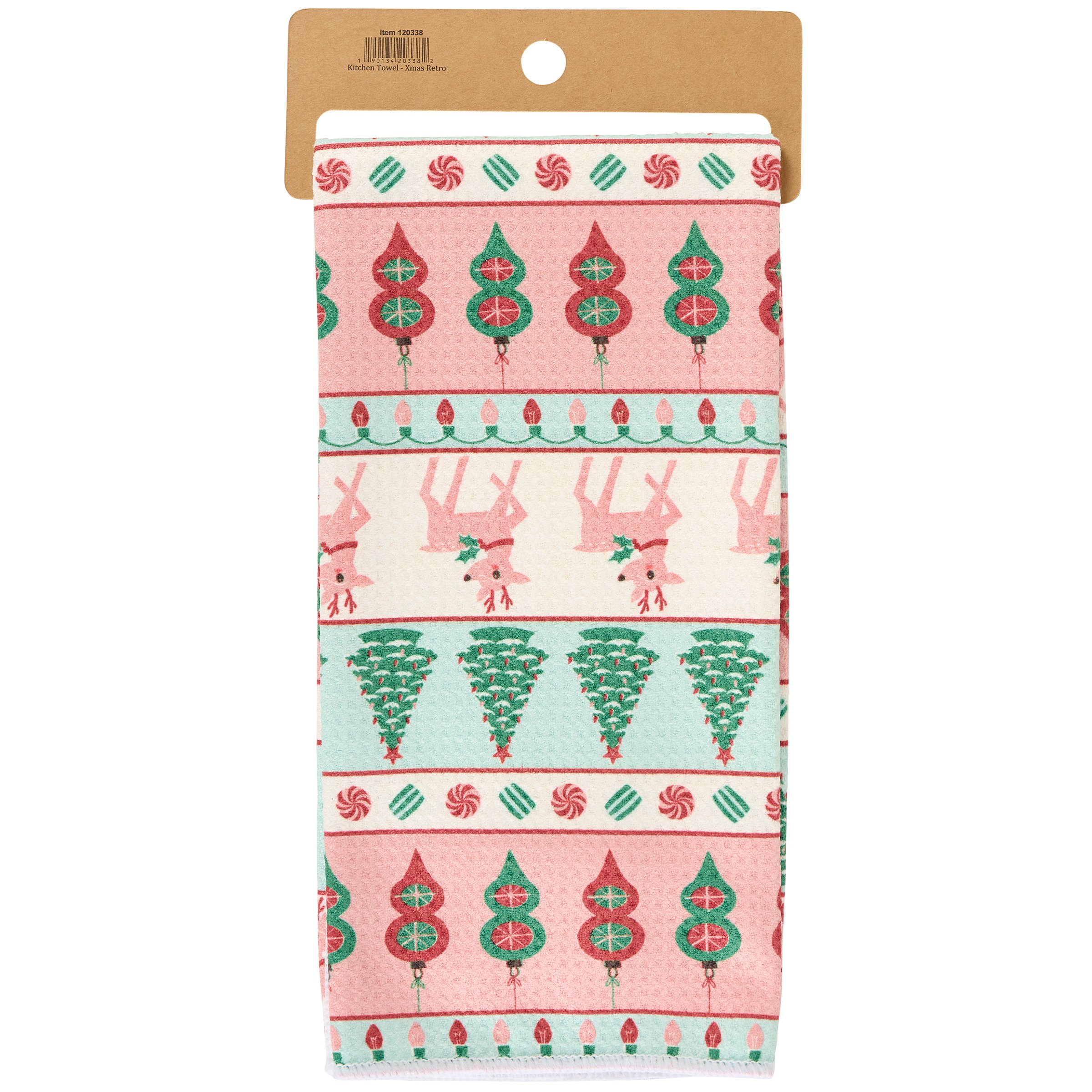A microfiber kitchen towel from our Christmas Collection displaying an all-over design of rows Christmas motif patterns in a retro pastel color palette including Christmas trees, reindeer, ornaments, and more. Our Christmas Retro kitchen towel is conveniently machine-washable for easy cleaning. Seasonal kitchen towel is packaged on a cardboard hanger with hole to easily display on rack. A retro pastel Christmas kitchen accessory perfect for seasonal use.