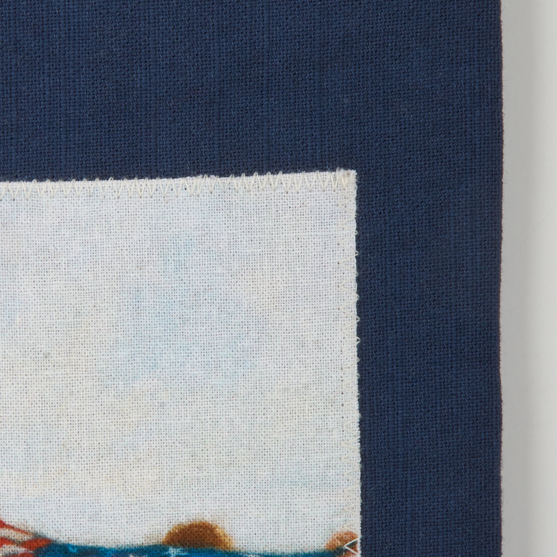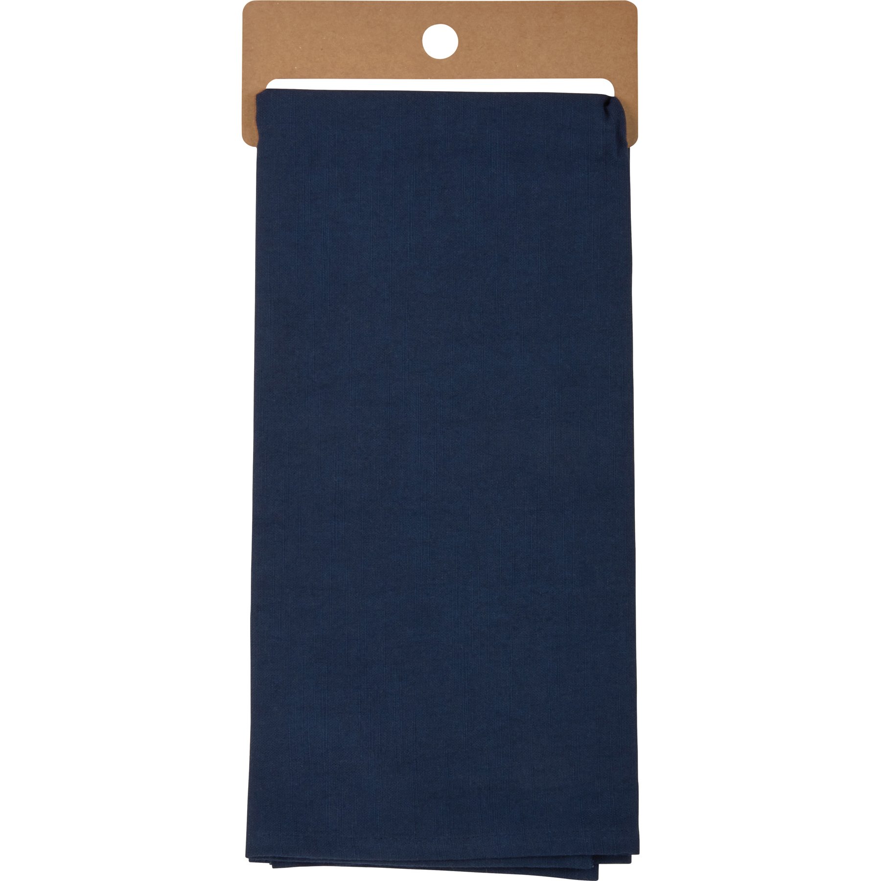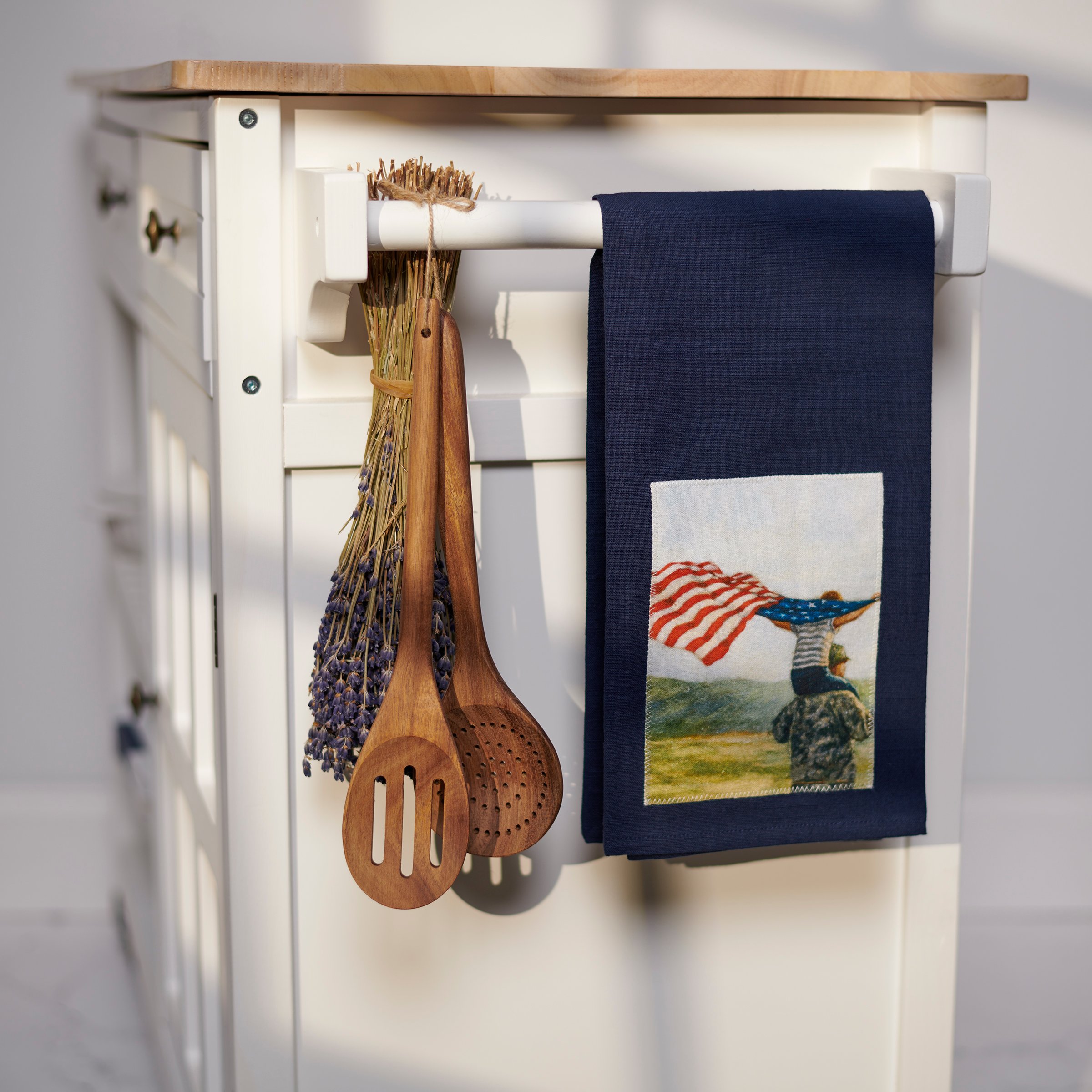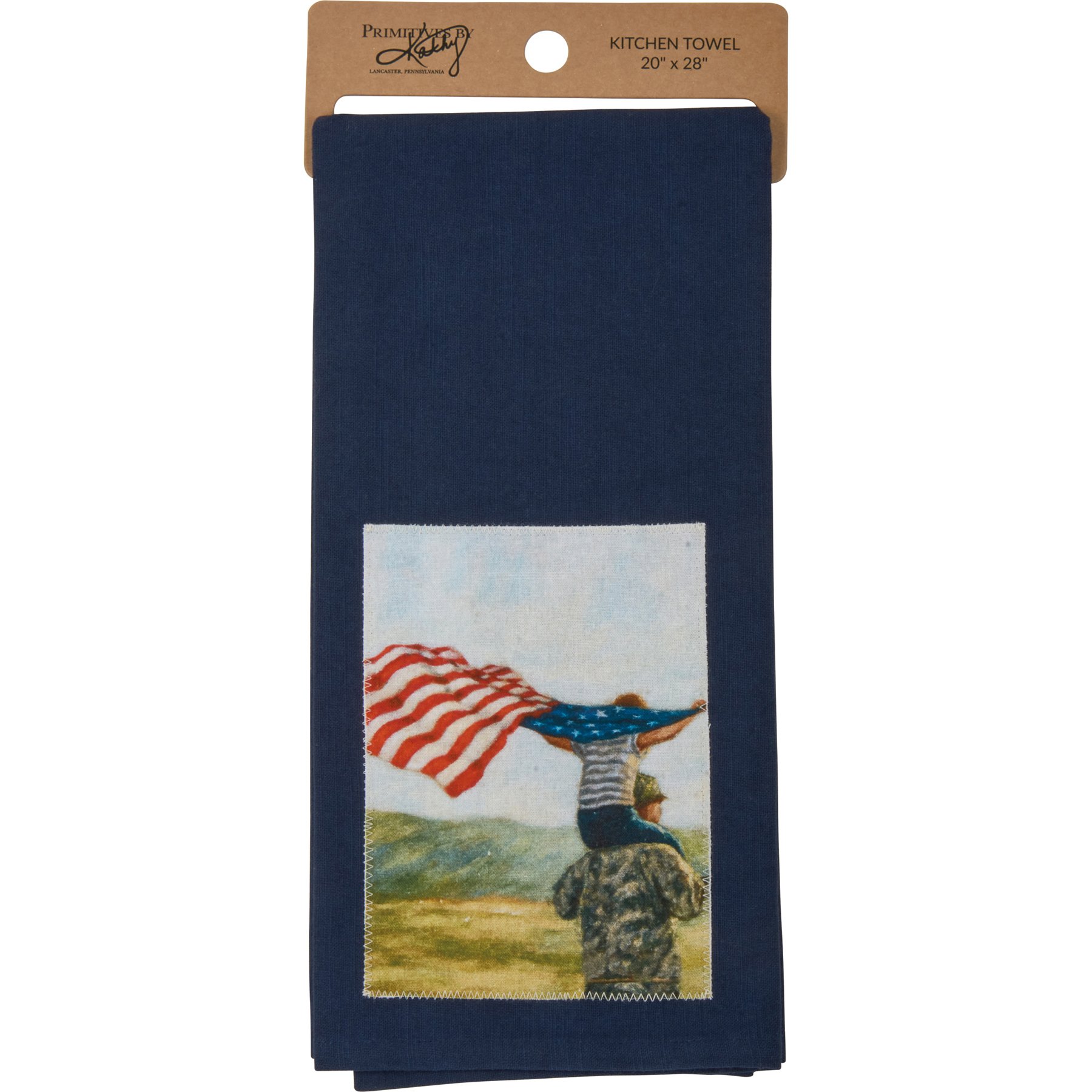 A blue cotton kitchen towel from our Patriotic Collection featuring a large stitched art panel displaying a military member carrying a loved one waving an American flag on their shoulders. Design is replicated from original artwork painted onto burlap canvas, giving the art a unique depth and texture. Our Daddy's Home kitchen towel is machine-washable for convenient cleaning. Packaged on a cardboard hanger with hole to easily hang on rack.