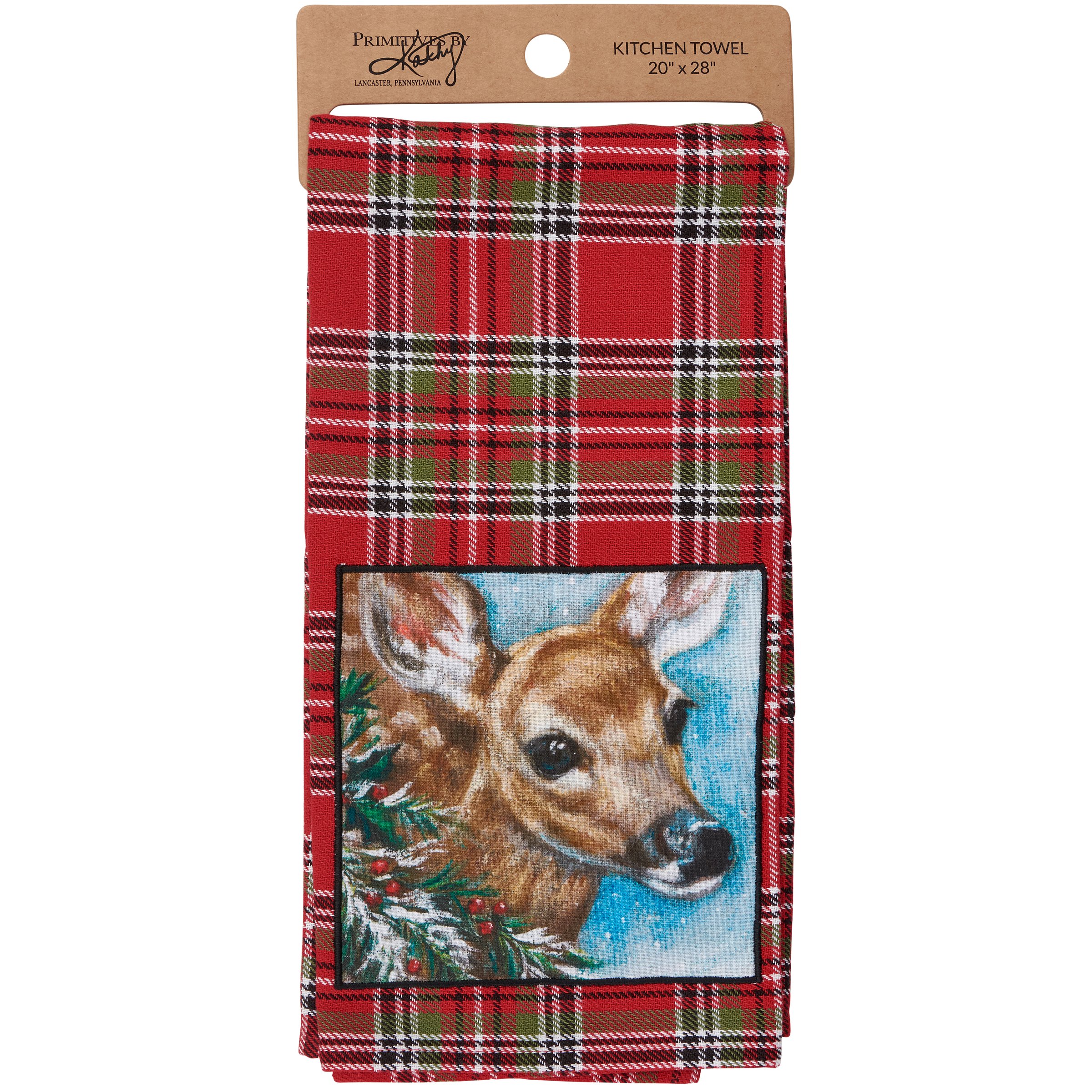 A cotton kitchen towel from our Christmas Collection featuring a stitched art panel with Christmas tartan plaid pattern all-over towel. Art panel displays a deer in a winter scene. Design is replicated from original artwork painted onto burlap canvas, giving the art a unique depth and texture. Our Deer kitchen towel is conveniently machine-washable for easy cleaning. Seasonal kitchen towel is packaged on a cardboard hanger with hole to easily hang on rack. A rustic winter-themed kitchen accessory perfect for seasonal use.