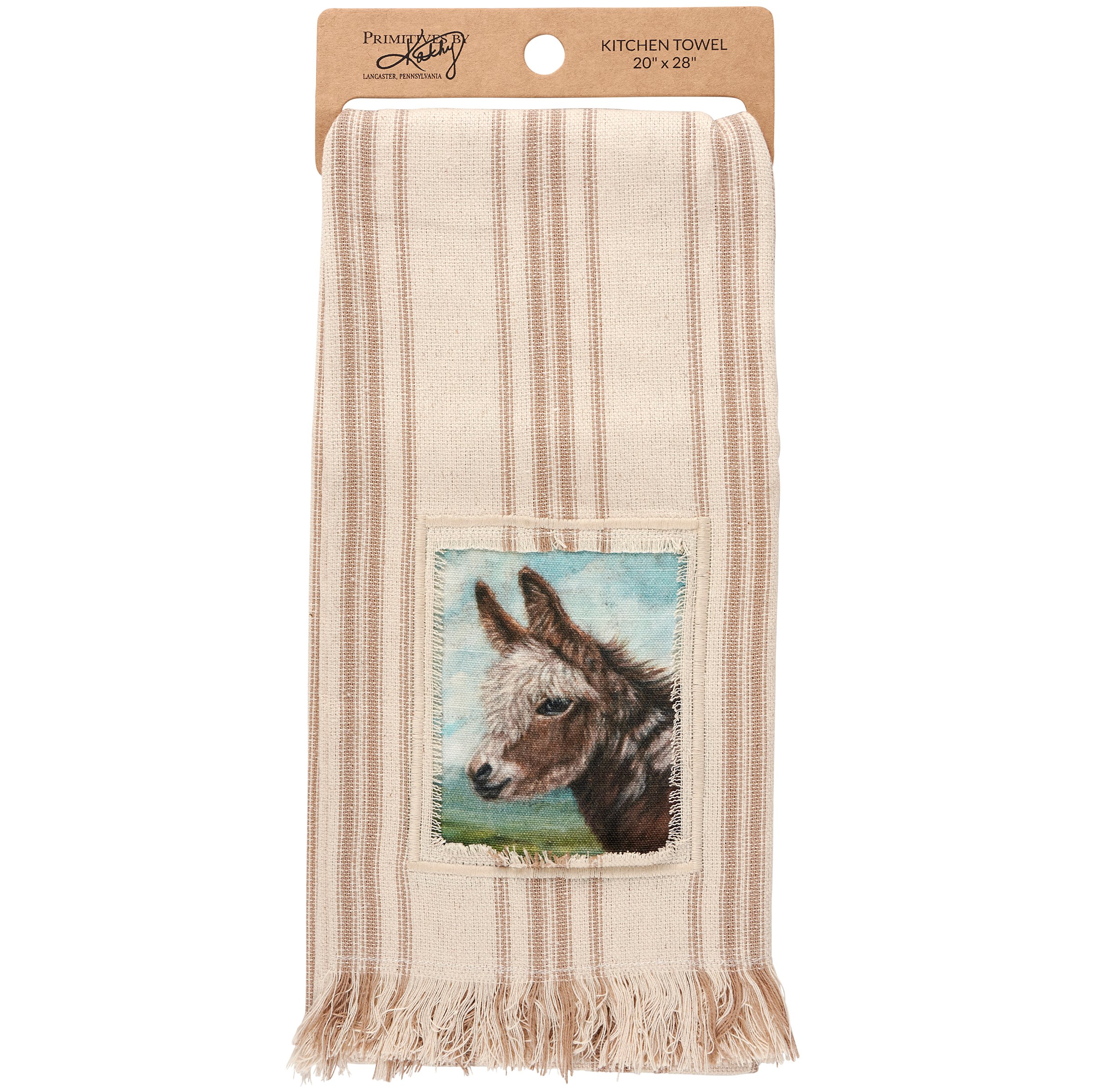 A cream cotton kitchen towel from our Farmhouse Collection featuring a stitched art panel with frayed border and woven brown stripes throughout. Art panel displays a donkey in a field replicated from original artwork painted onto burlap canvas, giving the art a unique depth and texture. Our Donkey kitchen towel is conveniently machine-washable for easy cleaning. Farm towel is packaged on a cardboard hanger with hole to easily display on rack. A rustic farm-themed kitchen accessory perfect for everyday use.