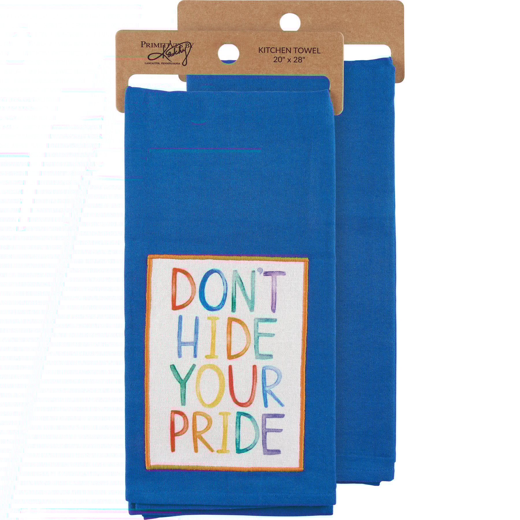 A blue cotton kitchen towel from our Pride Collection featuring a large stitched art panel displaying a "Don't Hide Your Pride" sentiment in a watercolor rainbow style with coordinating orange embroidery. Our Don't Hide Your Pride kitchen towel is machine-washable for convenient cleaning. Packaged on a cardboard hanger with hole to easily hang on rack. A portion of the proceeds from the sale of this Benefit Item will be donated to Lancaster LGBTQ+ Coalition to support their commitment to building a more inclusive Lancaster County abundant in opportunities for LGBTQQIA+ individuals.