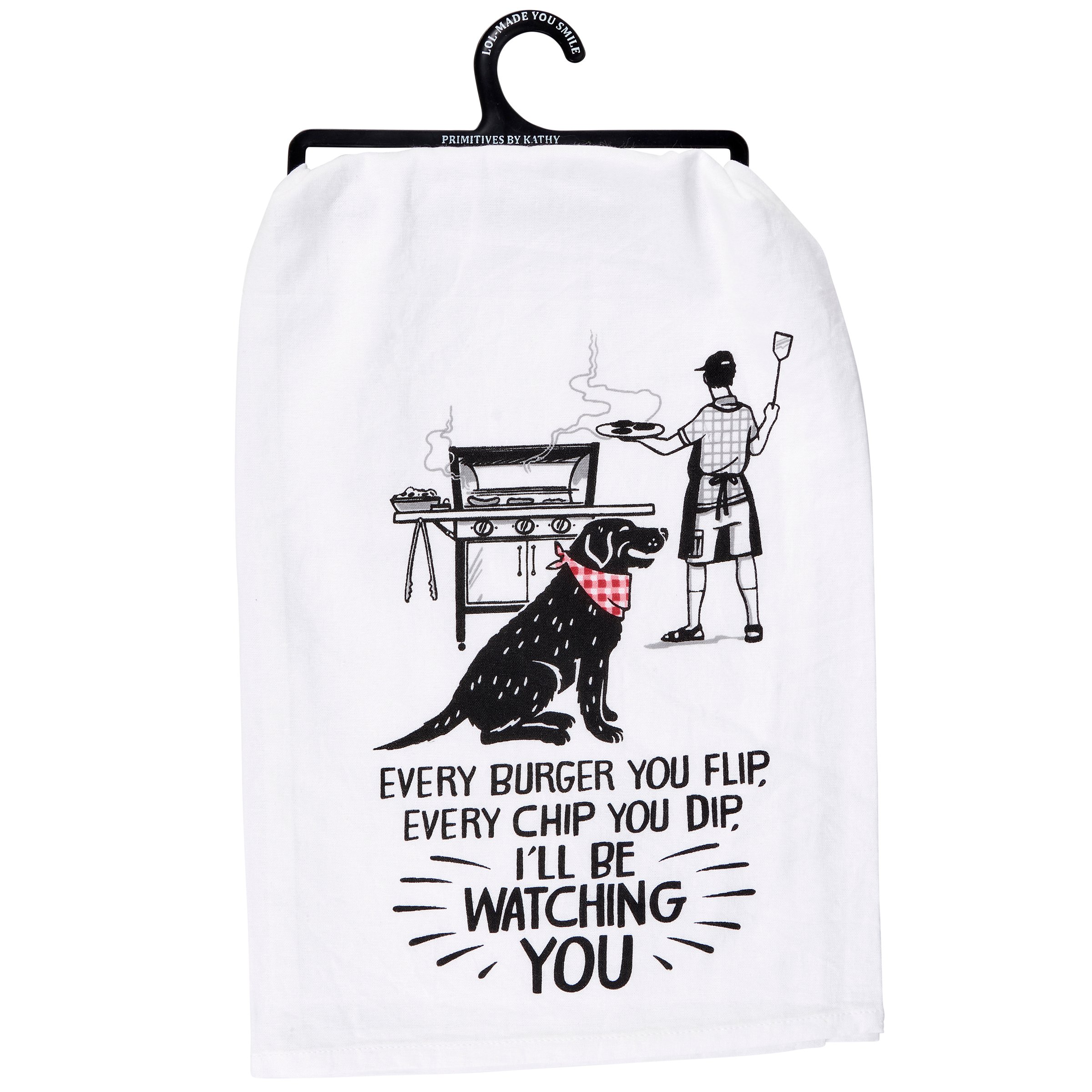 A black and white cotton kitchen towel from our Grilling & Chilling Collection displaying a unique hand illustrated design of a dog watching a person grilling above a fun grilling-themed sentiment that reads "Every Burger You Flip, Every Chip You Dip, I'll Be Watching You." Our Every Burger kitchen towel is machine-washable for convenient cleaning. Packaged on a black plastic hanger to easily display on rack. A fun grilling-themed kitchen accessory perfect for everyday use.