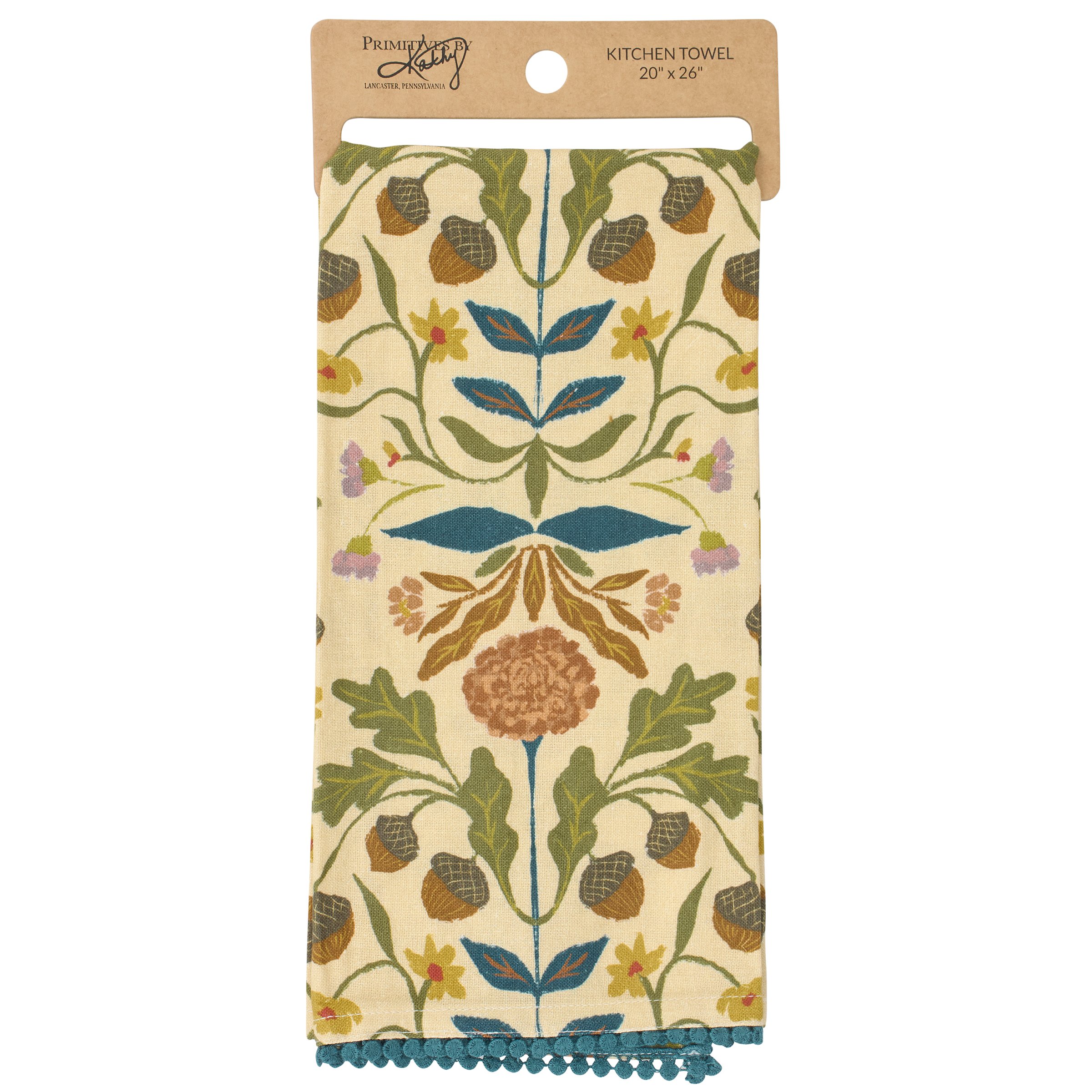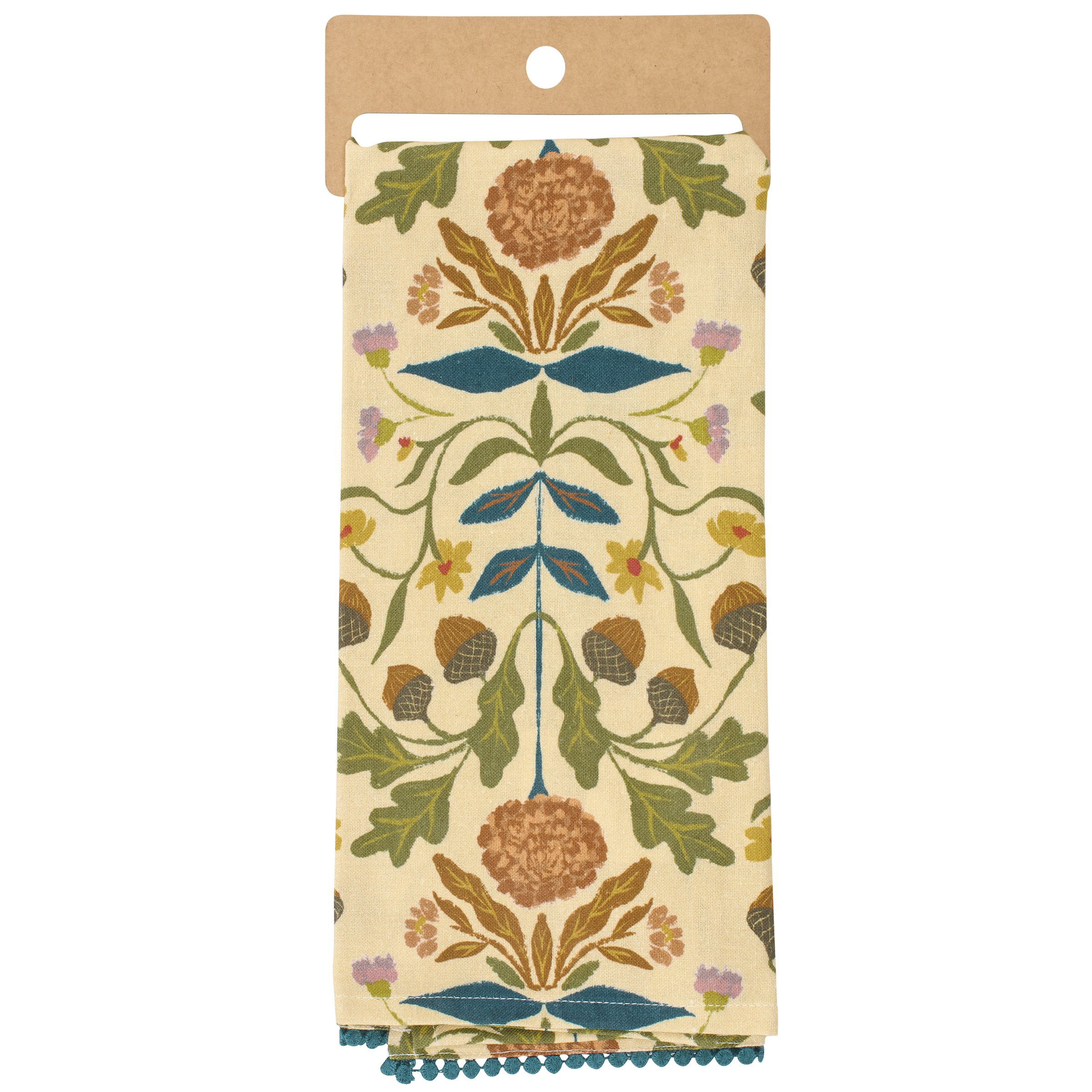 A cotton-linen blend kitchen towel from our Fall & Harvest Collection featuring an all-over design displaying folk art inspired fall florals with a blue pom trim at the bottom of the towel. Folk art florals design is replicated from original art hand painted in a unique watercolor style. Our Fall Folk Floral kitchen towel is conveniently machine washable for easy cleaning. Seasonal kitchen towel is packaged on a cardboard hanger with hole to easily hang on rack. A folk fall kitchen accessory perfect for adding seasonal style to any kitchen.