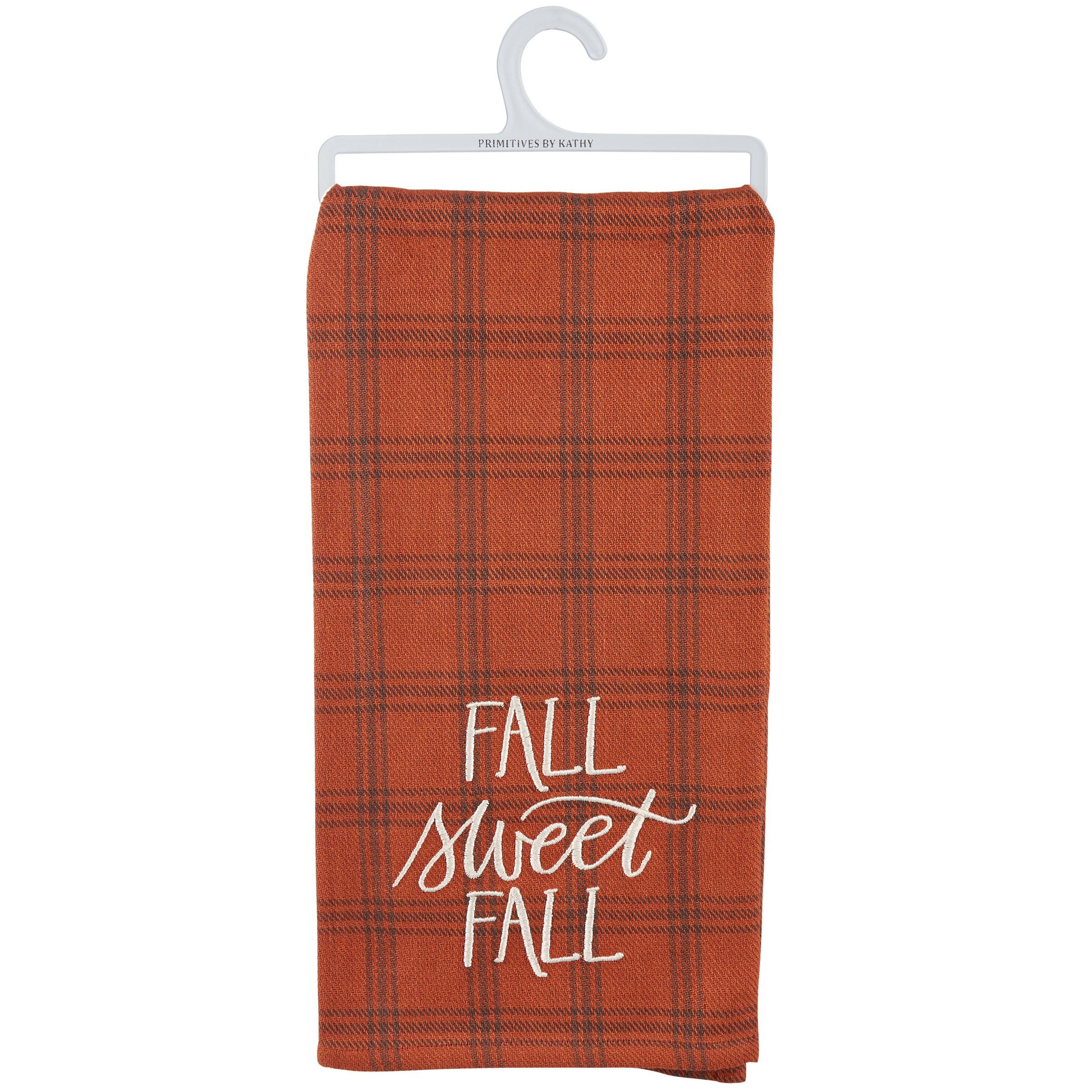 A plaid cotton kitchen towel from our Fall & Harvest Collection displaying an autumn color palette and embroidered "Fall Sweet Fall" sentiment in a hand illustrated style. Our Fall Sweet Fall kitchen towel is machine-washable for convenient cleaning. Packaged on a clear plastic hanger to easily display on rack. A rustic and functional seasonal kitchen accent.