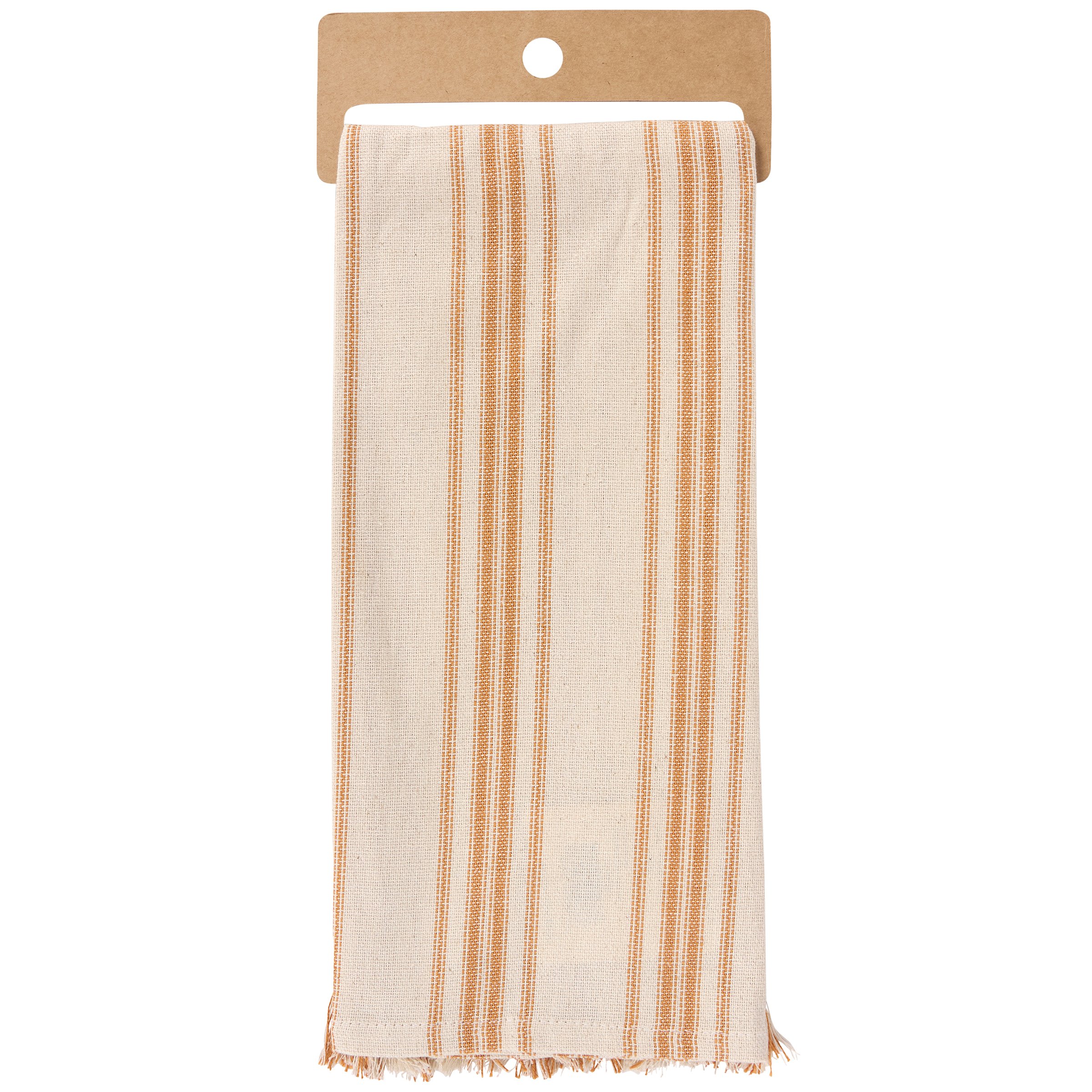 A cream cotton kitchen towel from our Fall & Harvest Collection featuring a stitched art panel with frayed border and woven orange stripes throughout. Fall design displays a deer in an autumn forest replicated from original artwork painted onto burlap canvas, giving the art a unique depth and texture. Our Forest Deer kitchen towel is conveniently machine-washable for easy cleaning. Seasonal kitchen towel is packaged on a cardboard hanger with hole to easily display on rack. A rustic fall-themed kitchen accessory perfect for seasonal use.
