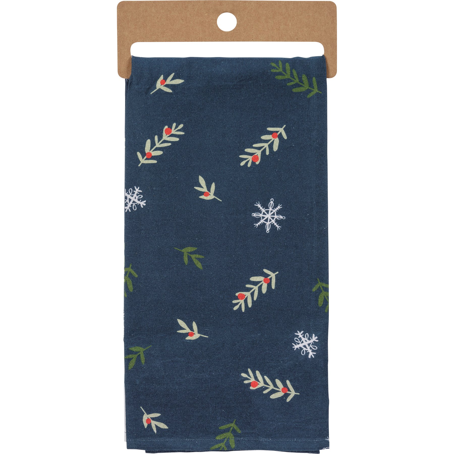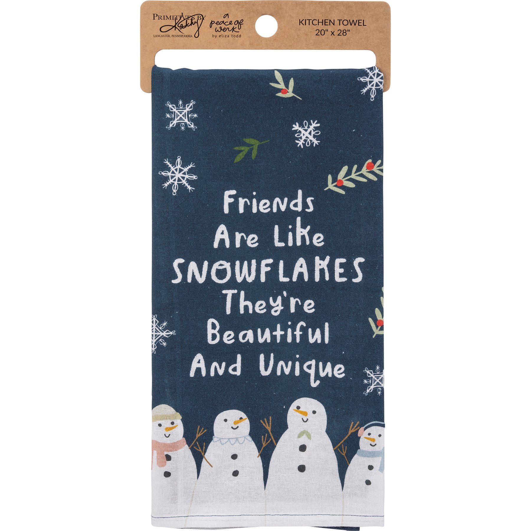 A blue cotton kitchen towel featuring a "Friends Are Like Snowflakes They're Beautiful And Unique" sentiment, snowmen designs, and all-over holly branch and snowflakes designs. Our Friends Are Like Snowflakes kitchen towel is machine-washable. Towel is packaged on a cardboard hanger with a hole to easily hang on rack.