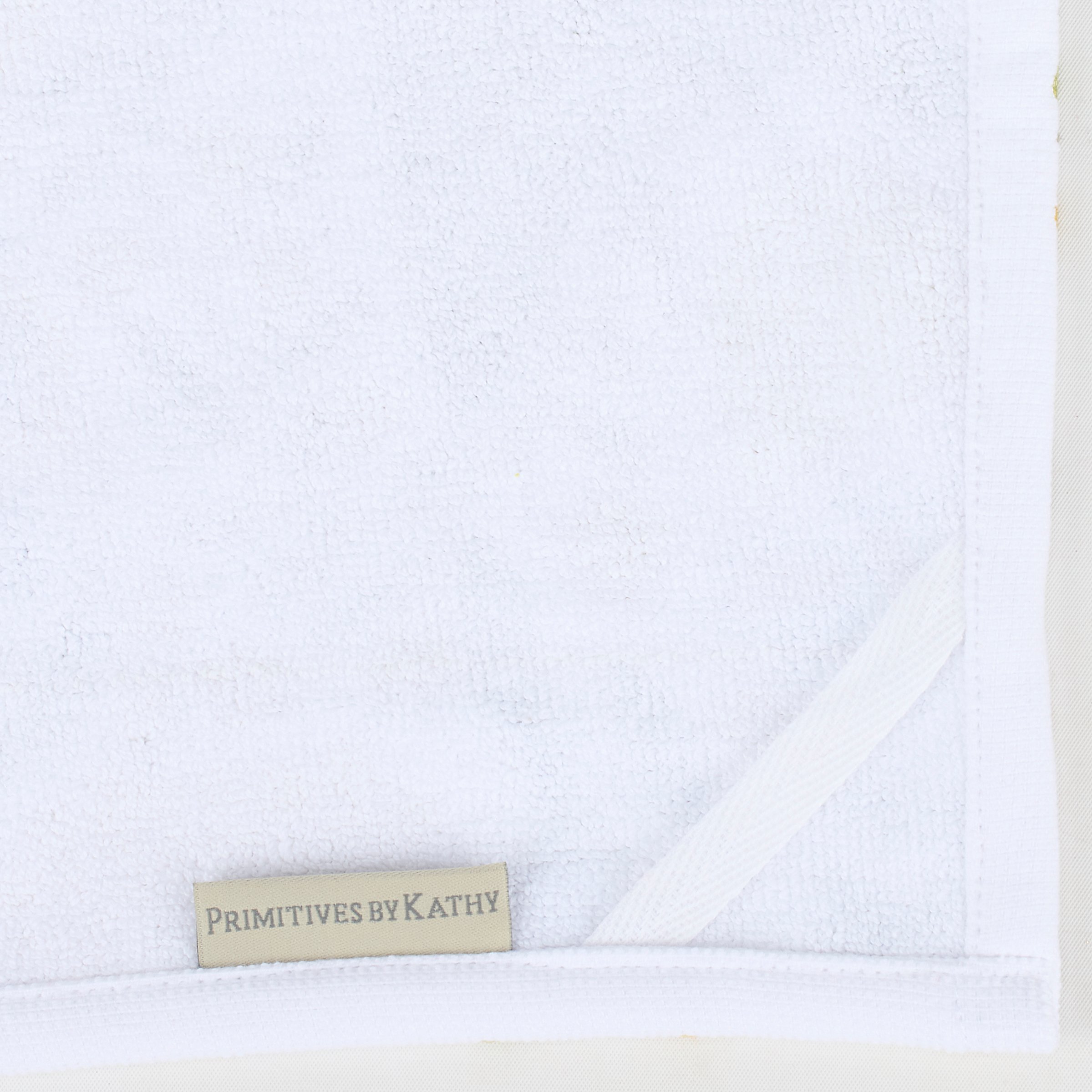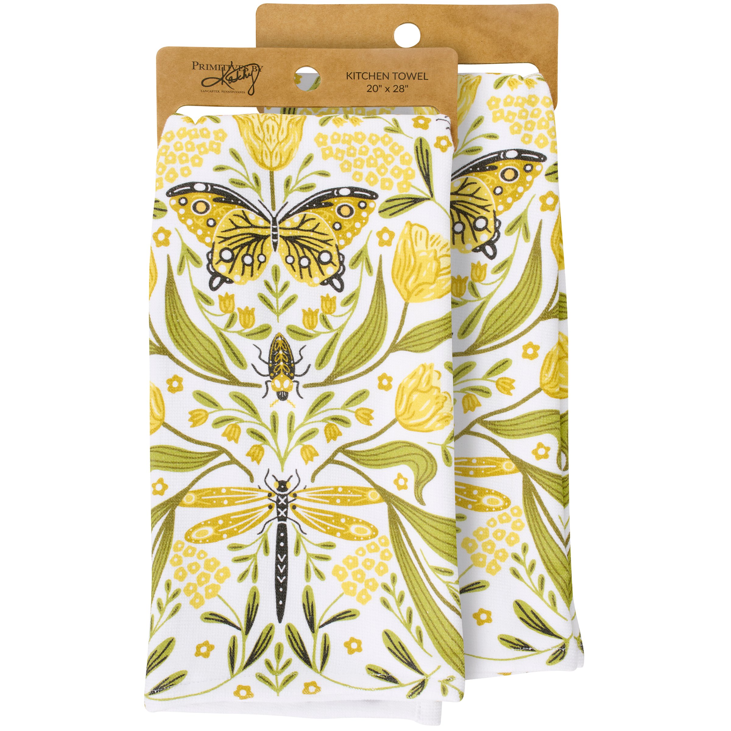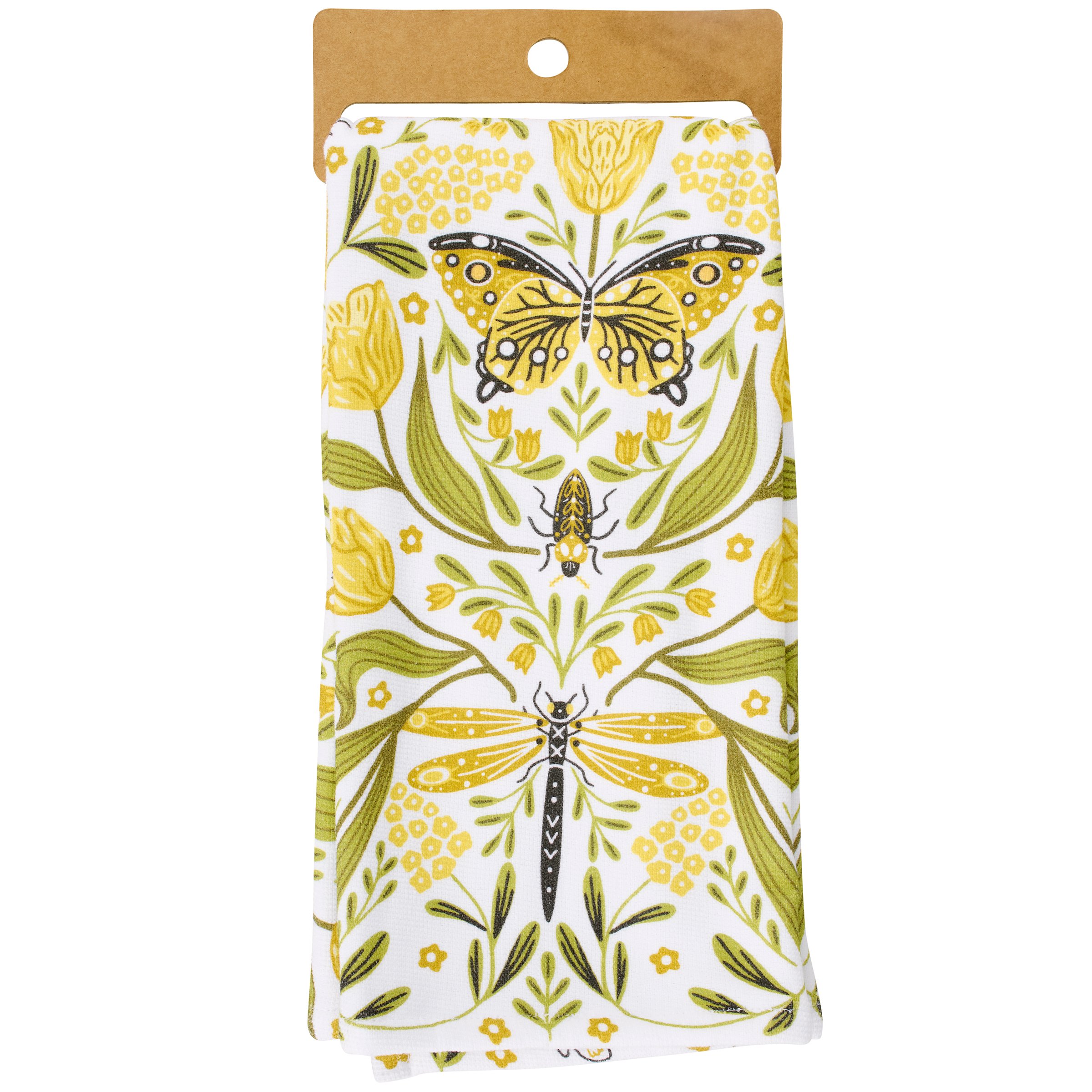 A cotton kitchen towel from our Botanical Collection displaying an all-over design of golden flowers and garden insects including a dragonfly replicated from original hand illustrated artwork inspired by folk art. Dragonfly kitchen towel features a terrycloth layer on the back for added absorbency. Our Golden Dragonfly kitchen towel is conveniently machine-washable for easy cleaning. Botanical towel is packaged on a cardboard hanger with hole to easily display on rack. A floral themed kitchen accessory perfect for everyday use.