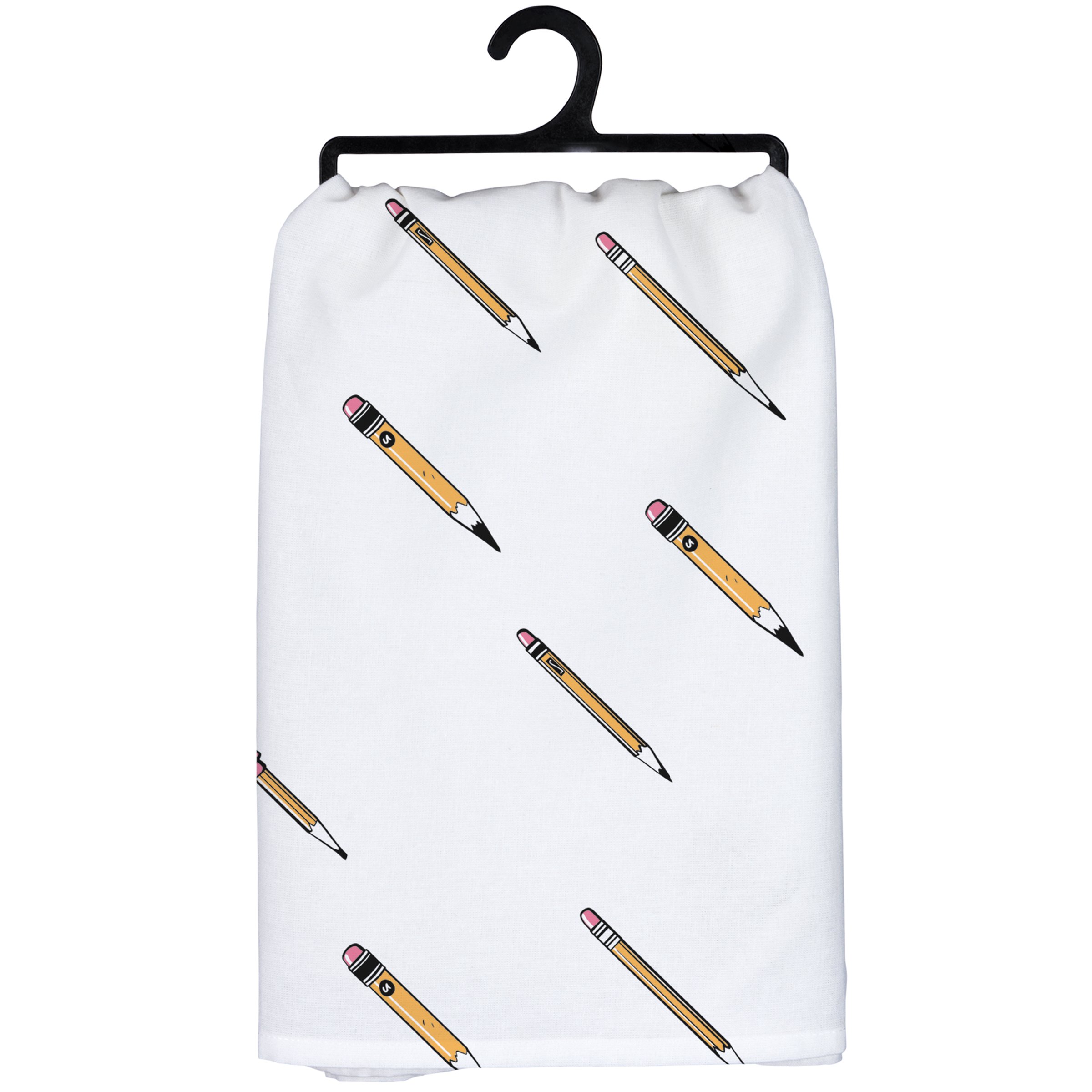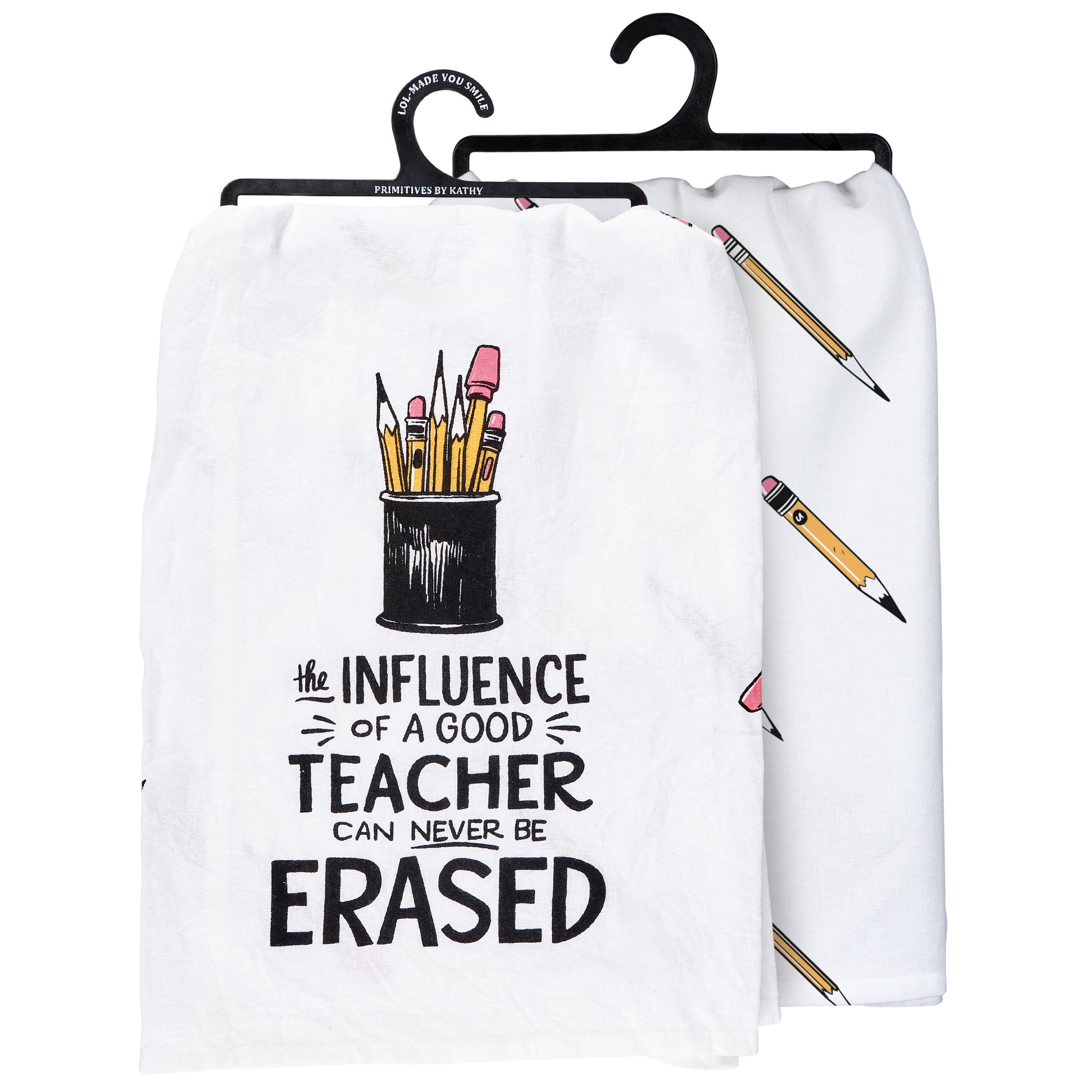 A cotton kitchen towel from our Teacher Collection displaying a unique hand illustrated design of a full pencil cup above a fun teacher-themed sentiment that reads "The Influence Of A Good Teacher Can Never Be Erased." Kitchen towel also features all-over designs of various style pencils. Our Good Teacher kitchen towel is machine-washable for convenient cleaning. Packaged on a black plastic hanger to easily display on rack. A fun teacher-themed kitchen accessory perfect for everyday use.