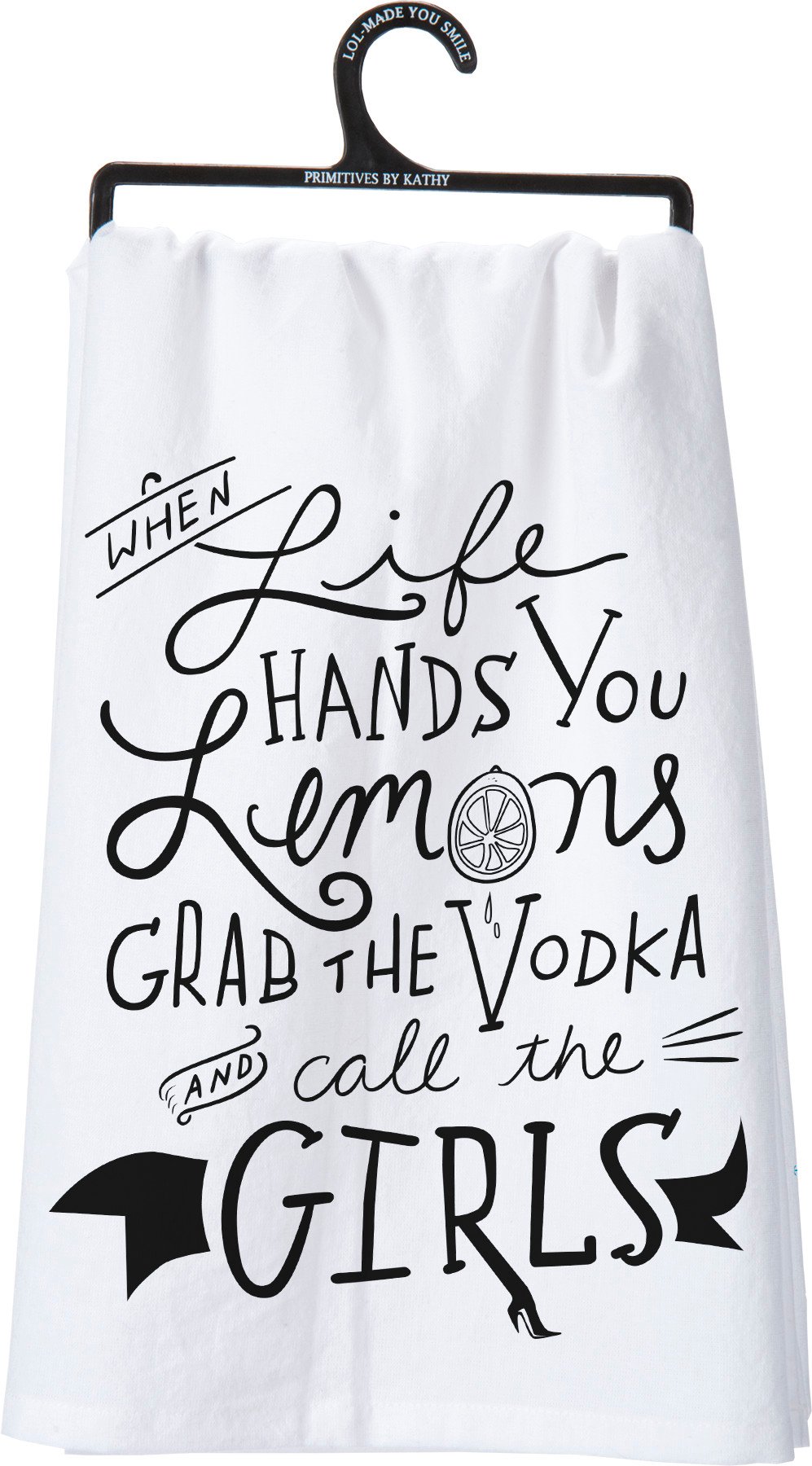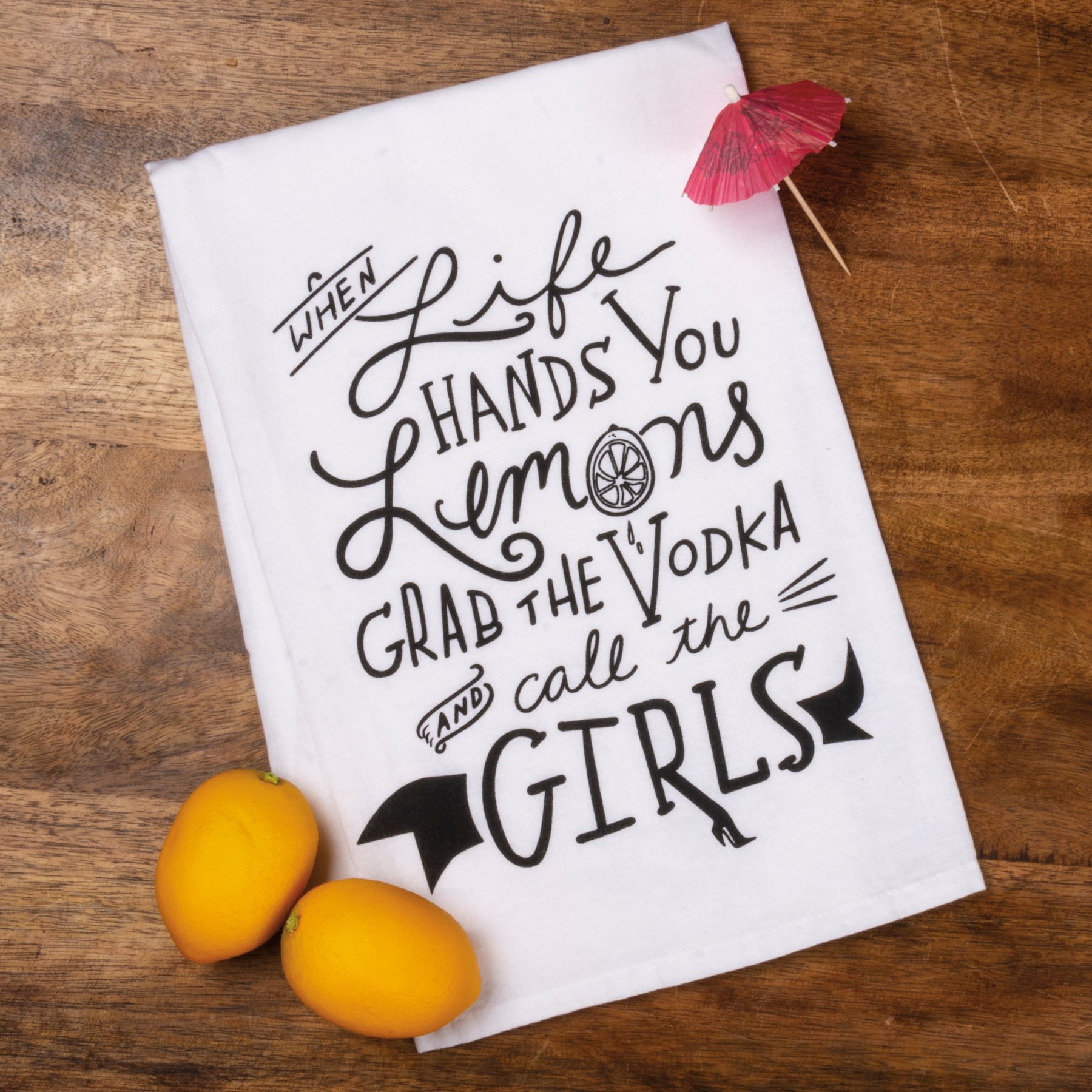 A black and white cotton kitchen towel lending a hand lettered "When Life Hands You Lemons Grab The Vodka And Call The Girls" sentiment with lemon and heels design that complements well with existing kitchen decor. Machine-washable.