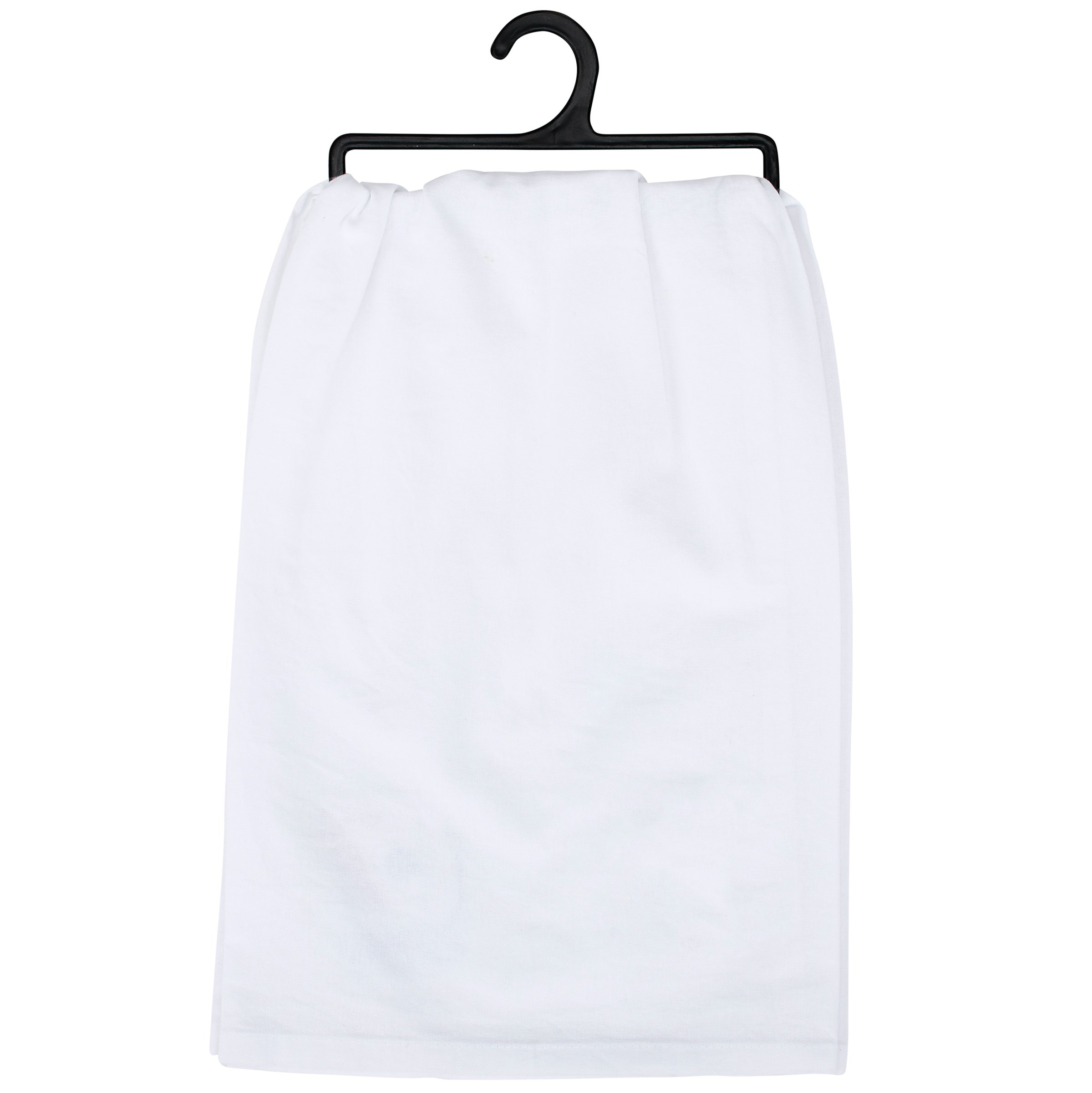 A white cotton kitchen towel from our Grilling & Chilling Collection displaying a playful hand illustrated design of grilled food and beer can with a fun grilling inspired sentiment that reads "Grillin' Chillin' Refillin'." Our Grillin' Chillin' Refillin' kitchen towel is conveniently machine-washable for easy cleaning. This funny grill towel is packaged on a black plastic hanger to easily display on rack. A fun grilling-themed gift perfect for adding personality to any grill station or kitchen.