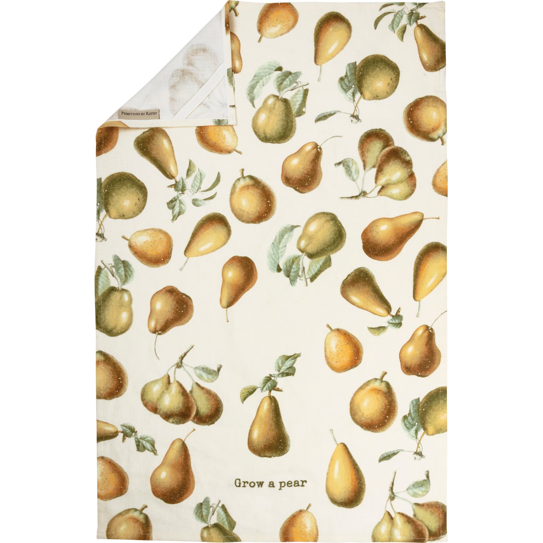 A cotton linen blend kitchen towel featuring all-over retro style pear designs and punny embroidered "Grow A Pear" sentiment. Features a cotton tape loop in the corner for easy hanging. Machine-washable. Towel is packaged on a cardboard hanger with a hole to easily hang on rack.