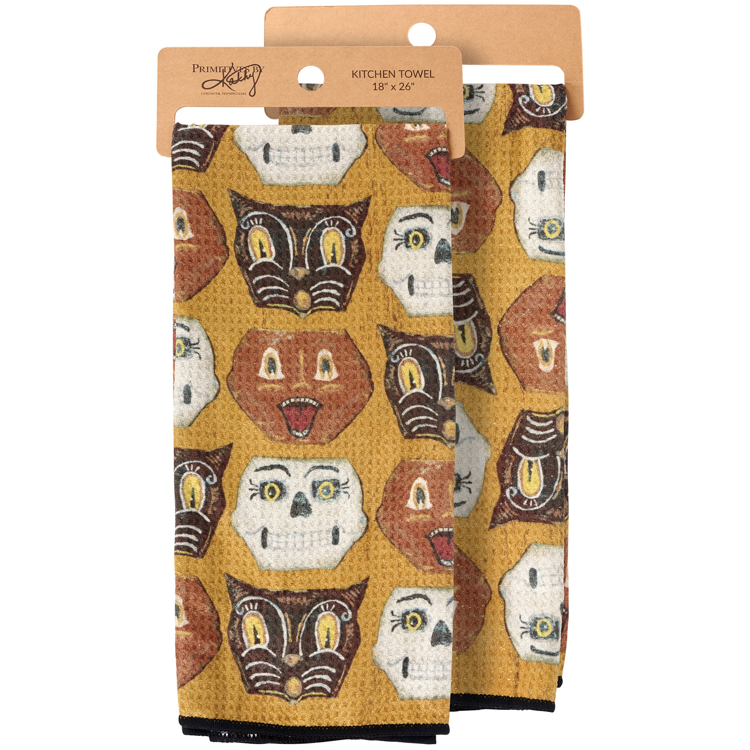 A microfiber kitchen towel from our Halloween Collection displaying an all-over design of a primitive pattern of Halloween faces featuring jack o'lanterns, black cats, and skeletons. Halloween face designs are replicated from original art pieces made from hand carved wooden shapes that are hand painted with each design. Our Halloween Faces kitchen towel is conveniently machine-washable for easy cleaning. Seasonal kitchen towel is packaged on a cardboard hanger with hole to easily display on rack. A primitive Halloween kitchen accessory perfect for seasonal use.