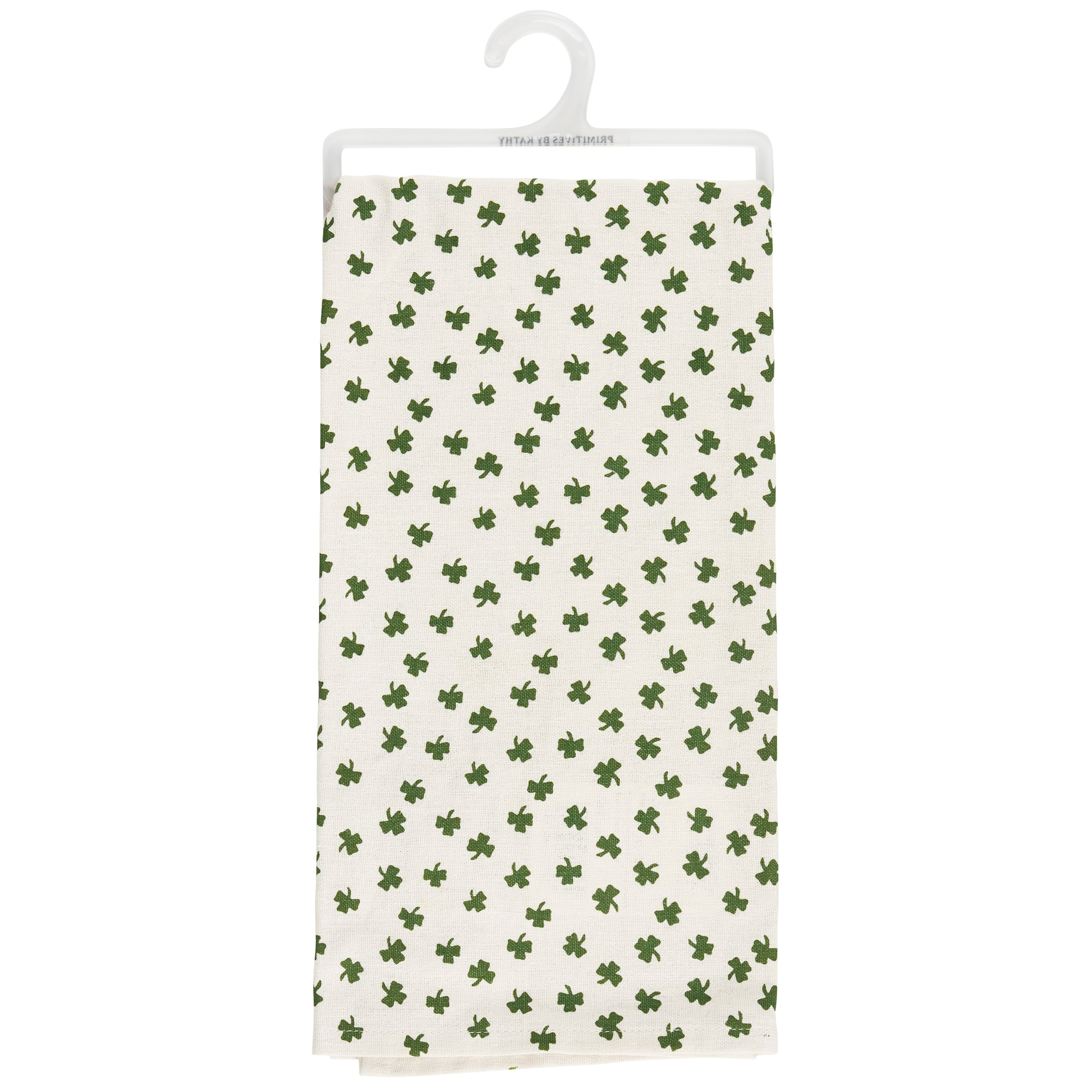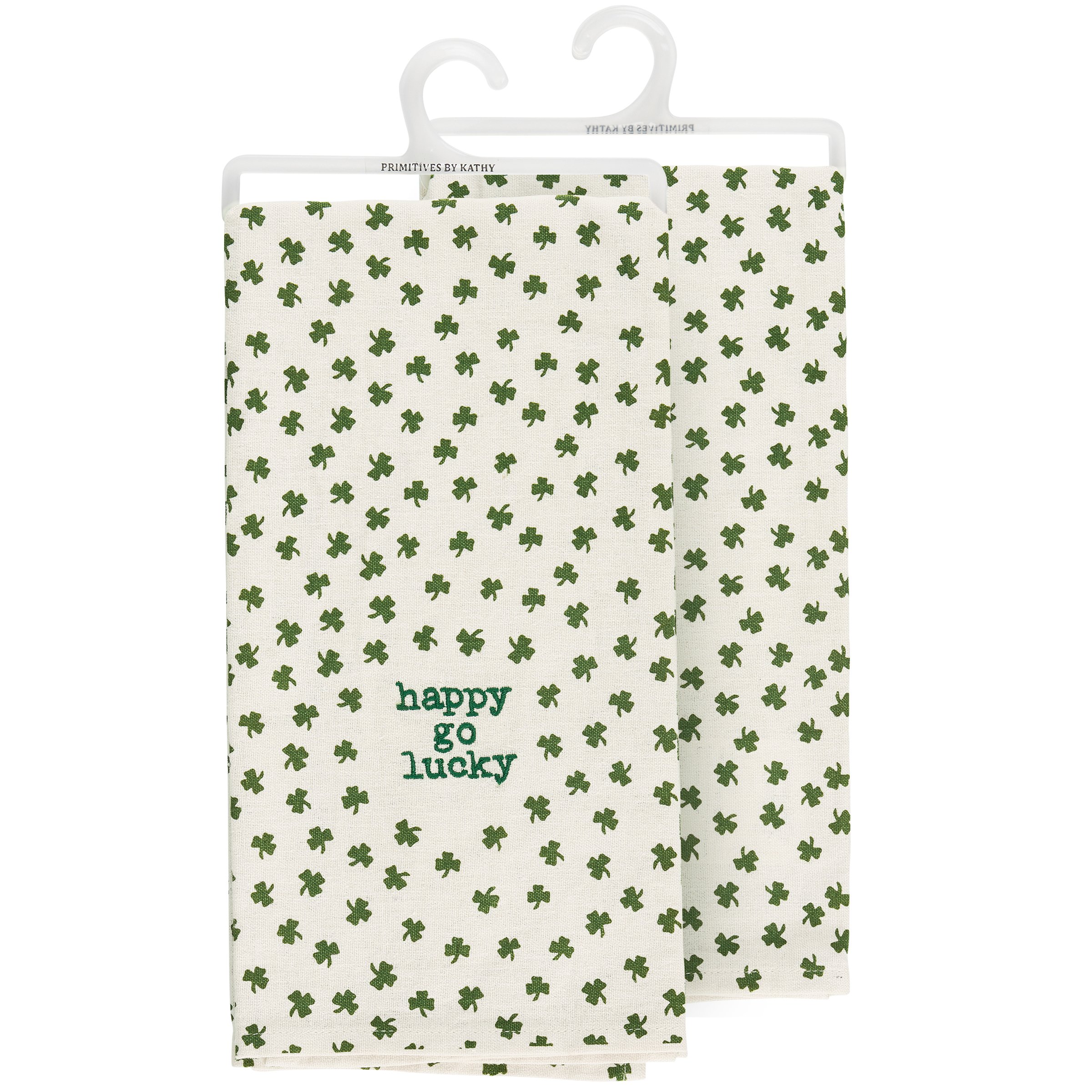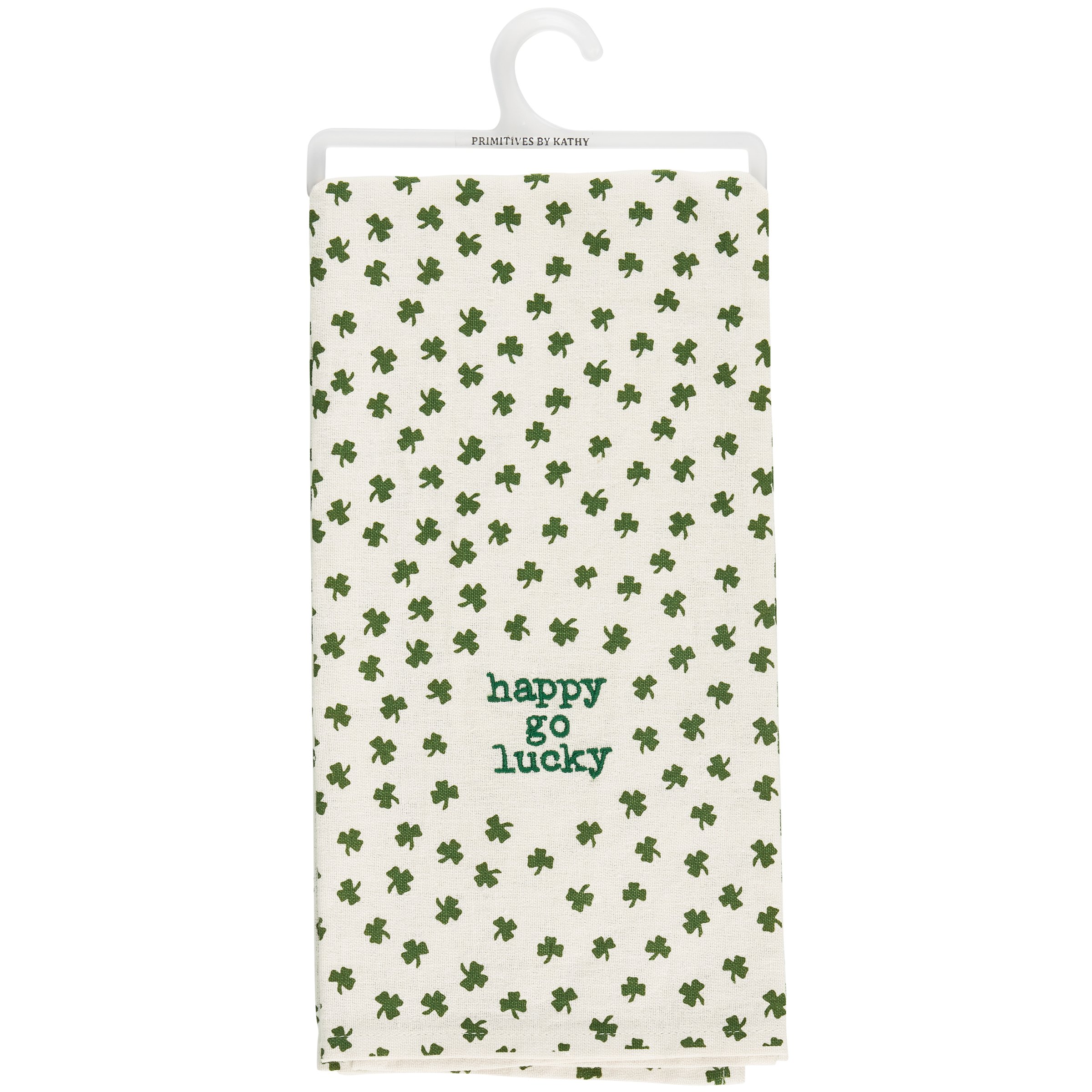 A cotton-linen blend kitchen towel from our St. Patrick's Day Collection displaying an all-over print of shamrocks with an embroidered seasonal sentiment that reads "Happy Go Lucky." Our Happy Go Lucky kitchen towel is machine-washable for convenient cleaning. Packaged on a clear plastic hanger to easily display on rack. A fun St. Patrick's Day-themed kitchen accessory perfect for seasonal use.