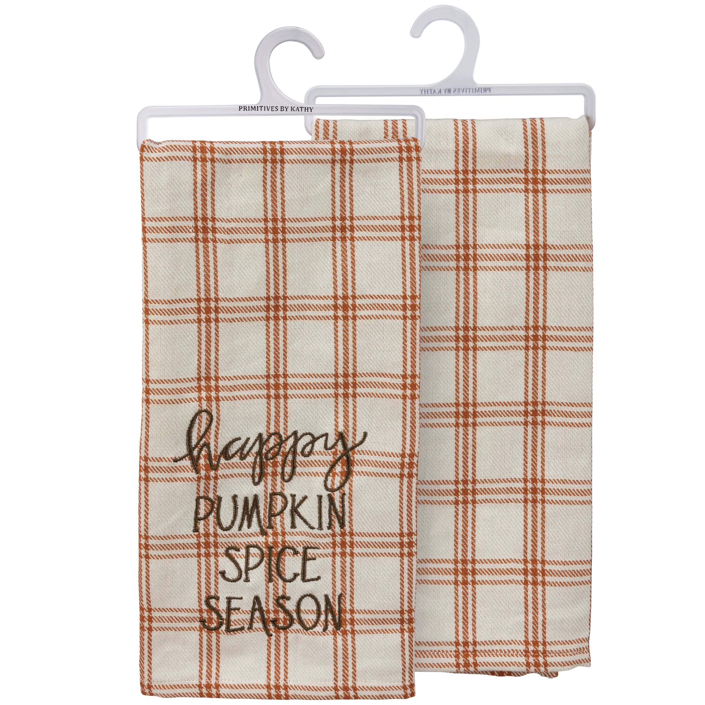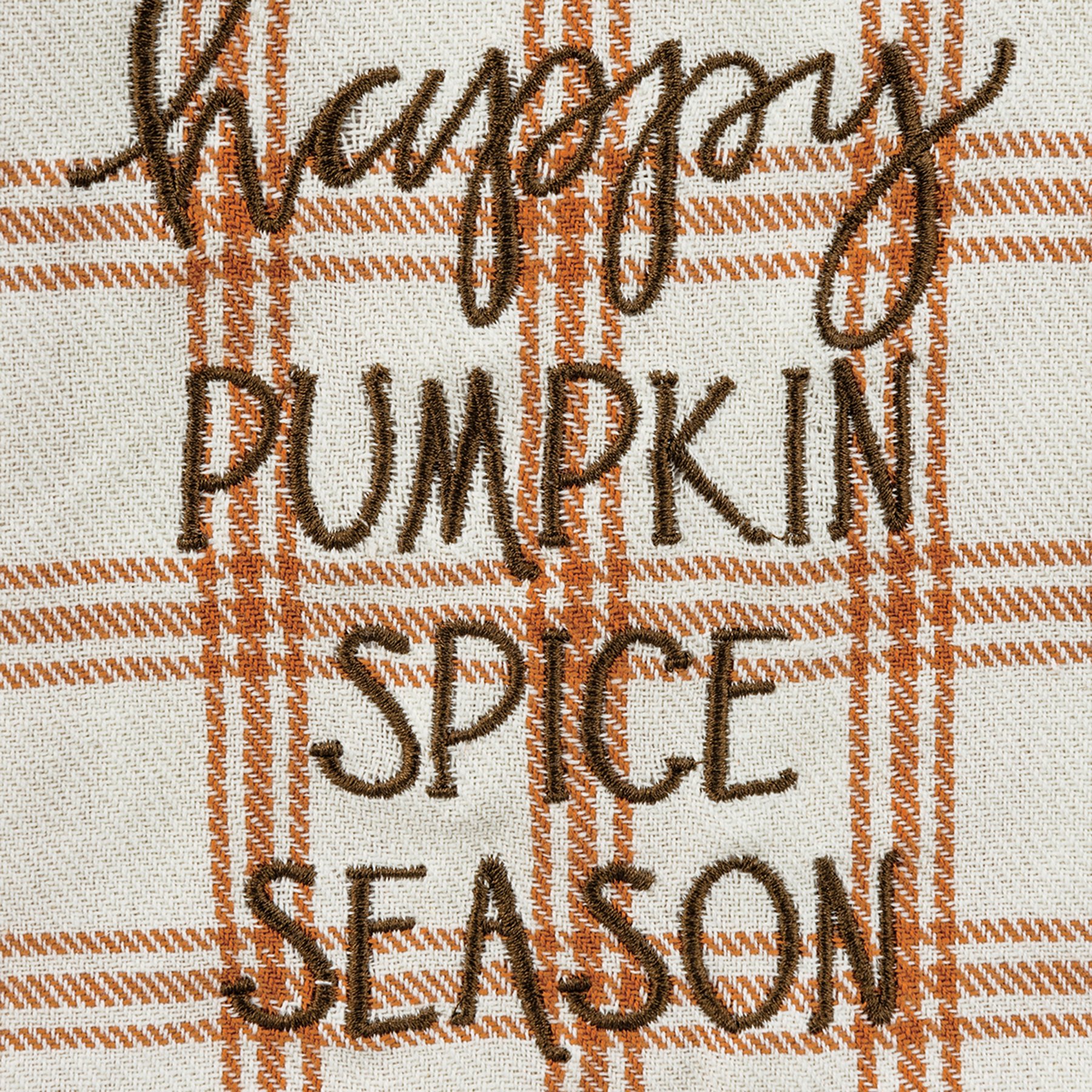 A cotton kitchen towel featuring hand lettered embroidered "Happy Pumpkin Spice Season" sentiment and orange and cream plaid pattern. Machine-washable.