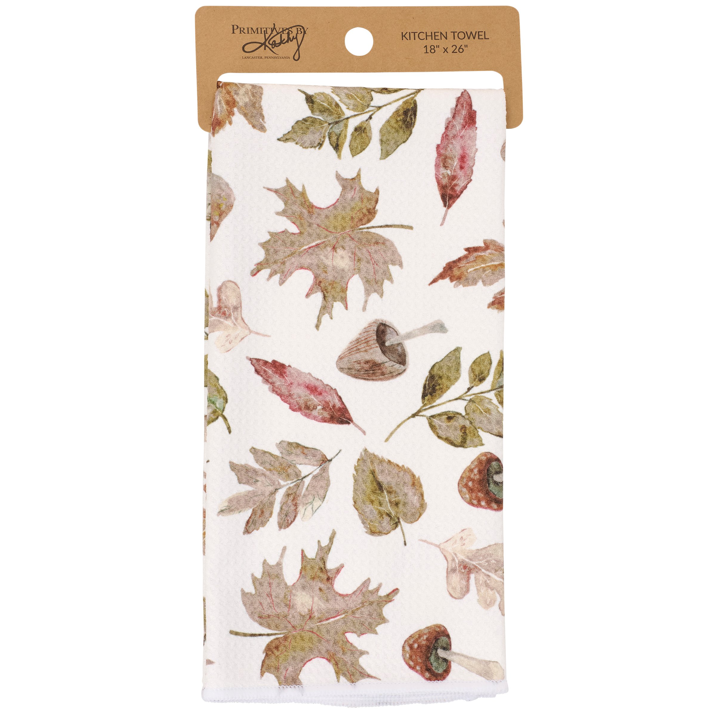 A microfiber kitchen towel from our Fall & Harvest Collection displaying an all-over design of harvest leaves and mushrooms replicated from original art hand painted in a unique watercolor style. Our Harvest Leaves kitchen towel is conveniently machine-washable for easy cleaning. Seasonal kitchen towel is packaged on a cardboard hanger with hole to easily display on rack. A nature-themed fall kitchen accessory perfect for seasonal use.