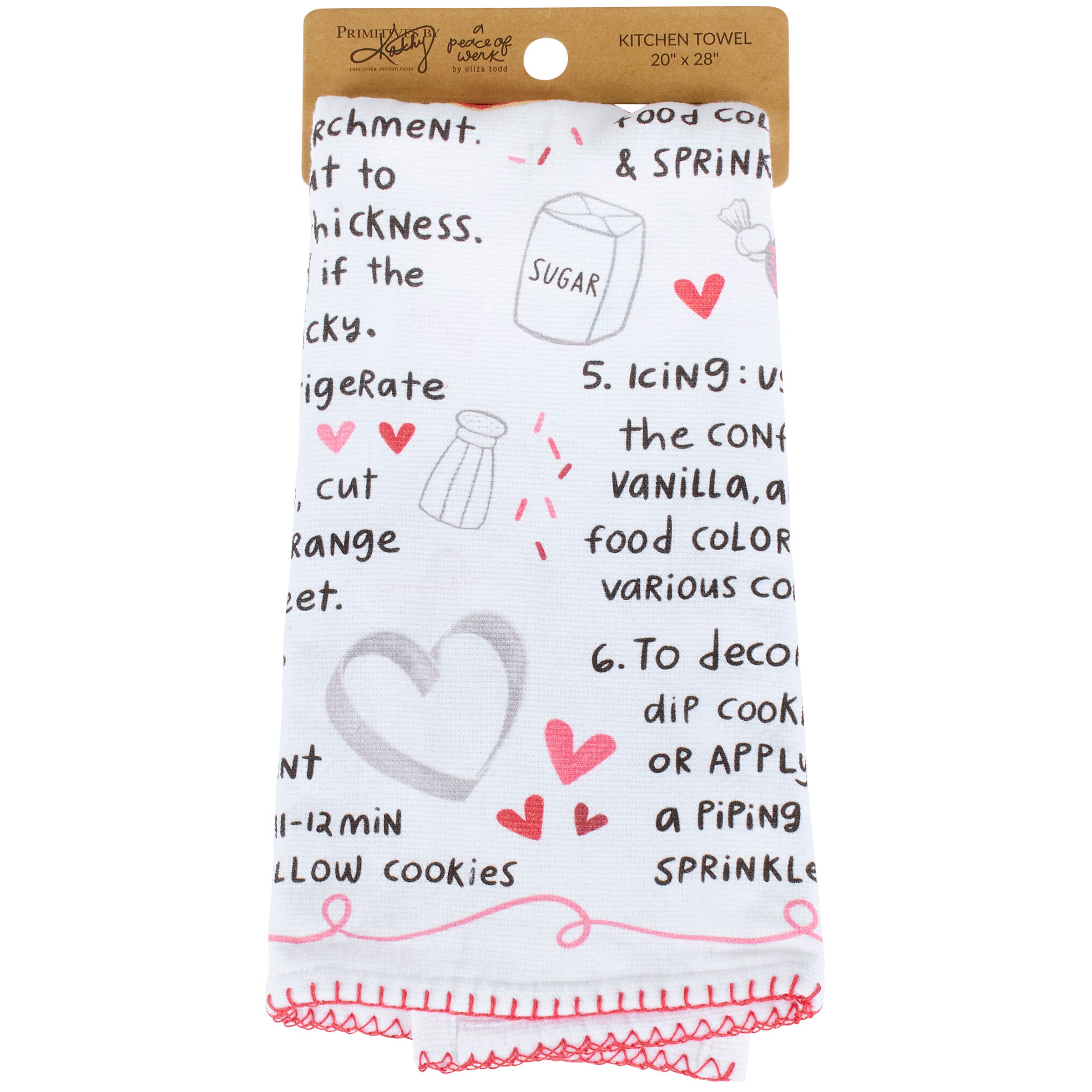 A cotton kitchen towel from our Homestead Collection displaying a fun recipe inspired all-over design replicated from original hand illustrated art. Holiday recipe design features instructions for making homemade iced sugar cookies in a heart shape with coordinating illustrations. Heart iced sugar cookies recipe is printed on textured slub fabric with a coordinating red hem stitch at the bottom. Seasonal recipe kitchen towel features a terrycloth layer on the back for added absorbency and corner loop for hanging. Our Iced Sugar Cookies kitchen towel is conveniently machine-washable for easy cleaning. Kitchen towel is packaged on a cardboard hanger with hole to easily display on rack. A fun recipe-themed Valentine's Day gift perfect for a seasonal kitchen accessory.