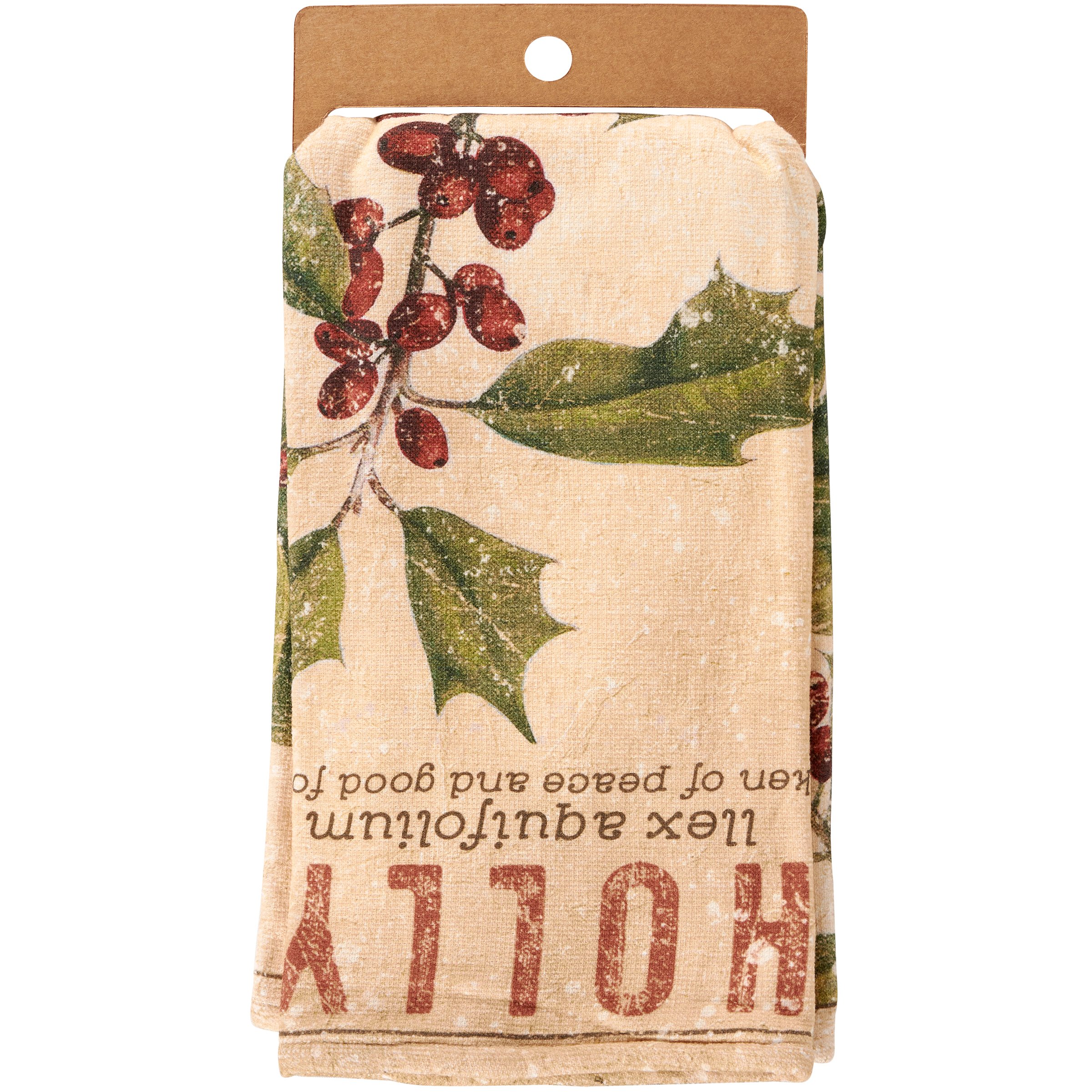 A cotton kitchen towel from our Christmas Collection displaying an all-over design of vintage plant study inspired art of holly with distressed details for an aged appearance. Vintage Christmas kitchen towel features a terrycloth layer on the back for added absorbency and a cotton tape loop for hanging. Our Holly kitchen towel is conveniently machine-washable for easy cleaning. Seasonal kitchen towel is packaged on a cardboard hanger with hole to easily display on rack. A vintage Christmas kitchen accessory perfect for seasonal use.
