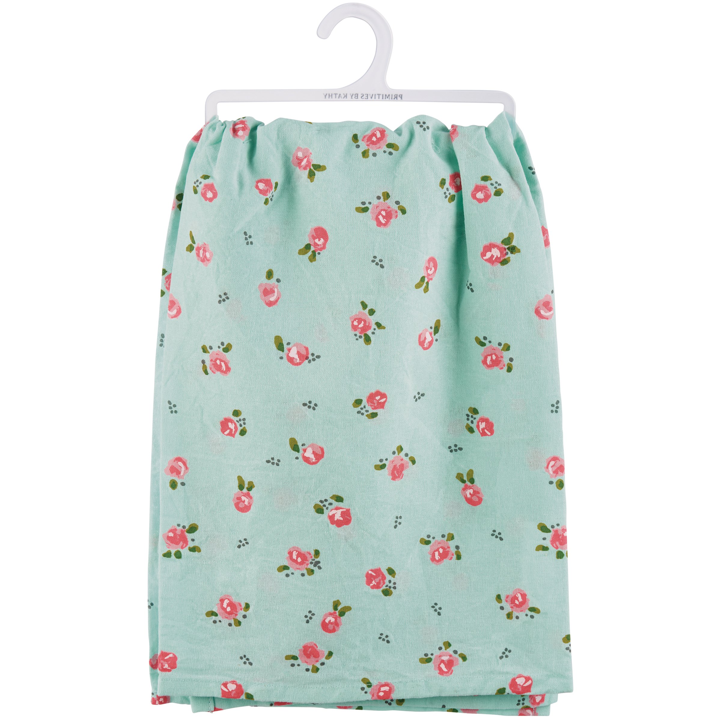 A mint green cotton kitchen towel from our Mother's Day Collection displaying an all-over print of charming watercolor flowers with a hand illustrated "Home Is Where Mom Is" sentiment. Our Home Is Where Mom Is kitchen towel is machine-washable for convenient cleaning. Packaged on a plastic hanger with hook to easily hang on rack.