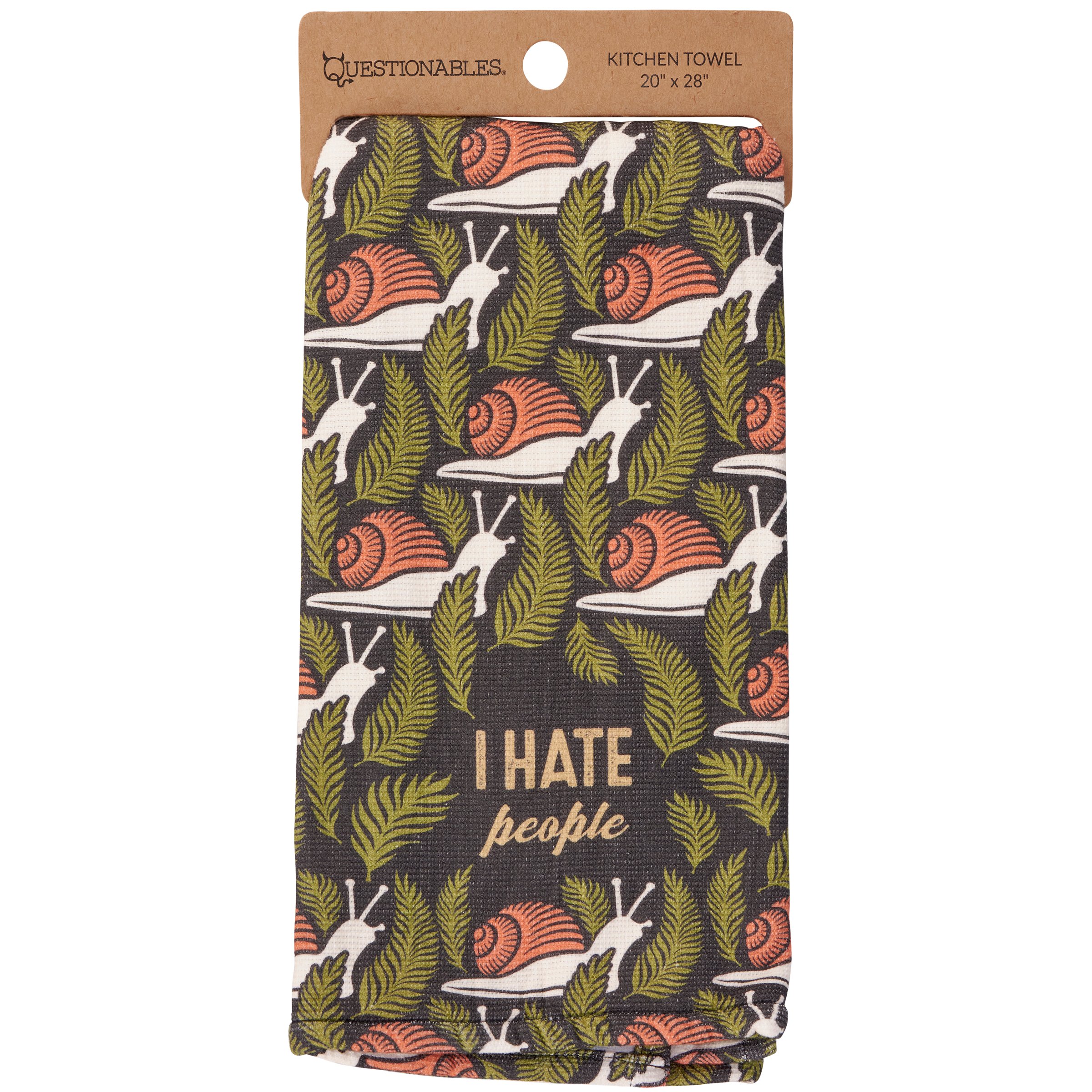 Give anyone that steps into personal space a vibe check with this super-soft cotton kitchen towel displaying a relaxing snail pattern with an honest sentiment that reads "I Hate People." Fold to display the chill pattern or flip for the relatable sentiment. Questionables kitchen towel features an absorbent terrycloth layer on the back to soak up whatever you throw at it. Machine-washable for stress-free cleaning. Packaged on a cardboard hanger with a hole to beautifully display on rack. Our I Hate People kitchen towel offers a down-to-earth style perfect for everyday expression or gifting to like-minded friends.