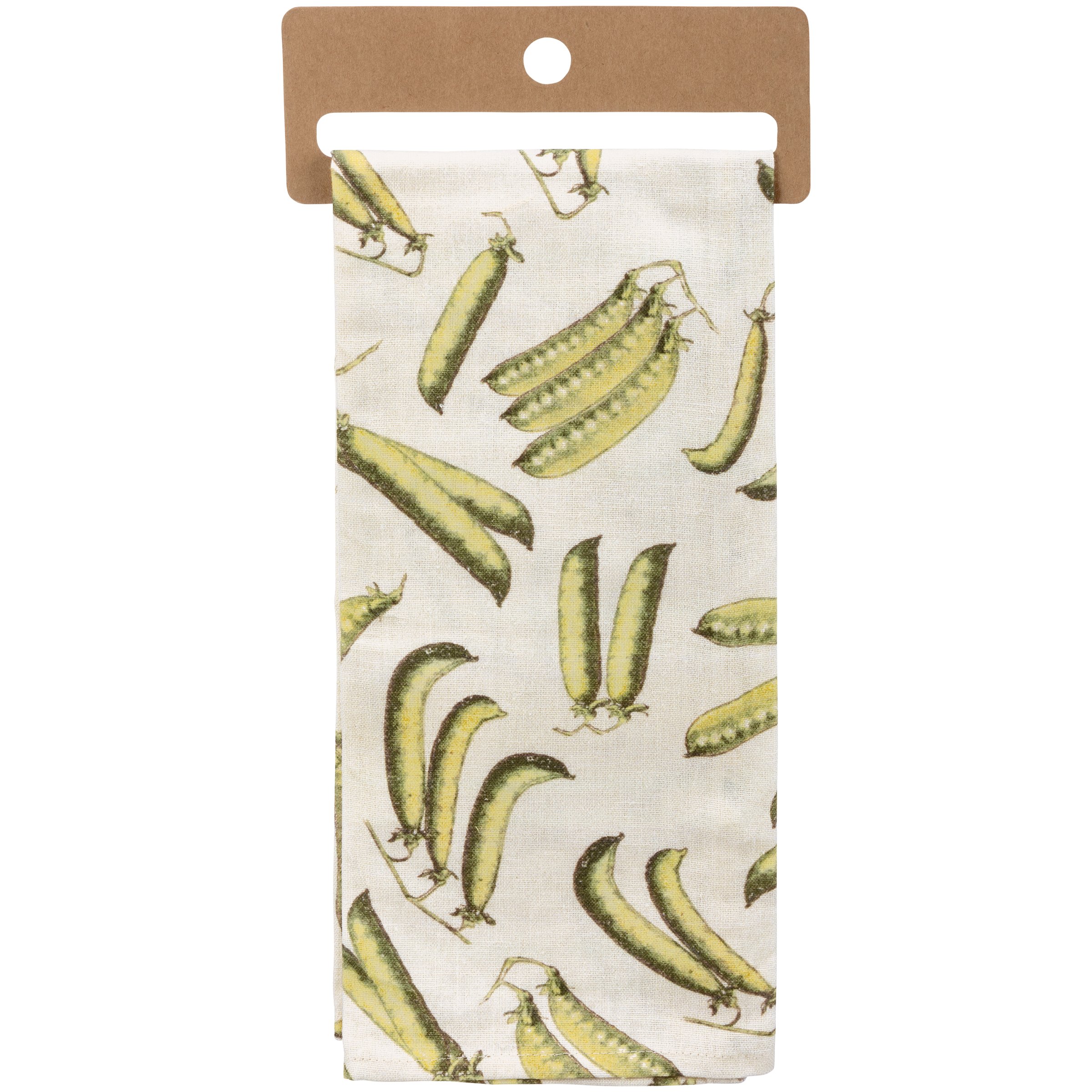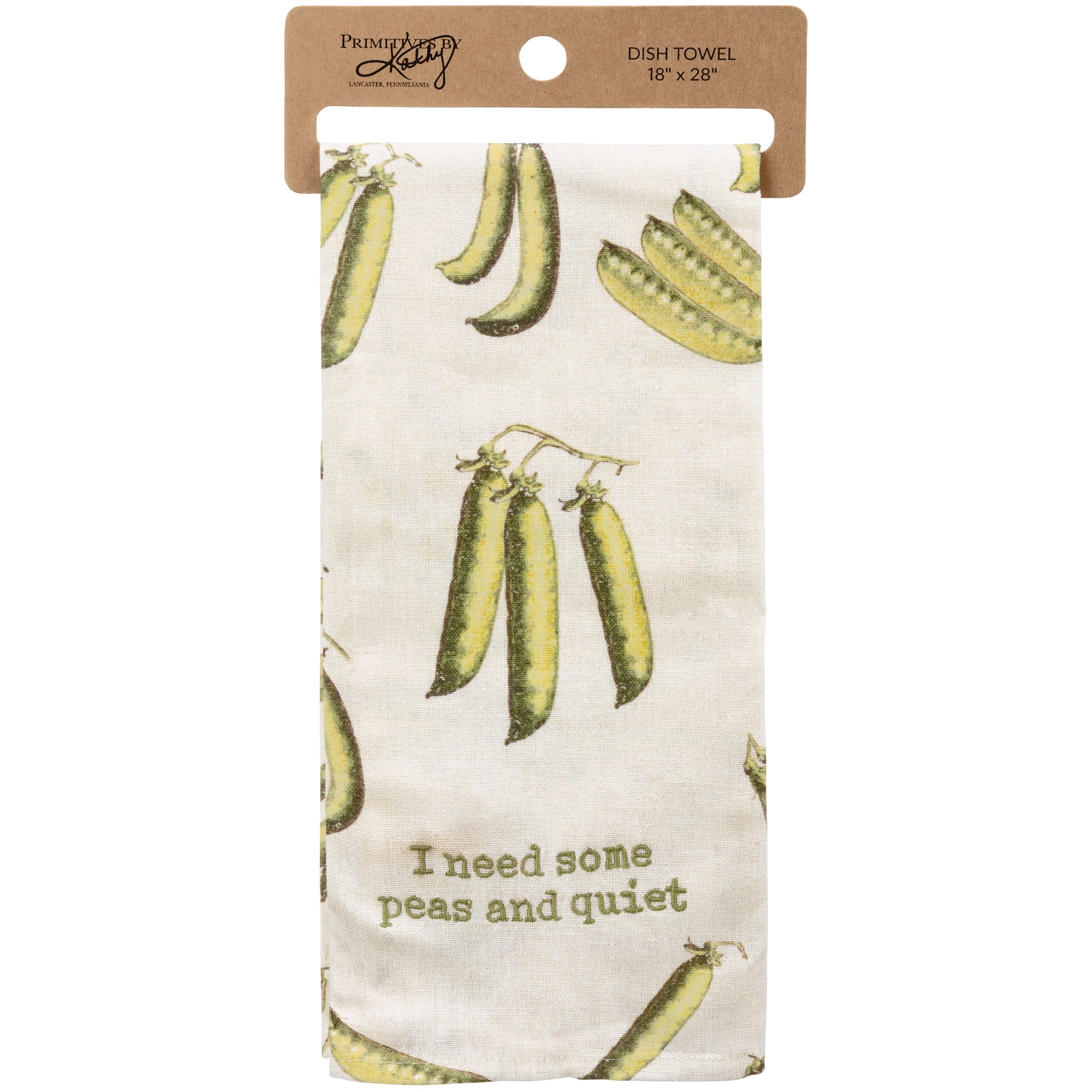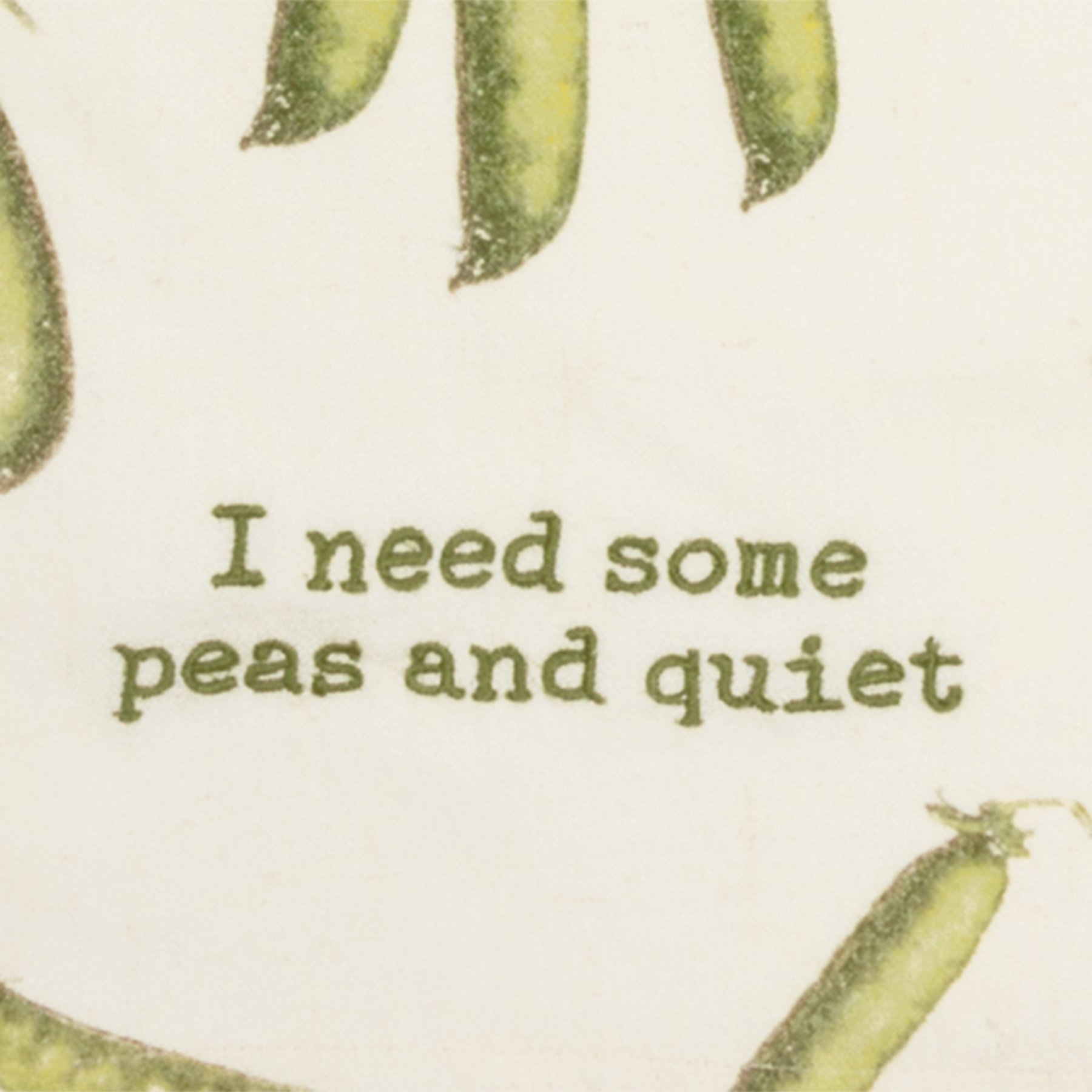 A cotton linen blend kitchen towel featuring all-over retro style pea pod designs and punny embroidered "I Need Some Peas And Quiet" sentiment. Features a cotton tape loop in the corner for easy hanging. Machine-washable. Towel is packaged on a cardboard hanger with a hole to easily hang on rack.