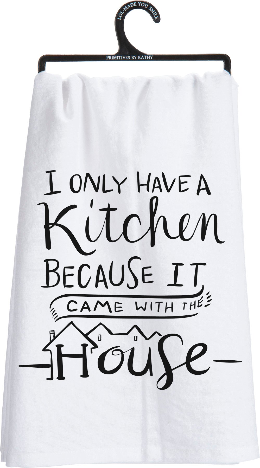A black and white cotton kitchen towel lending a hand lettered "I Only Have A Kitchen Because It Came With The House" sentiment with home design that complements well with existing kitchen decor. Machine-washable.