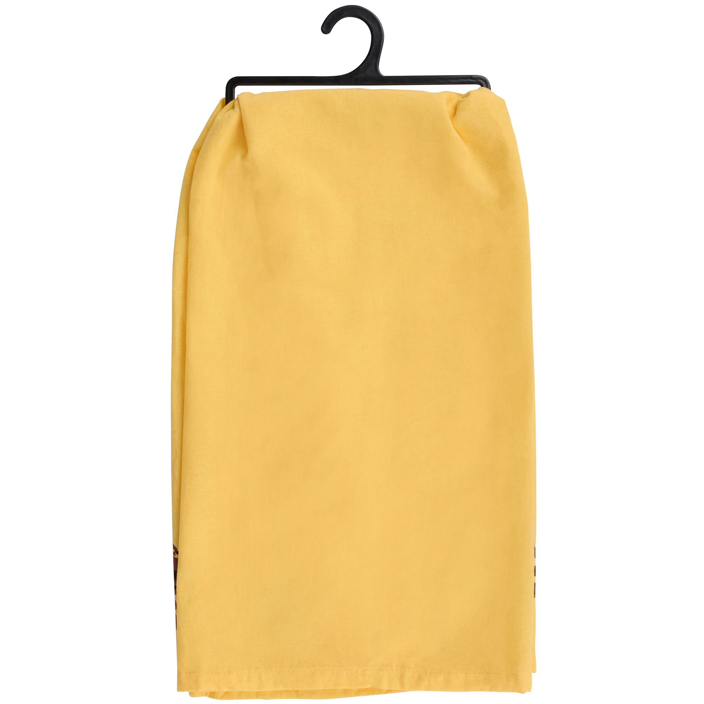 A yellow cotton kitchen towel from our Garden Collection displaying a playful hand illustrated design of vegetables on dirt with a sassy garden-themed sentiment that reads "I Planted Some Vegetables And They Actually Grew! So There's Another Freakin' Thing I've Got To Deal With." Our I Planted Some Vegetables kitchen towel is conveniently machine-washable for easy cleaning. Garden kitchen towel is packaged on a black plastic hanger to easily display on rack. A fun garden-themed gift perfect for adding personality to any kitchen.