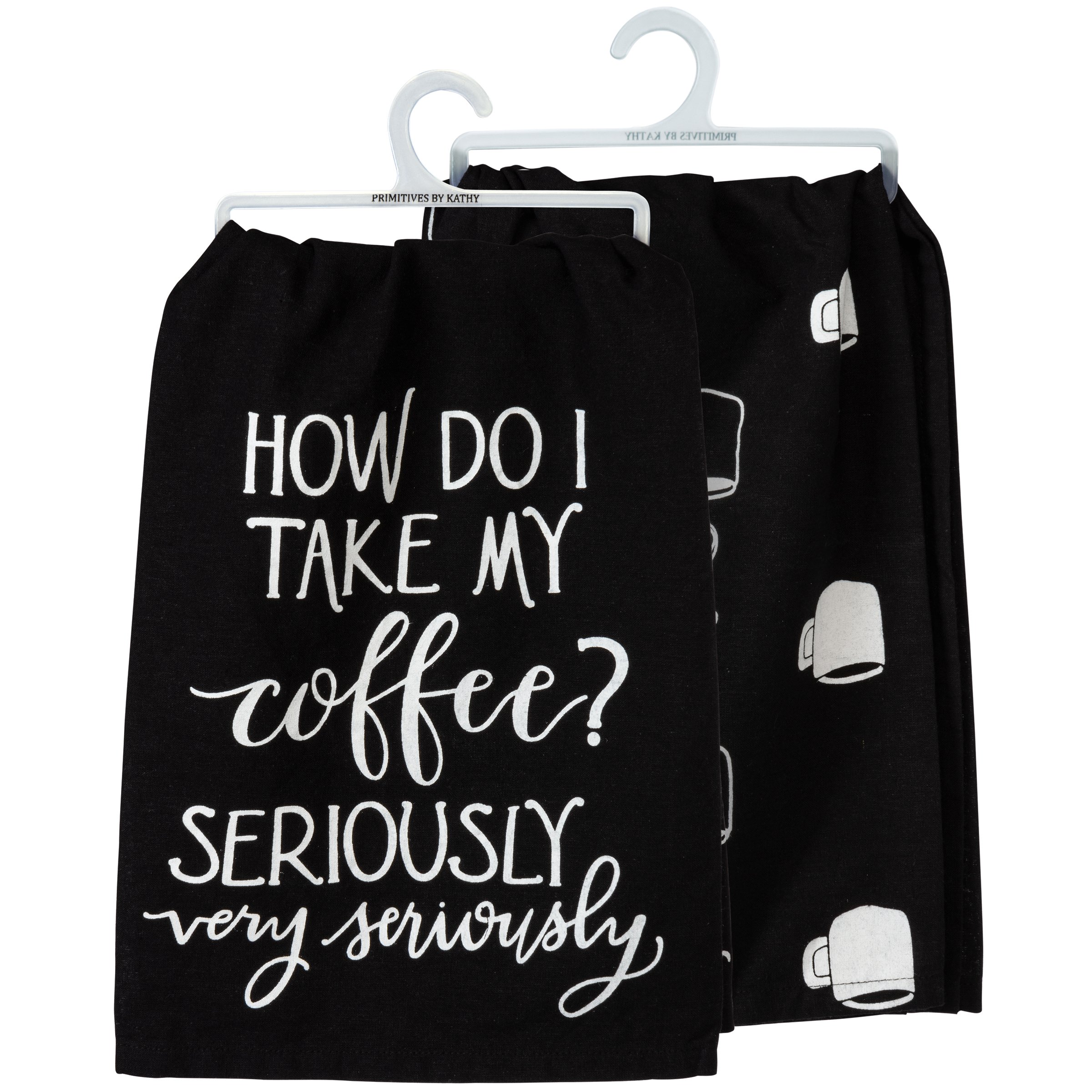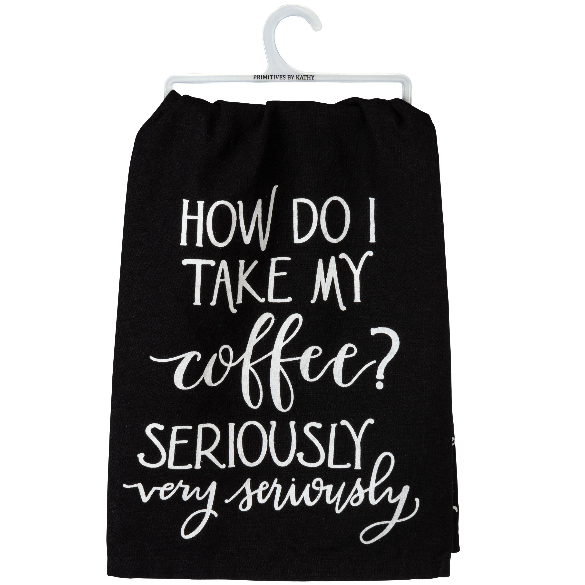 A black cotton kitchen towel featuring a hand lettered "How Do I Take My Coffee? Seriously Very Seriously" sentiment and coffee cup design. All-over print design. Machine-washable.