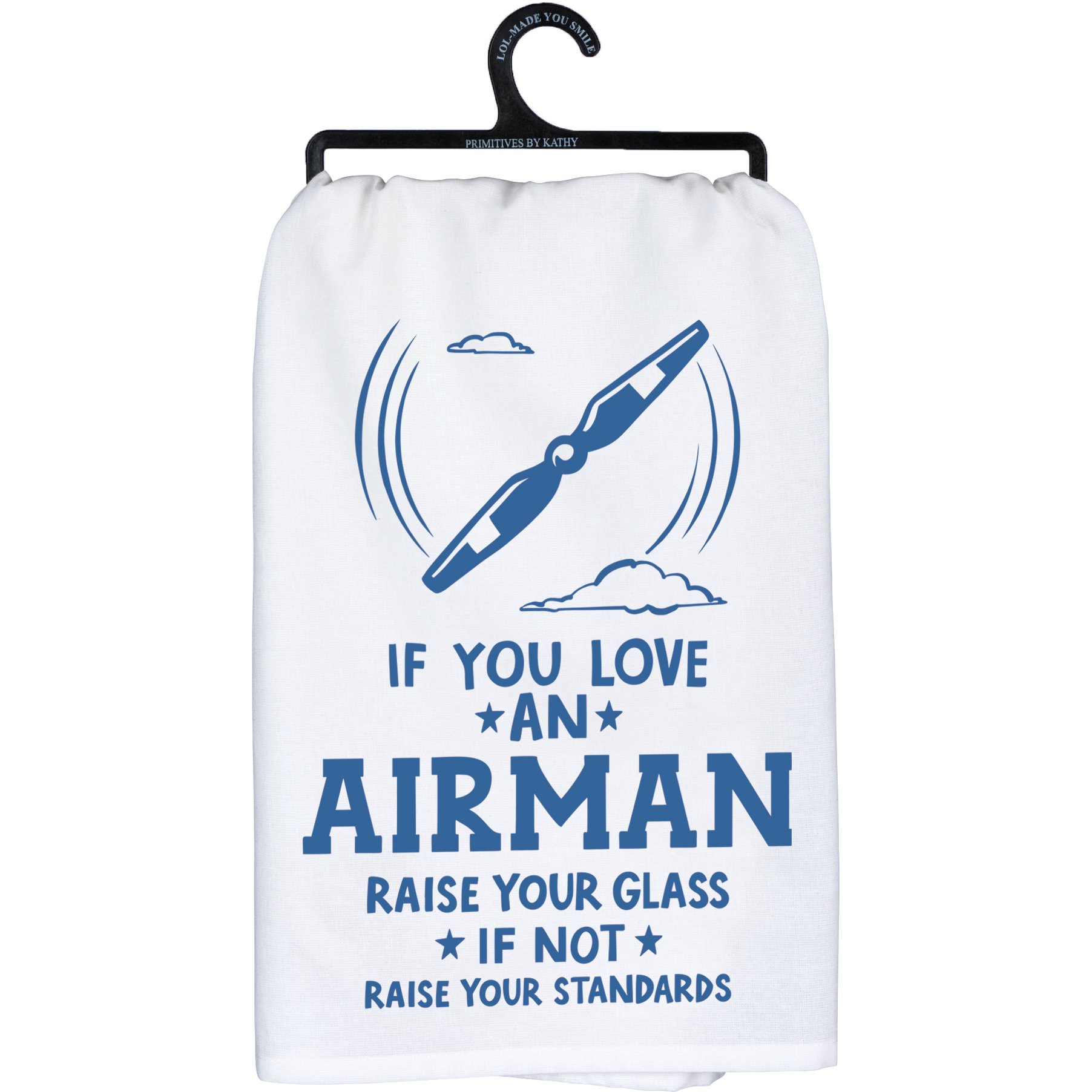 A cotton kitchen towel with red lettering and an "If You Love An Airman Raise Your Glass If Not Raise Your Standards" sentiment and a plane propeller illustration. Machine-washable. Fisher House provides free, temporary housing to aid military families while their loved ones undergo medical treatment at military and VA medical centers. In addition to housing, the foundation offers continued support of family members with programs that offer academic scholarships, help with transportation, and more. For more information about this cause, please visit fisherhouse.org. A portion of the proceeds from the sale of this item will be donated to Fisher House.