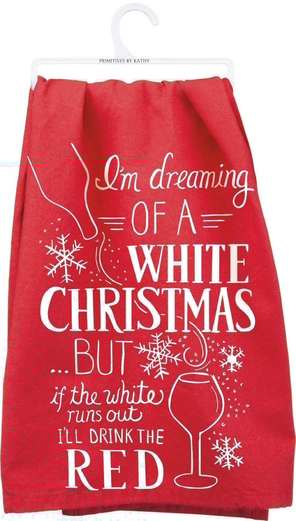 A red and white cotton kitchen towel featuring a festive "I'm Dreaming Of A White Christmas… But If The White Runs Out I'll Drink The Red" sentiment with wine glass, bottle, and snowflake designs. Complements well with existing decor. Machine-washable.