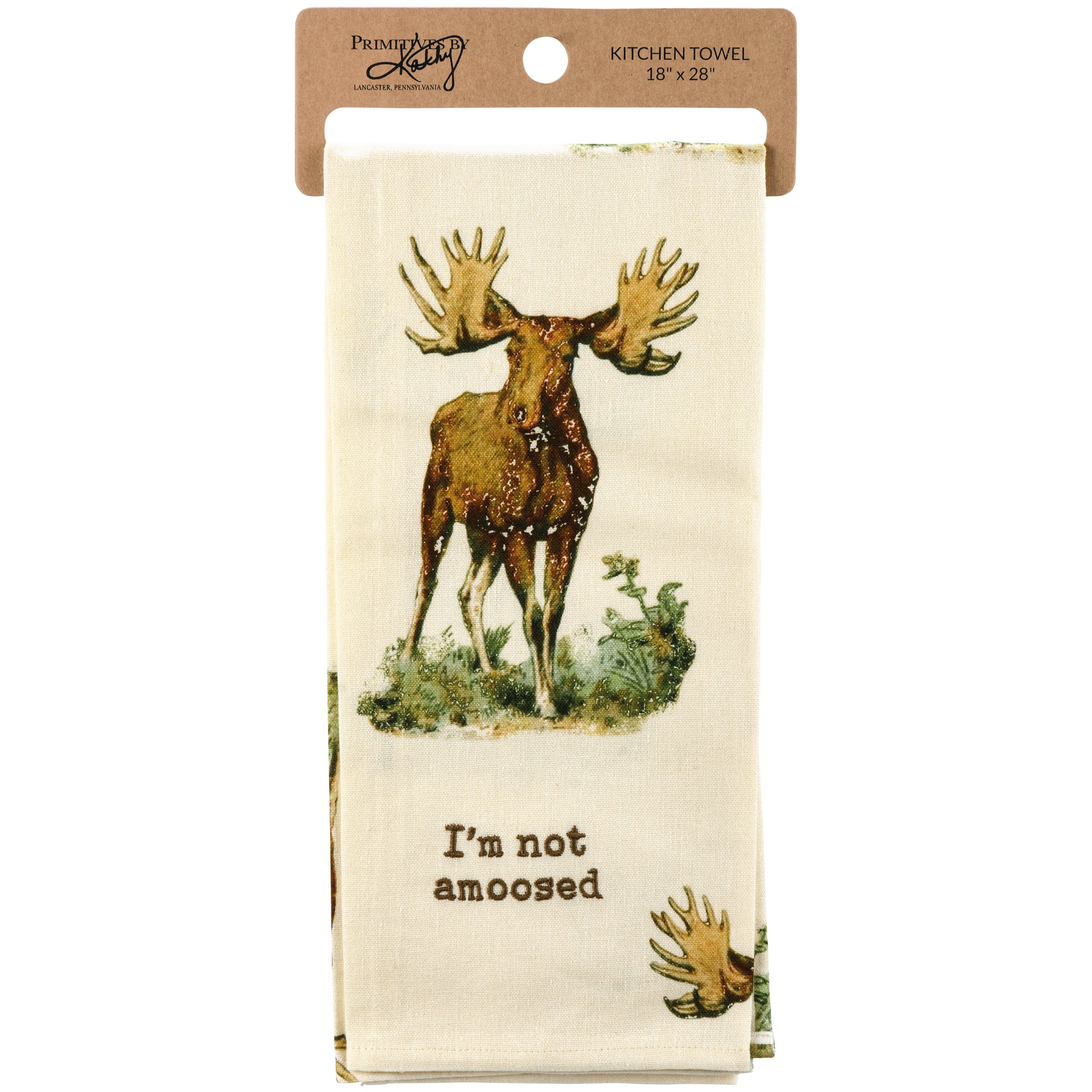 A cotton linen blend kitchen towel featuring all-over vintage moose designs and punny embroidered "I'm Not Amoosed" sentiment. Our I'm Not Amoosed kitchen towel is machine-washable. Towel is packaged on a cardboard hanger with a hole to easily display on rack.
