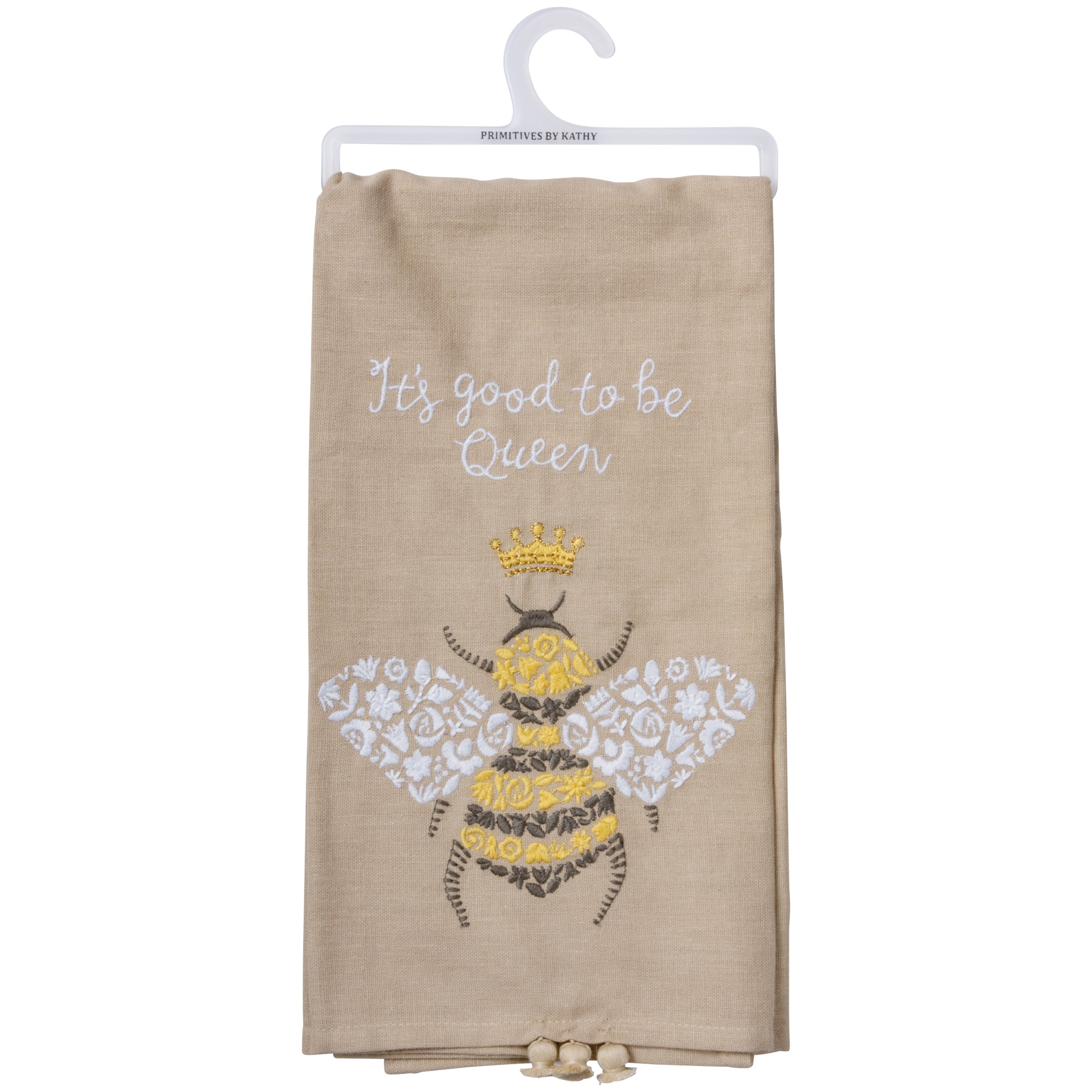 A cotton linen blend kitchen towel featuring an embroidered queen bee design and "It's Good To Be Queen" sentiment. Features decorative tassel accents for added interest. Machine-washable.