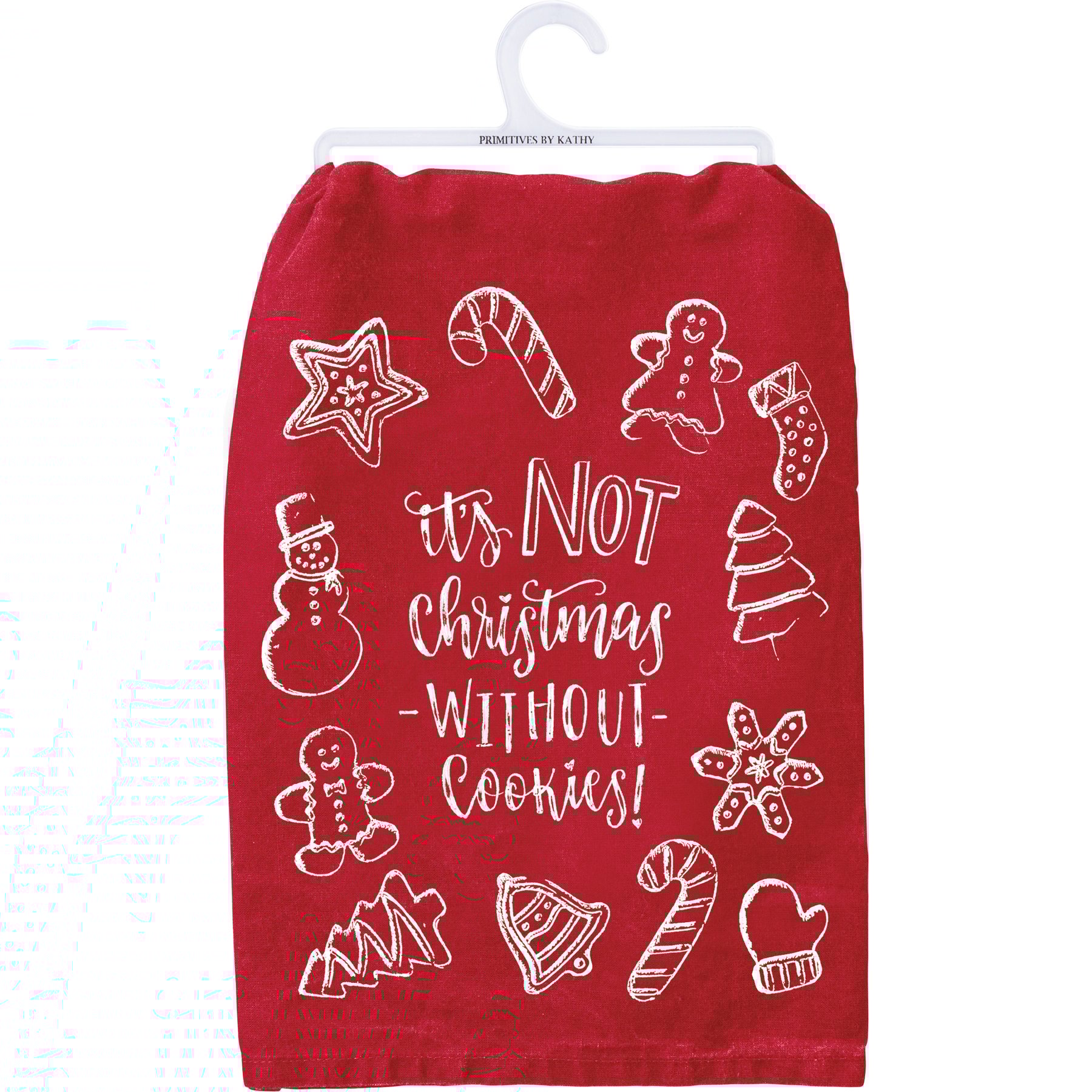 A red cotton kitchen towel featuring a hand lettered "It's Not Christmas Without Cookies!" sentiment and Christmas cookie designs. Machine-washable.