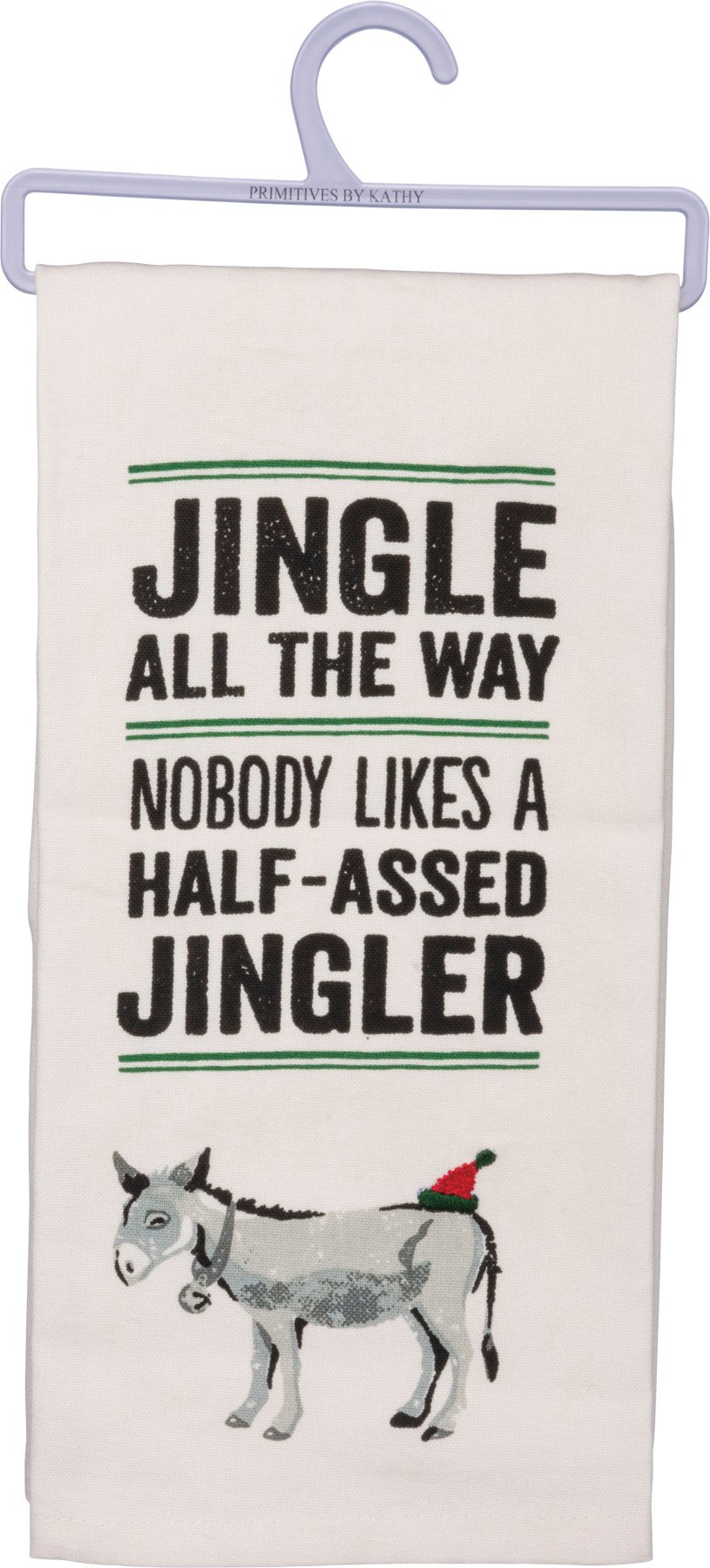 A cotton kitchen towel for fall featuring a distressed "Jingle All The Way - Nobody Likes A Half-Assed Jingler" sentiment, screen printed donkey design, and stitched details. Machine-washable.