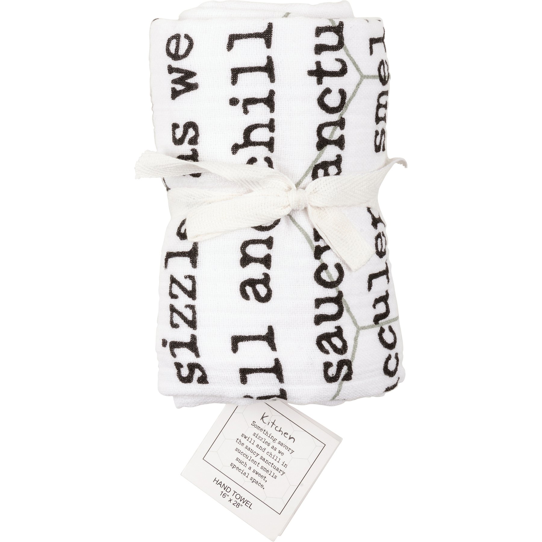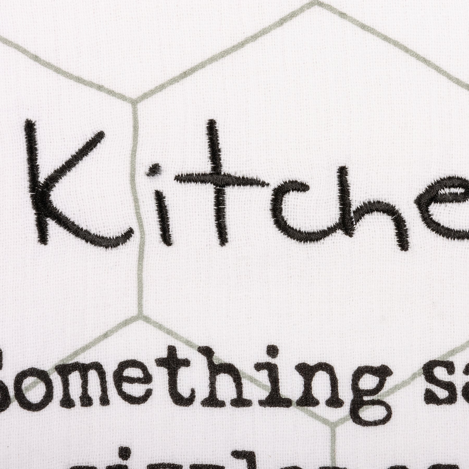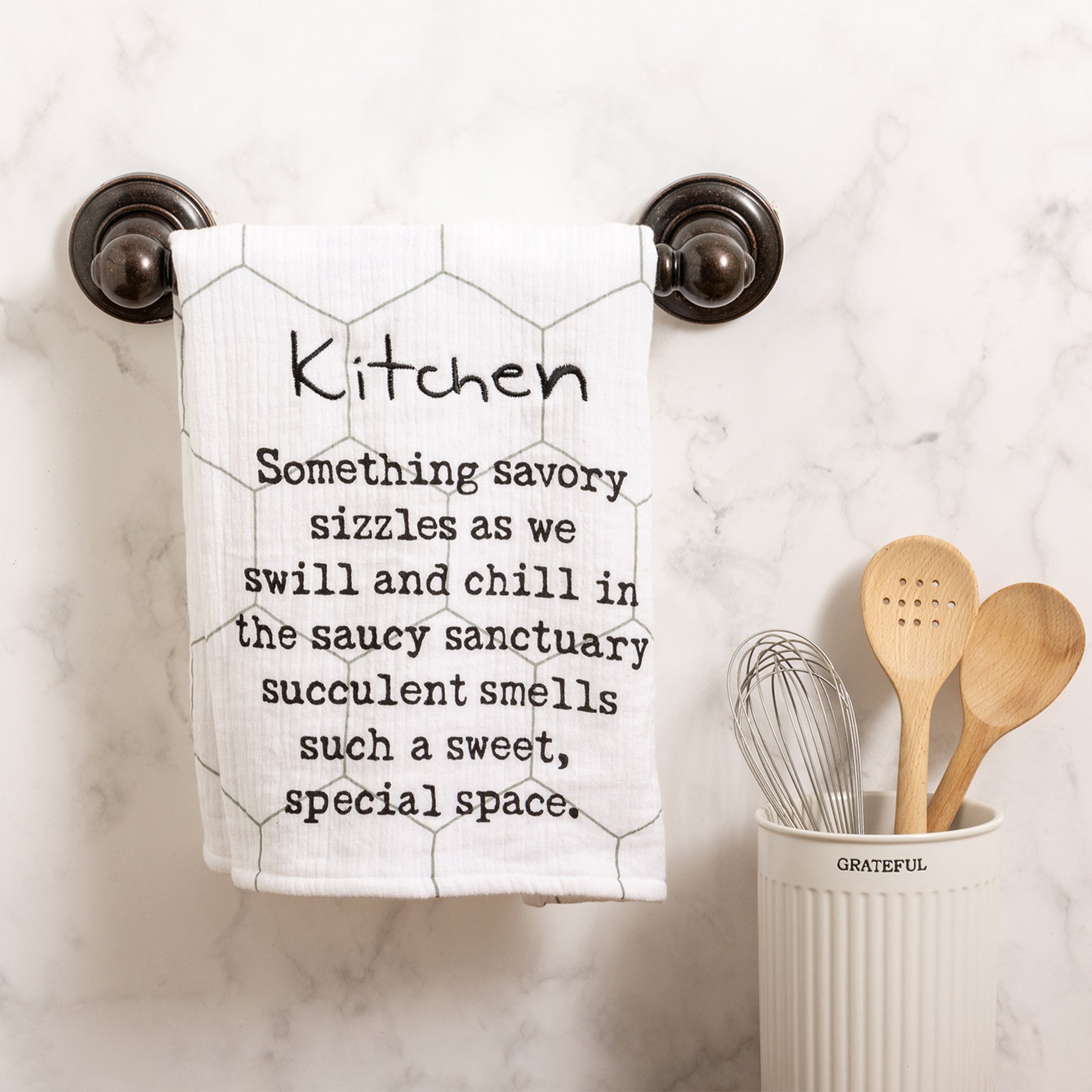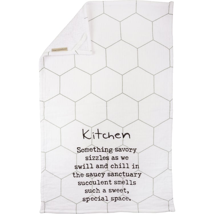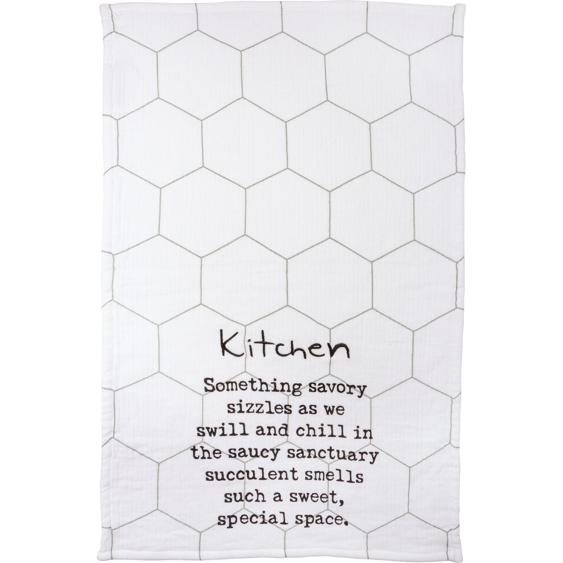 A cotton kitchen towel from our Room By Room Collection features an all-over tile design with embroidered "Kitchen" sentiment followed by a themed poem. Includes absorbent terry bottom layer. Our Kitchen towel is machine-washable.