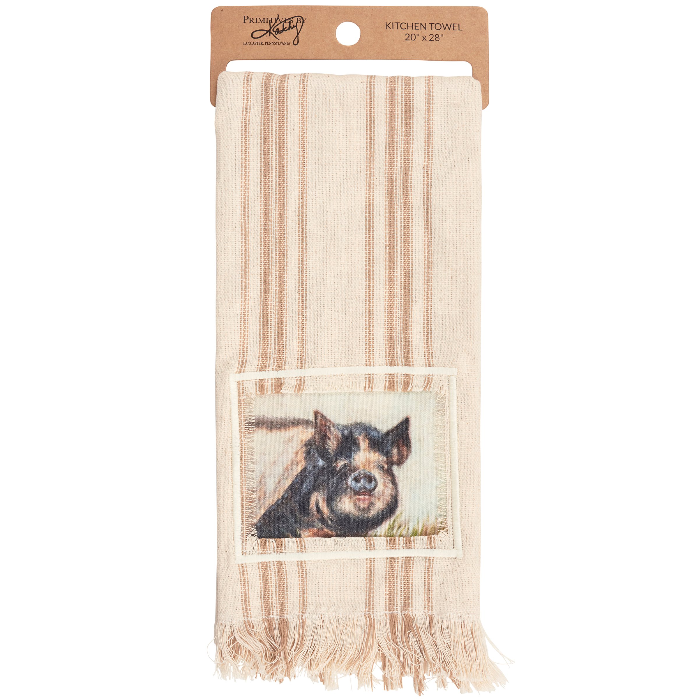 A cream cotton kitchen towel from our Farmhouse Collection featuring a stitched art panel with frayed border and woven brown stripes throughout. Design displays a kune kune pig in a field replicated from original artwork painted onto burlap canvas, giving the art a unique depth and texture. Our Kune Kune Pig kitchen towel is machine-washable for convenient cleaning. Packaged on a cardboard hanger with hole to easily display on rack. A rustic kitchen accessory perfect for everyday use.