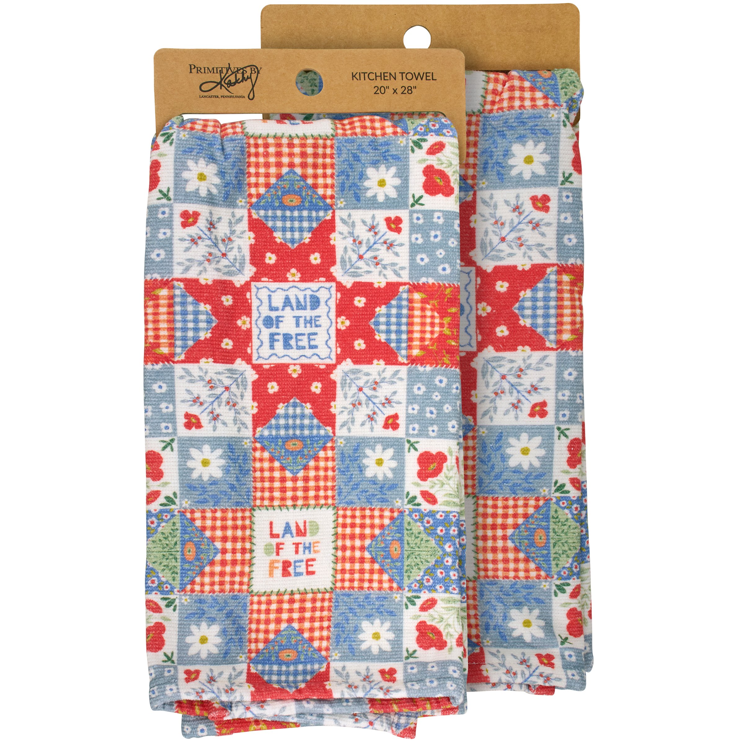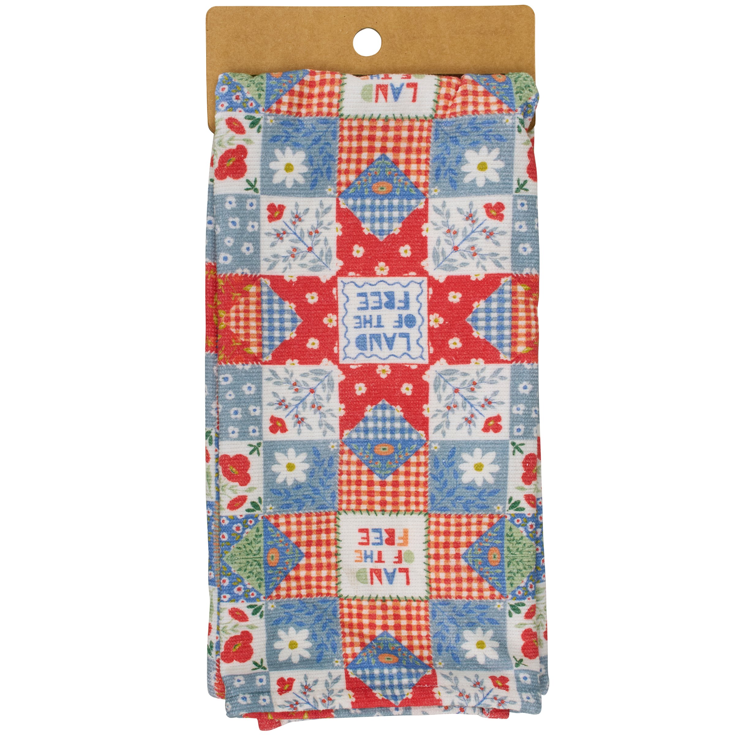 A cotton kitchen towel from our Patriotic Collection featuring an all-over design displaying a pattern of folk art inspired quilt block designs with a patriotic color palette and sentiment that reads "Land Of The Free." This patriotic kitchen towel features a terrycloth layer on the back for added absorbency. Our Land Of The Free kitchen towel is conveniently machine-washable for easy cleaning. Kitchen towel is packaged on a cardboard hanger with hole to easily display on rack. A patriotic kitchen accessory perfect for 4th of July and Memorial Day decorating or celebrating stars and stripes all year round.