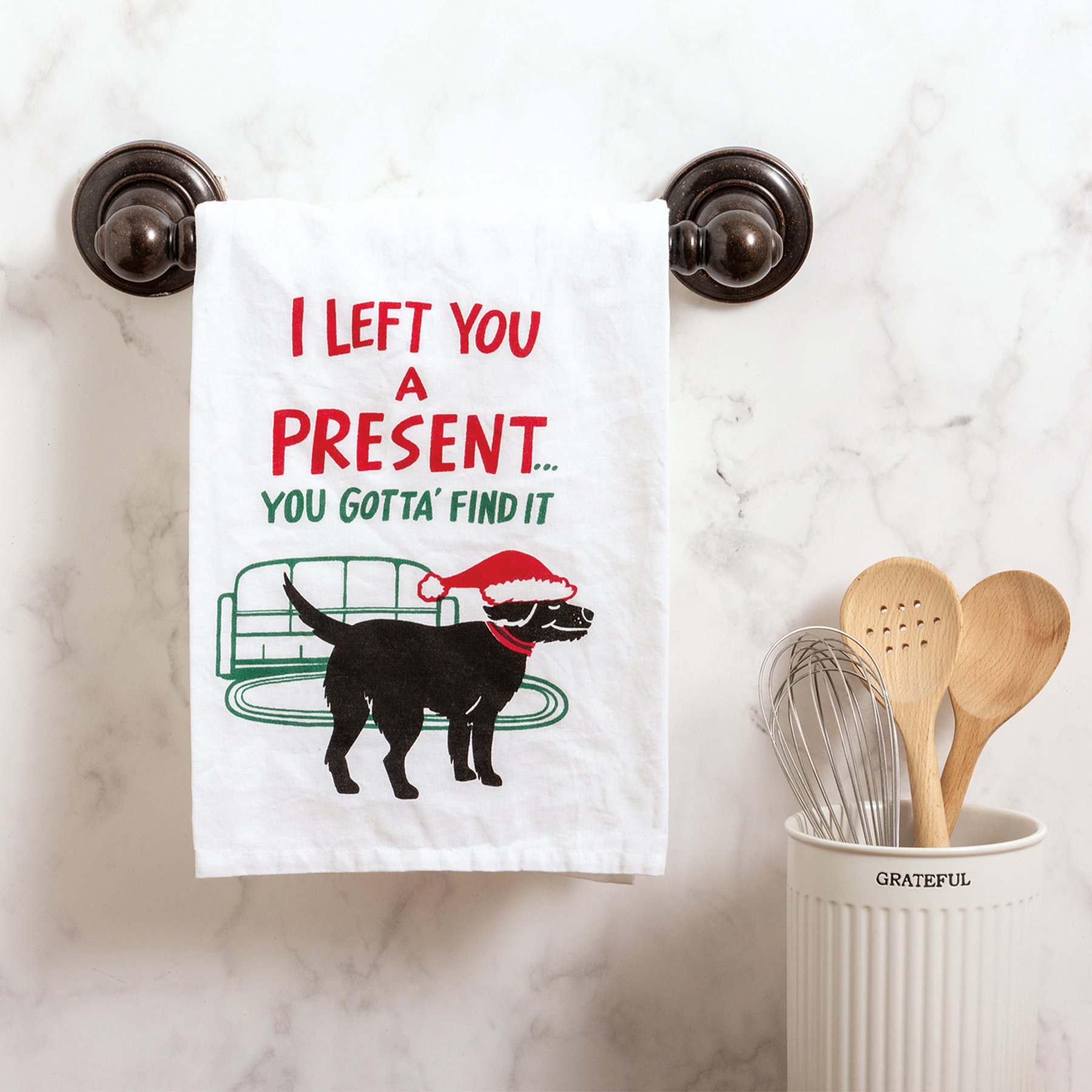 A white cotton kitchen towel displaying unique hand illustrated designs of a dog wearing a Santa hat in a living room with red and green accents under a fun pet inspired seasonal sentiment that reads "I Left You A Present... You Gotta Find It." Our Dog Left You A Present kitchen towel is conveniently machine-washable for easy cleaning. Funny kitchen towel is packaged on a black plastic hanger to easily display on rack. A fun pet-themed kitchen accessory perfect for seasonal use.