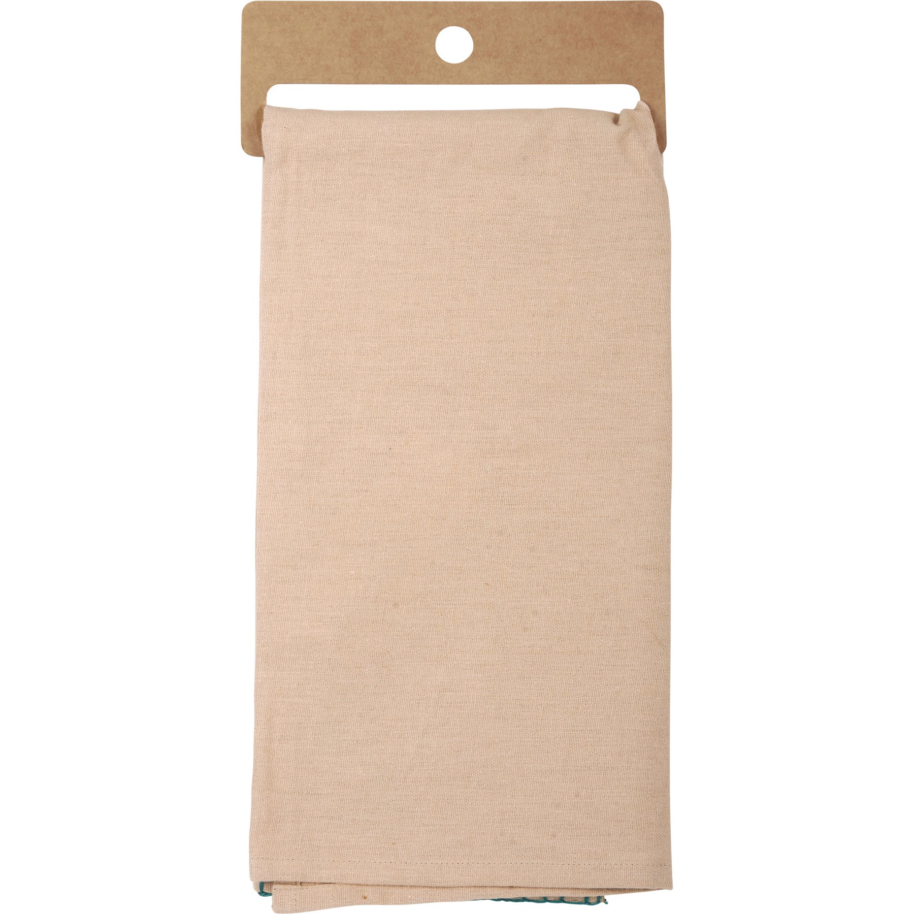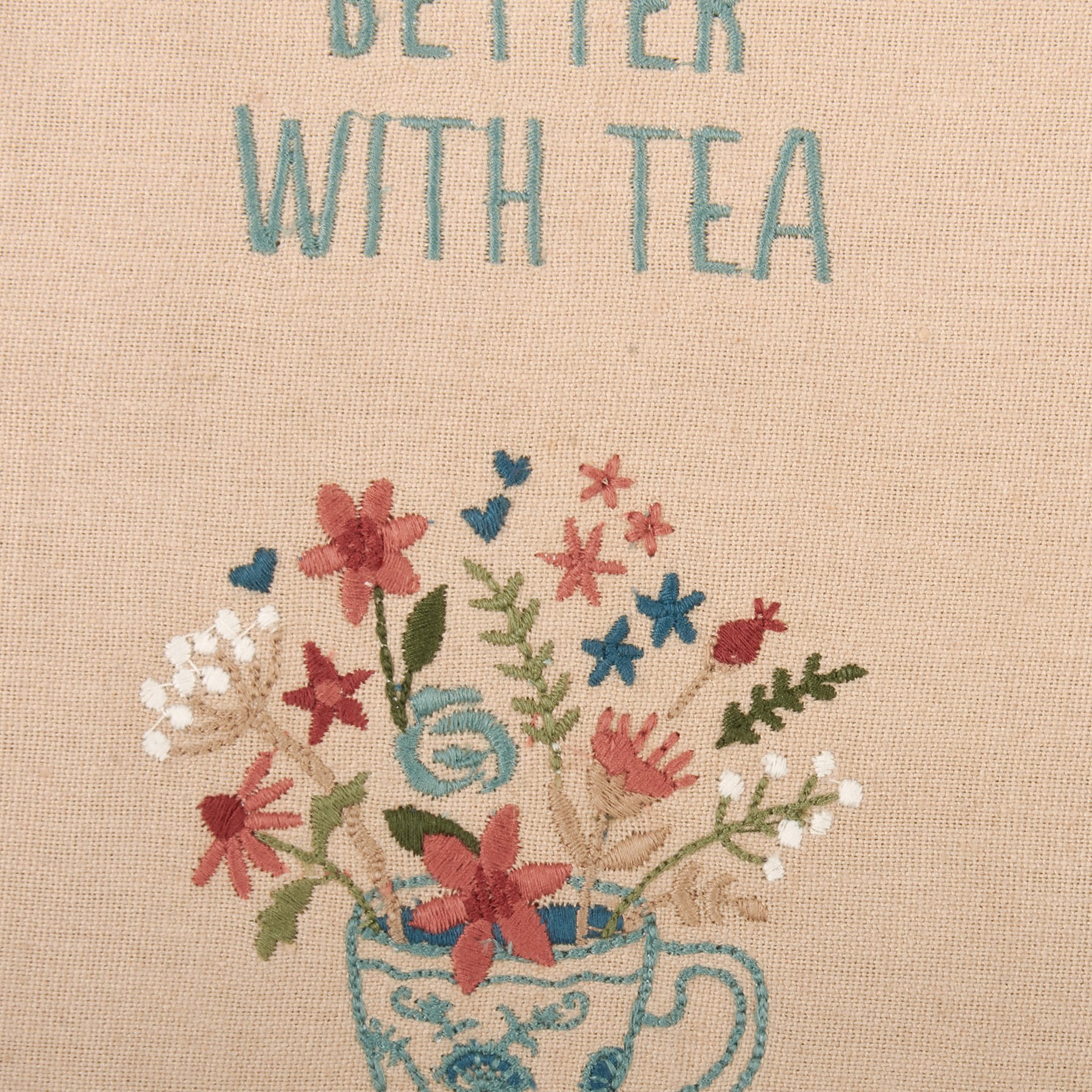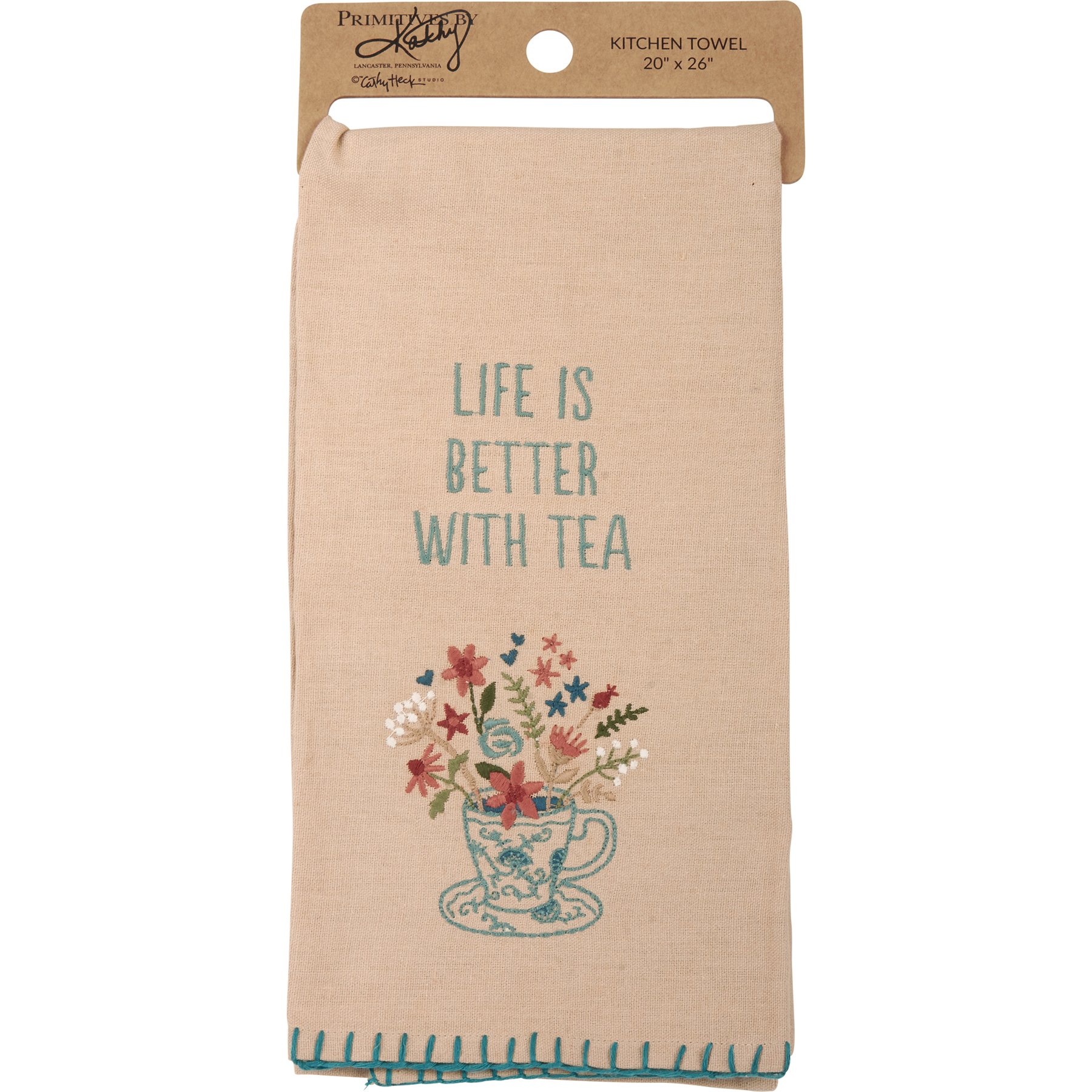 A cotton-linen blend kitchen towel from our Cottagecore Collection displaying a design of flowers inside a teacup with fun "Life Is Better With Tea" sentiment. Design and sentiment are embroidered for added texture. Packaged on a cardboard hanger with hole to easily hang on rack. The Better With Tea kitchen towel is machine-washable.