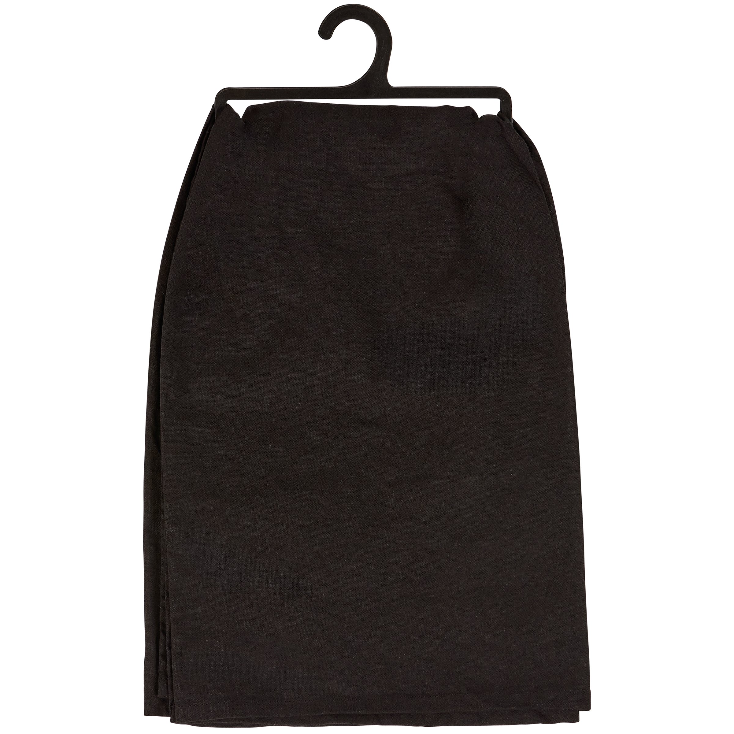 A black cotton kitchen towel from our Halloween Collection displaying a unique hand illustrated design of a sugar skull with a fun Halloween inspired sentiment that reads "Live Laugh Lobotomy." Design and sentiment are replicated from original hand illustrated artwork in a fun neon color palette that also looks great in blacklight. Our Live Laugh kitchen towel is conveniently machine-washable for easy cleaning. Seasonal kitchen towel is packaged on a black plastic hanger to easily display on rack. A fun Halloween-themed kitchen accessory perfect for seasonal use.