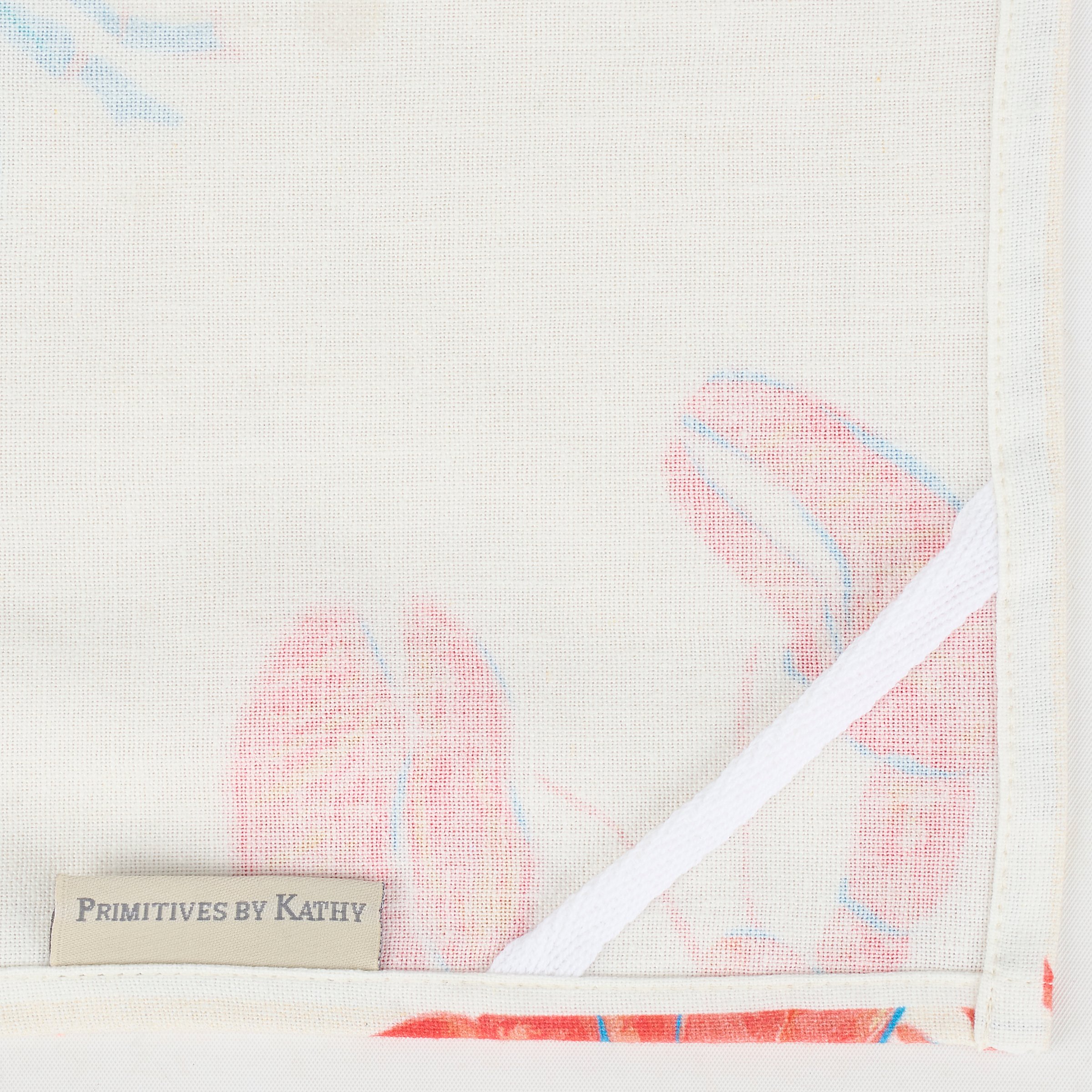 A cotton-linen blend kitchen towel from our Beach Collection featuring an all-over design displaying hand illustrations of lobsters inspired by Italian Coastal style with yellow rickrack accents along the bottom of the towel. Our Lobsters kitchen towel is conveniently machine-washable for easy cleaning. Coastal kitchen towel is packaged on a cardboard hanger with hole to easily display on rack. A beach themed kitchen accessory perfect for everyday use.