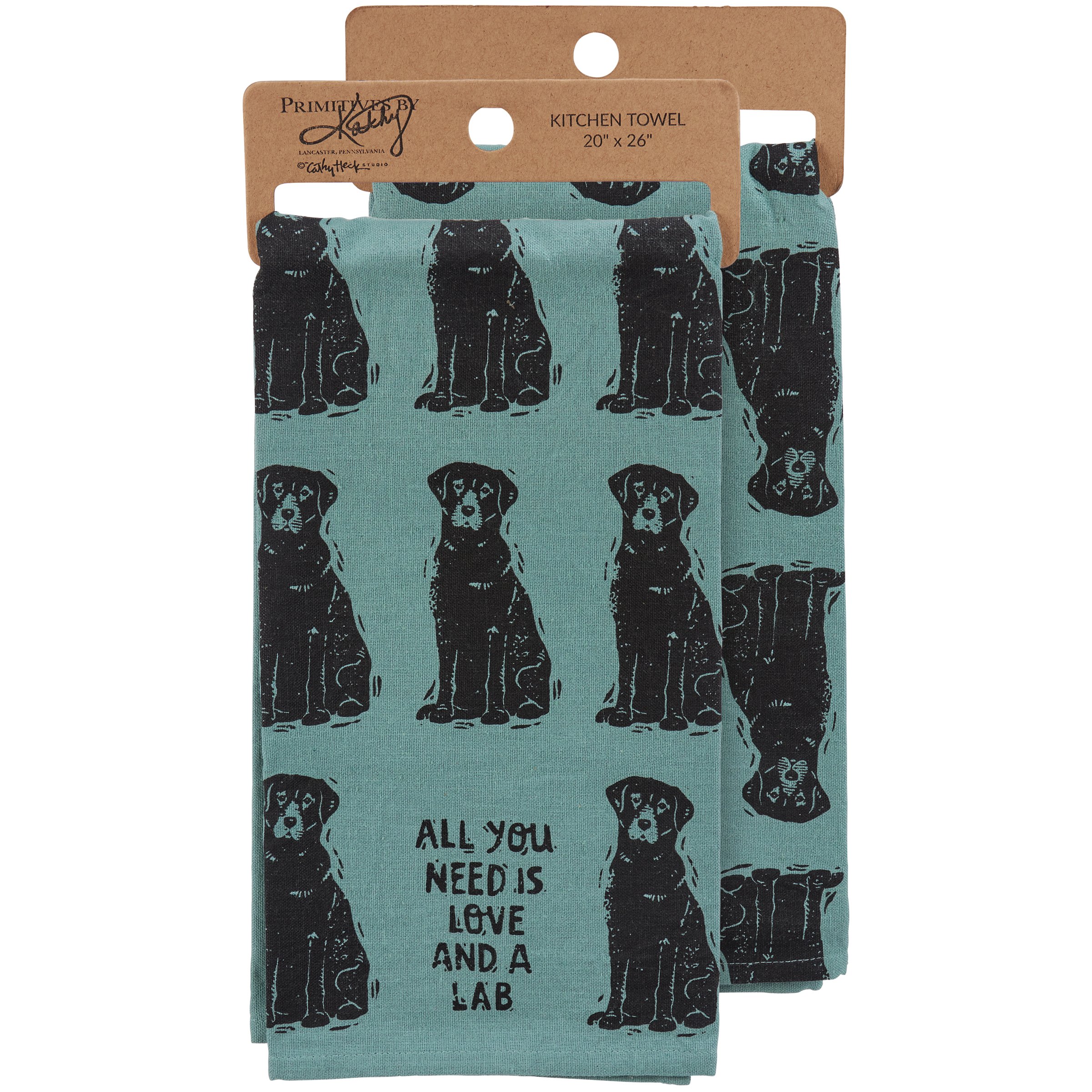 A blue cotton kitchen towel from our Pet Collection displaying unique designs of labradors all-over the towel with a fun pet inspired sentiment that reads "All You Need Is Love And A Lab." Labrador designs are replicated from block print style art. Our Labrador kitchen towel is conveniently machine-washable for easy cleaning. Labrador towel is packaged on a cardboard hanger to easily display on rack. A fun pet-themed kitchen accessory perfect for everyday use.