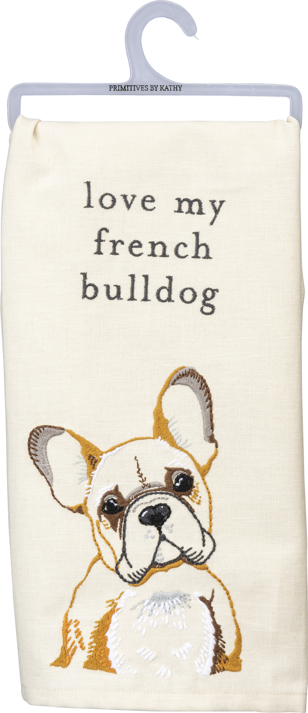 A cotton-linen blend kitchen towel from our Pet Collection displaying a beautifully embroidered design of a french bulldog and coordinating sentiment that reads "Love My French Bulldog." Our Love My French Bulldog kitchen towel is conveniently machine-washable for easy cleaning. Bulldog kitchen towel is packaged on a clear plastic hanger to easily display on rack. A lovely pet-themed kitchen accessory perfect for everyday use.