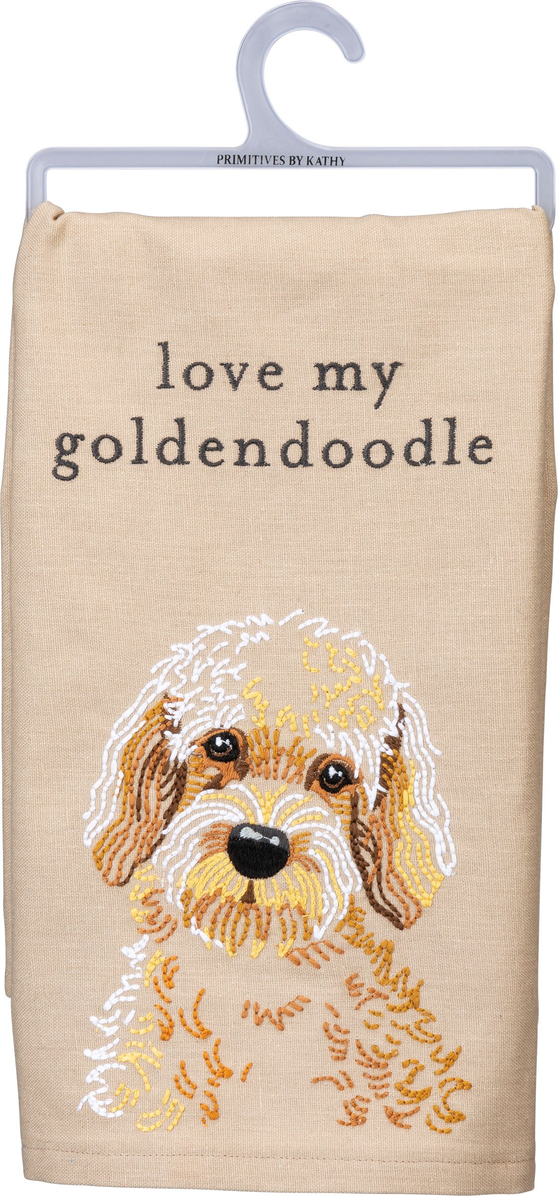 A cotton-linen blend kitchen towel from our Pet Collection displaying a beautifully embroidered design of a goldendoodle and coordinating sentiment that reads "Love My Goldendoodle." Our Love My Goldendoodle kitchen towel is conveniently machine-washable for easy cleaning. Goldendoodle kitchen towel is packaged on a clear plastic hanger to easily display on rack. A lovely pet-themed kitchen accessory perfect for everyday use.
