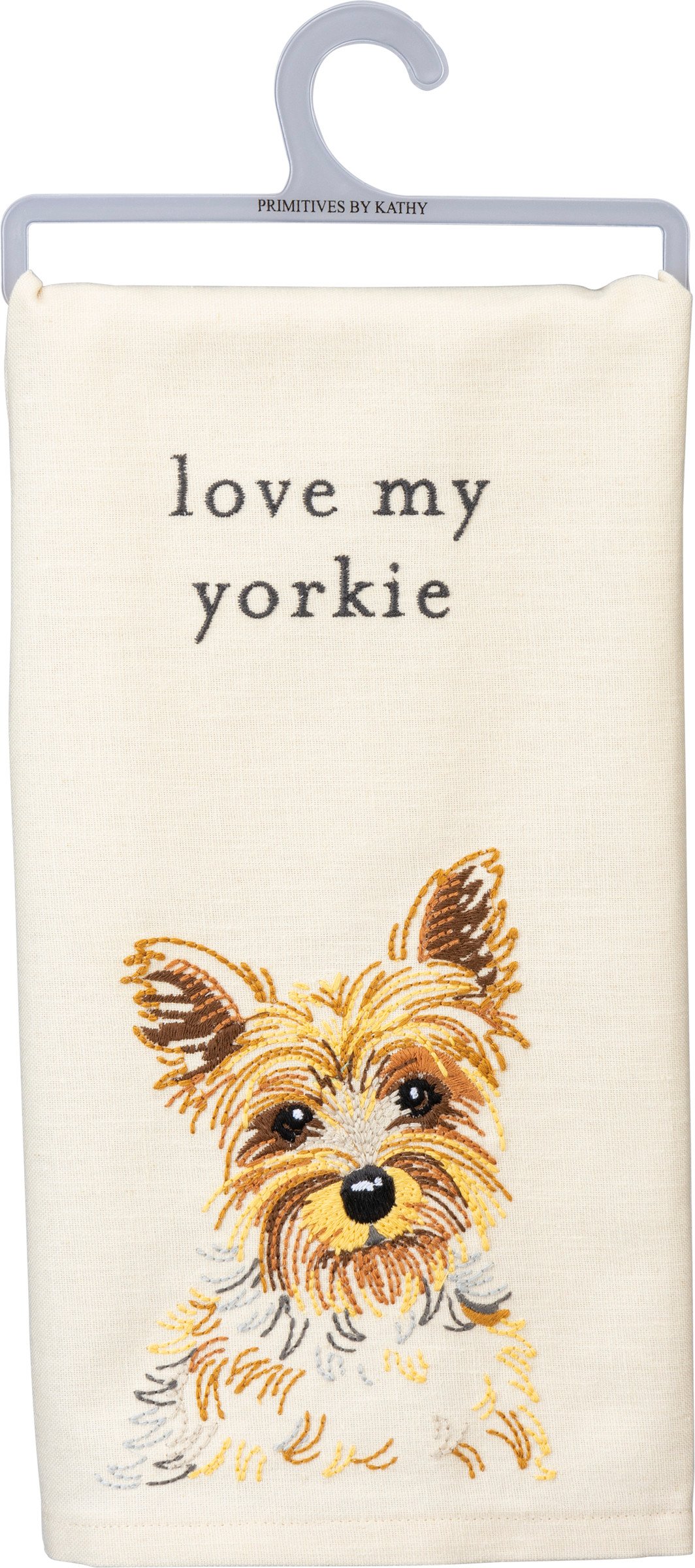 A cotton-linen blend kitchen towel from our Pet Collection displaying a beautifully embroidered design of a yorkie and coordinating sentiment that reads "Love My Yorkie." Our Love My Yorkie kitchen towel is conveniently machine-washable for easy cleaning. Yorkie kitchen towel is packaged on a clear plastic hanger to easily display on rack. A lovely pet-themed kitchen accessory perfect for everyday use.