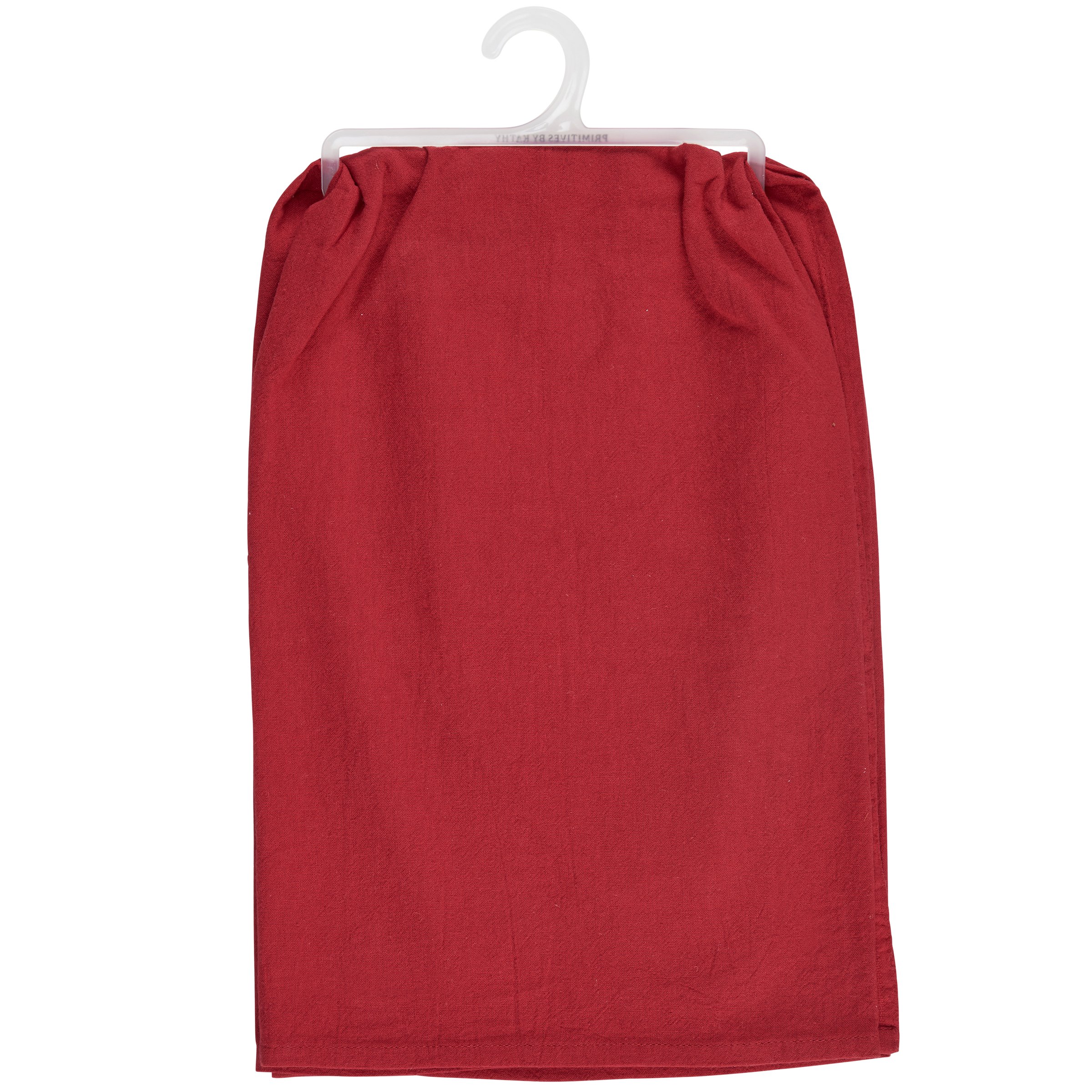 A red cotton kitchen towel from our Valentine's Day Collection displaying a rustic inspired design of a heart and a fun love-themed sentiment that reads "You Are The Love Of My Life - And The Pain In My Ass." Our Love Of My Life kitchen towel is machine-washable for convenient cleaning. Packaged on a clear plastic hanger to easily display on rack. A fun Valentine's Day kitchen accessory perfect for seasonal use or gifting.