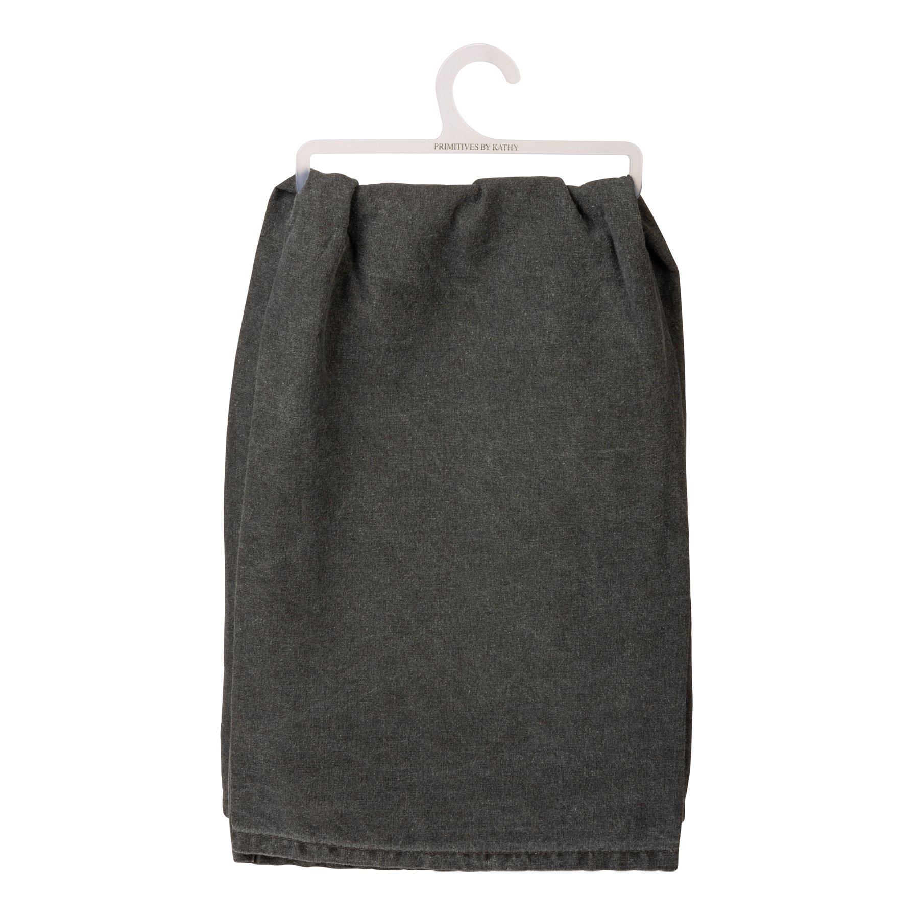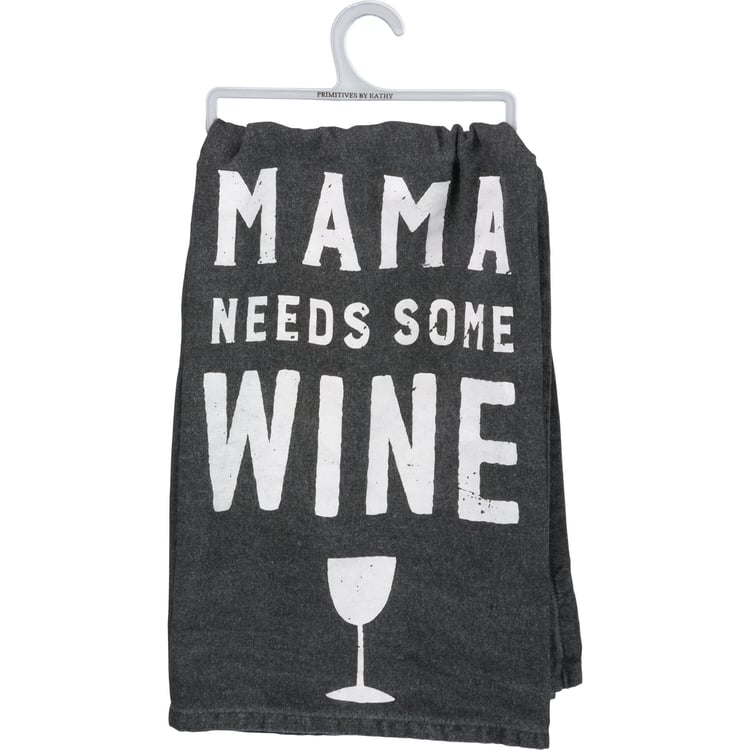 A black cotton kitchen towel lending a white distressed "Mama Needs Some Wine" sentiment with wine glass design that complements well with coordinating design pieces. Machine-washable.
