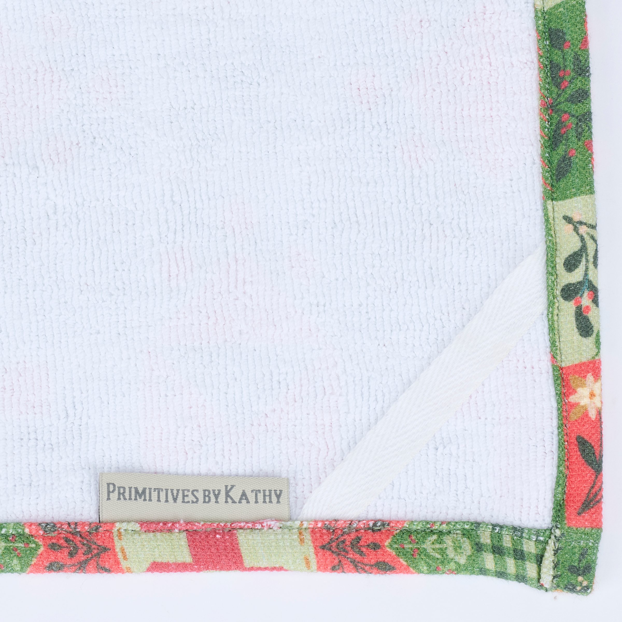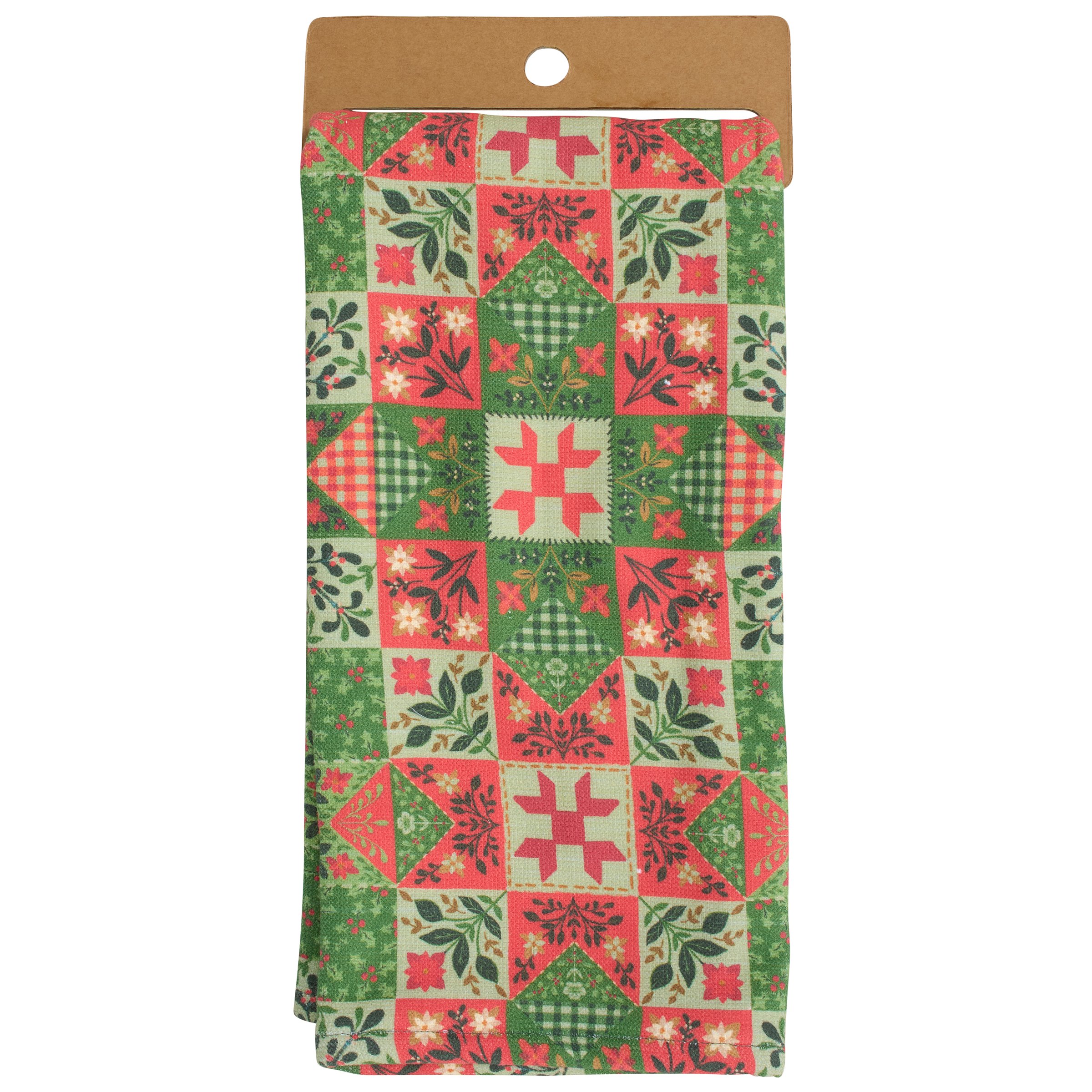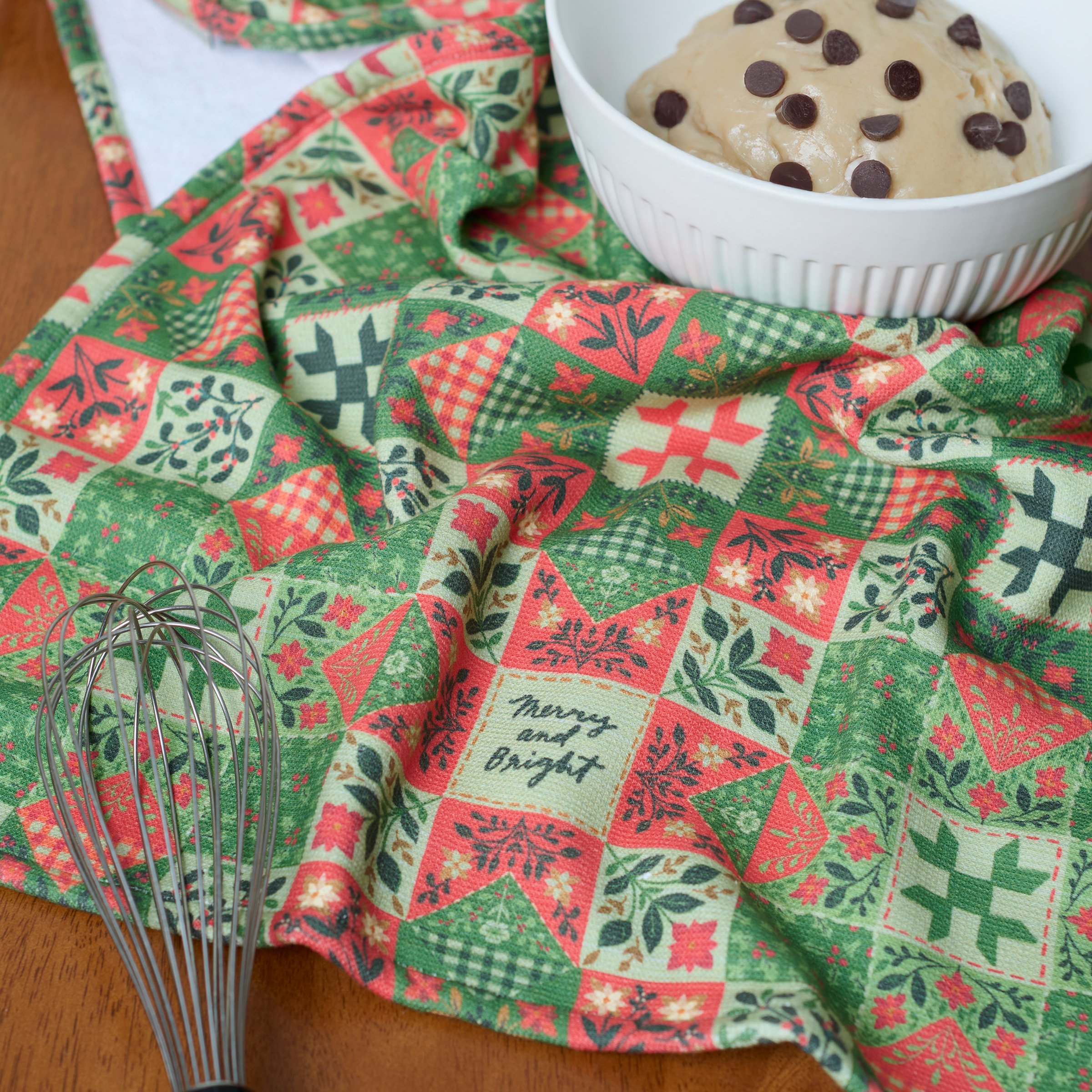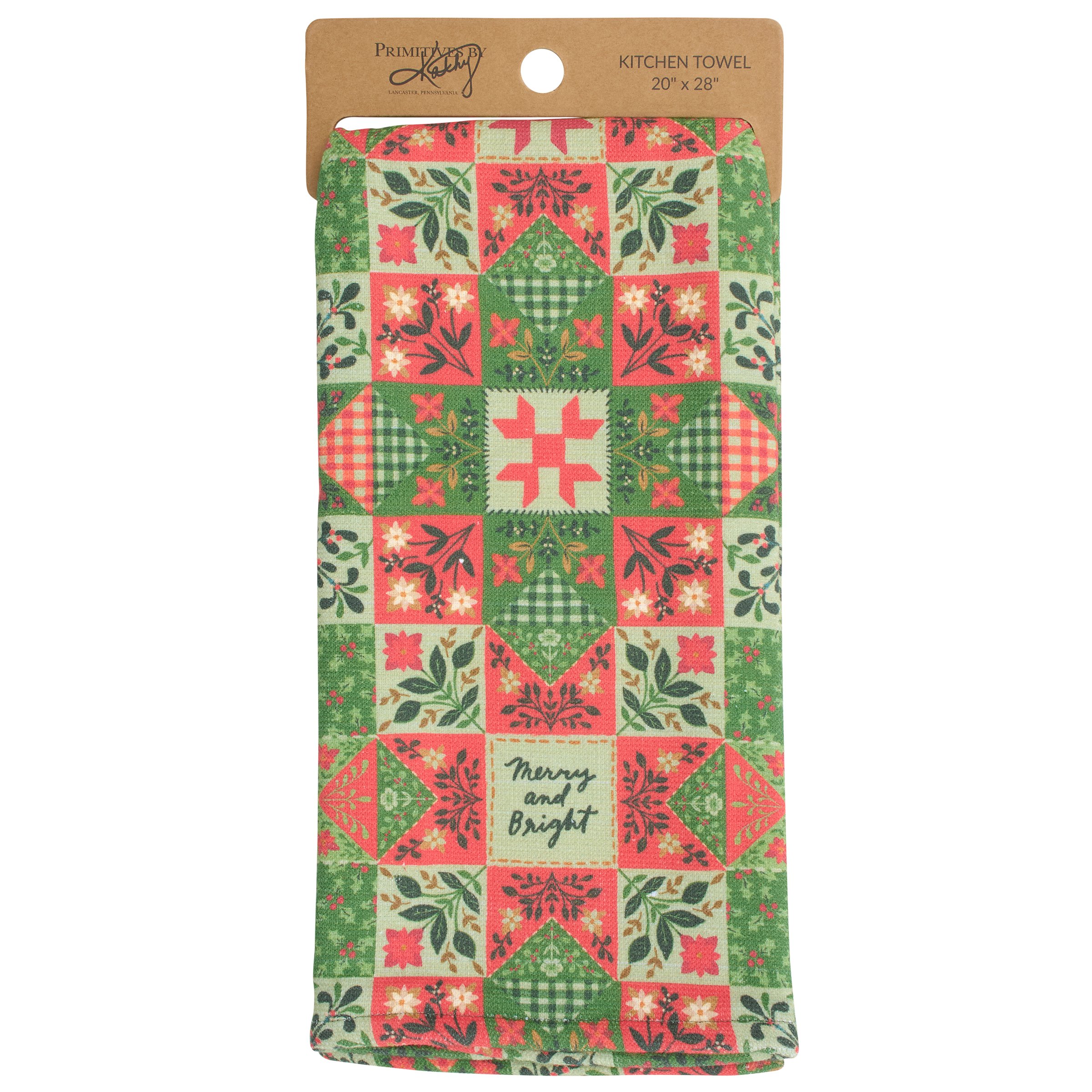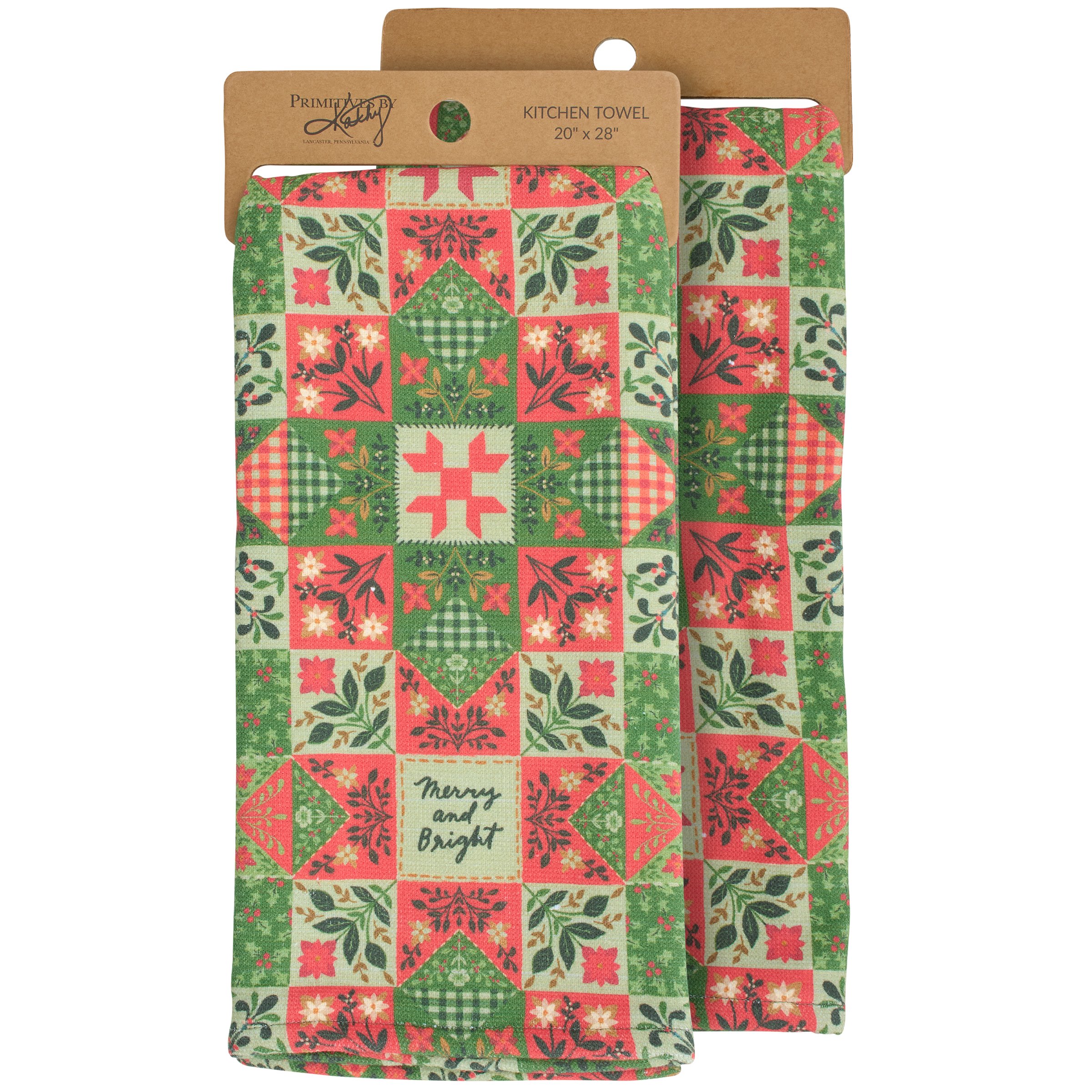 A cotton kitchen towel from our Christmas Collection featuring an all-over design displaying a craft inspired Christmas quilt pattern replicated from original art hand painted in a unique watercolor style. Christmas quilt design also displays a holiday sentiment that reads "Merry And Bright." Premium kitchen towel features a terrycloth layer on the back for added absorbency. Our Merry And Bright kitchen towel is conveniently machine washable for easy cleaning. Seasonal towel is packaged on a cardboard hanger with hole to easily display on rack. A craft themed Christmas kitchen accessory perfect for adding seasonal style to any kitchen.